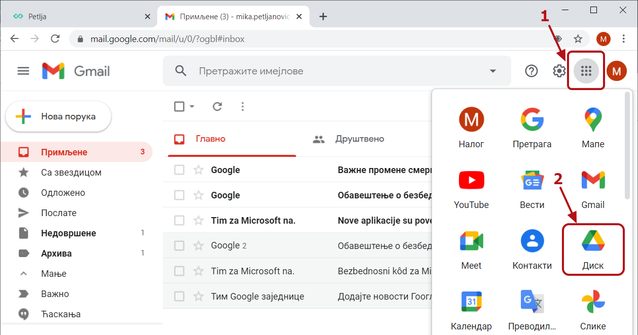 Кад се пријавиш на свој Џимејл, горе десно видећеш иконицу која води ка менију за избор Гугл апликација (1).