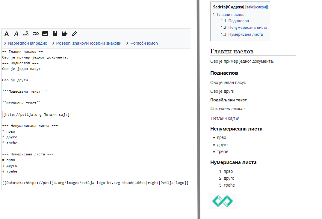 Наш пример израђен у језику Вики-текста изгледа овако: