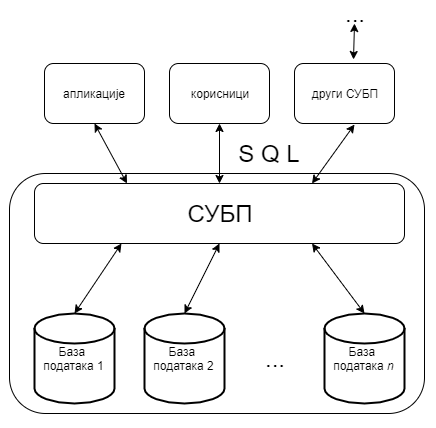 Ти системи својим корисницима пружају све услуге рада са подацима. Корисници СУБП су најчешће други програми тј. апликације (на пример пословне, мобилне или веб-апликације), али и појединци који приступају подацима у облику у коме су подаци записани у бази (на пример, стручњаци за анализу података који у неким случајевима непосредно прегледају и користе податке из базе). Могућ је и сценарио у којима неколико СУБП међусобно комуницирају тј. да један СУБП приступа подацима из другог СУБП.