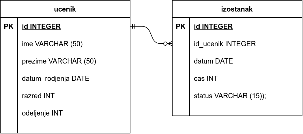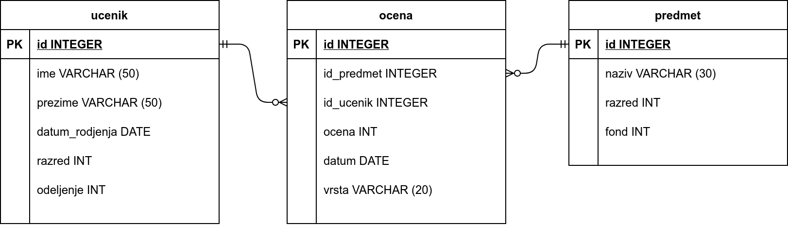 идентификатор сваке оцене, док су колоне id_ucenik и