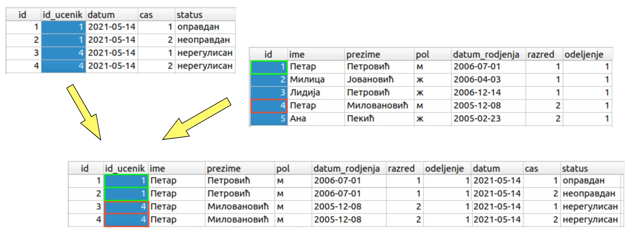 Иако се подаци о ученицима и изостанцима памте у одвојеним табелама, подаци из тих табела се, ако је потребно, могу приказати спојено коришћењем одговарајућег упита (што ћемо касније учити како се ради).