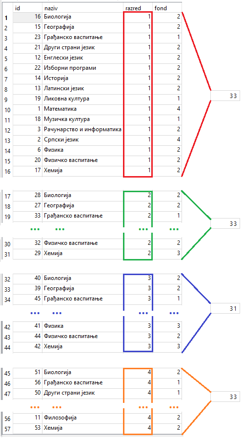 У овом случају се за сваки пар вредности (razred, odeljenje)