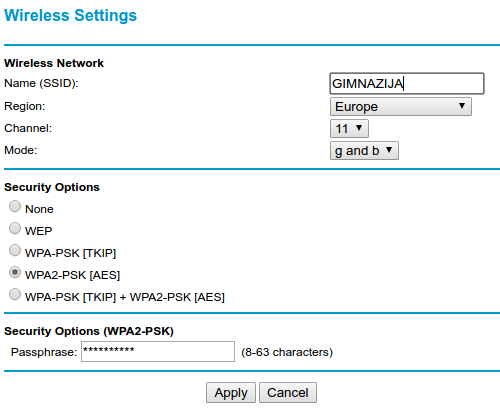 затим облик заштите мреже (нпр. WPA2-PSK [AES]) и лозинка за