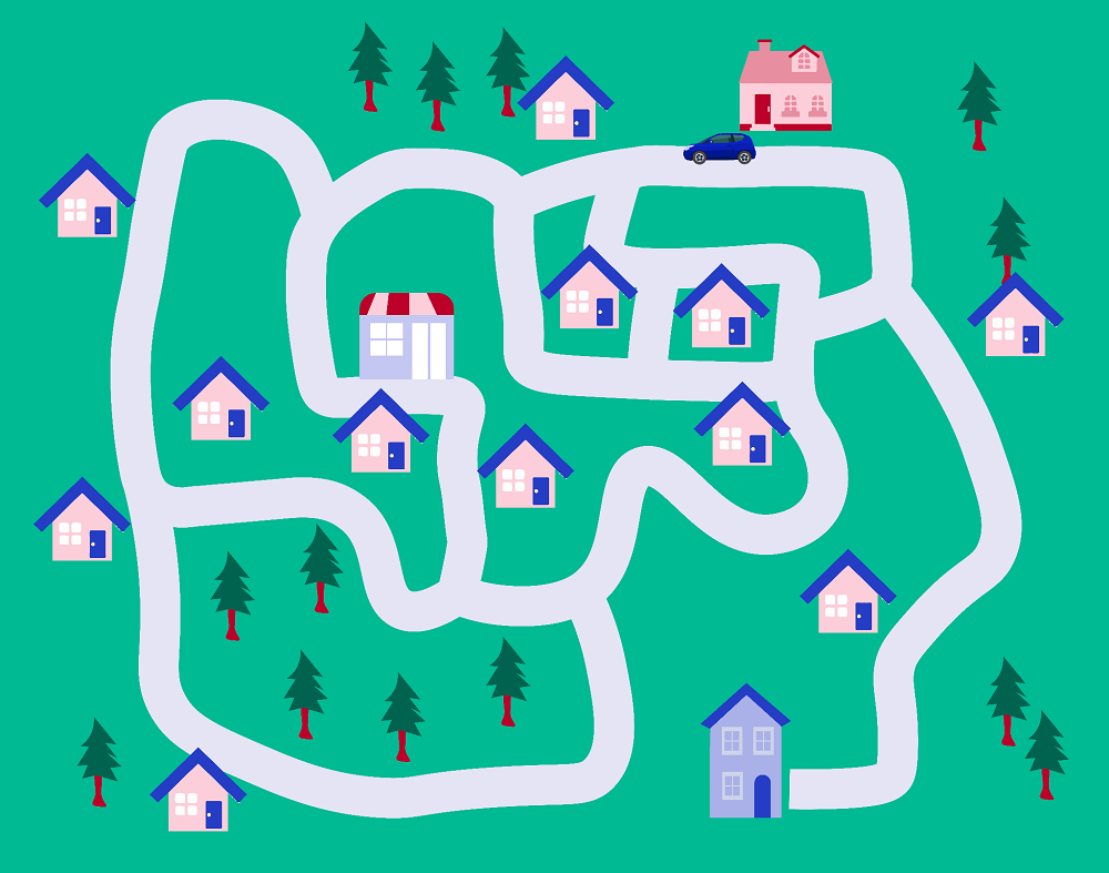 Наја је позвана на рођендан код својих другарица близнакиња Иване и Петре. Оне живе на другом крају града у љубичастој кући. Пре него што оде на рођендан она са татом одлази у продавницу да им купи поклон. Продавница се налази у центру места и има црвено-розе кров. Наја зна пут до куће својих другарица, мама ју је возила више пута. Помози Наји да, по изласку из продавнице, тату одведе на право место.