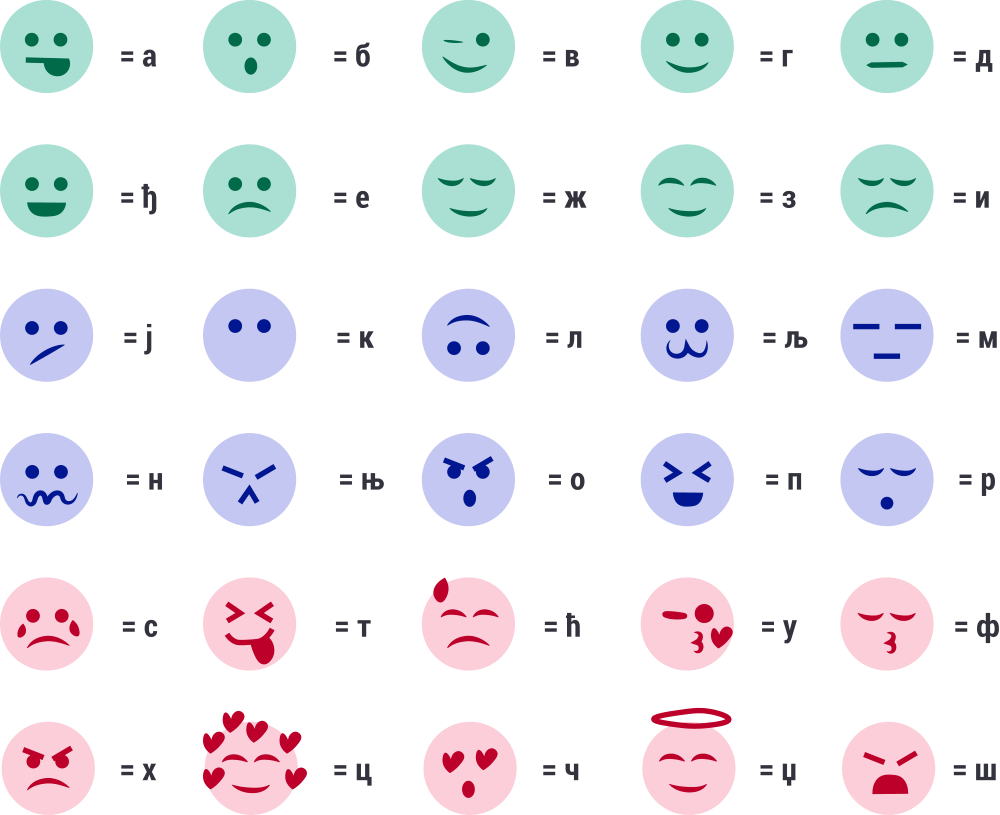 Људи стално користе емотиконе на својим телефонима, таблетима и рачунарима. Нека сваки емотикон представља једно слово азбуке.