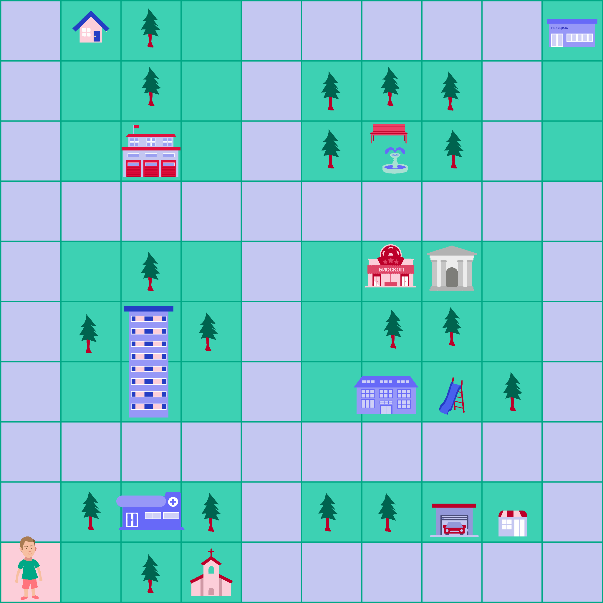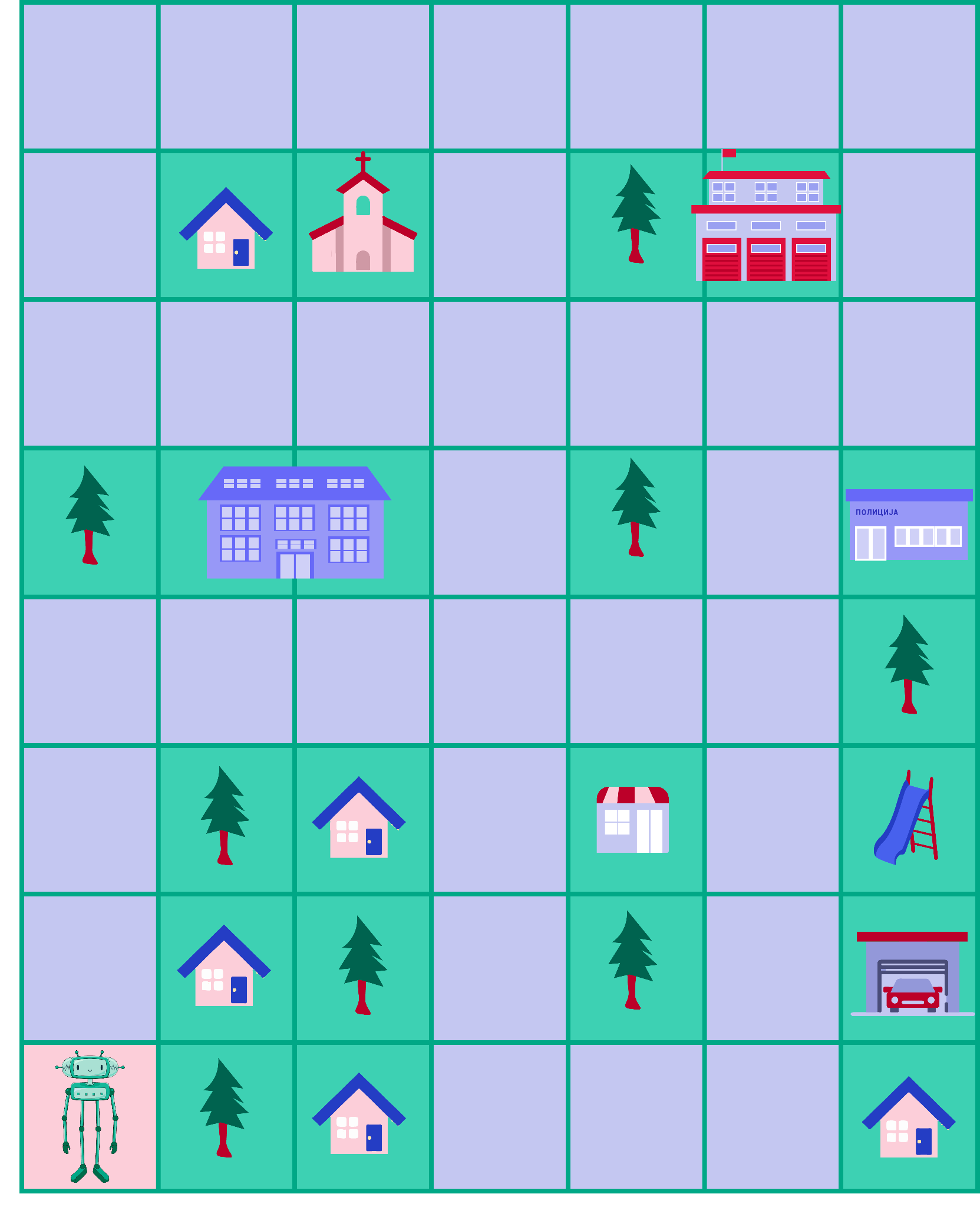Користећи наведене симболе напиши алгоритам који представља пут којим дечак иде до школе пролазећи поред солитера.