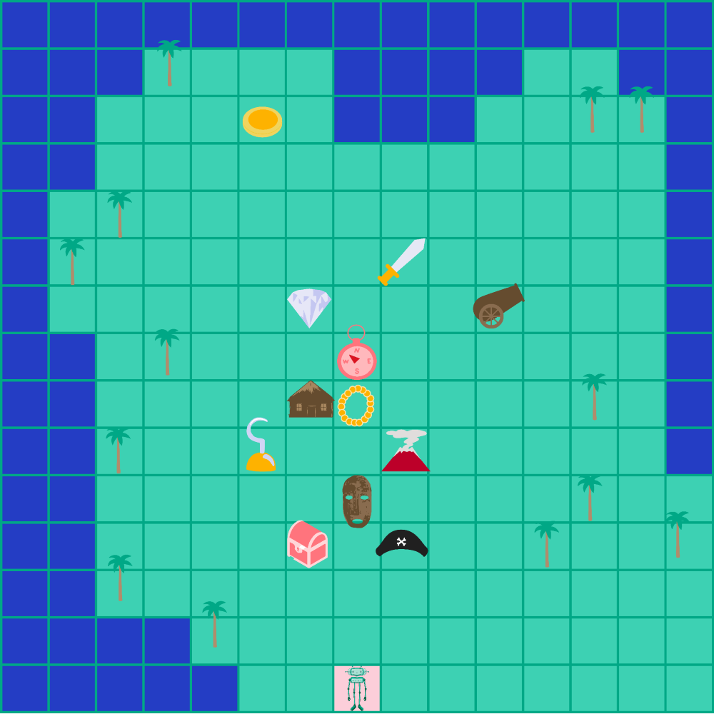 Истраживачка експедиција је пронашла мало опасно острво на коме су гусари давно оставили своје благо. Помоћу дрона су сликали острво и направили мапу острва. Пред тобом се налази мапа острва. Истраживачи су послали робота да им помогнеш да пронађу што више предмета које су гусари оставили на острву.