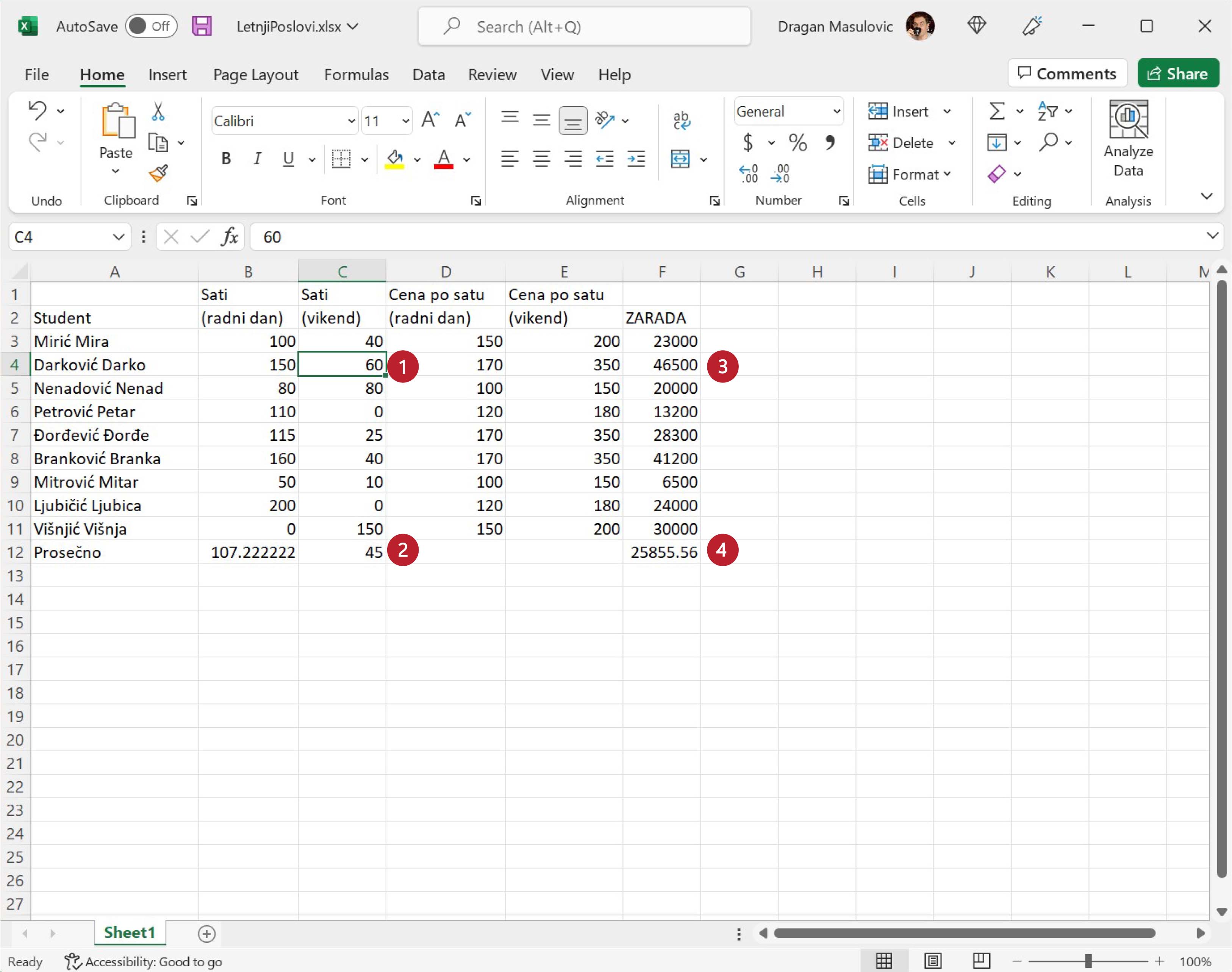 Поиграј се са бројевима. Промени неке вредности и уочи како Ексел аутоматски прерачунава све ћелије чија вредност зависи од начињене измене.
