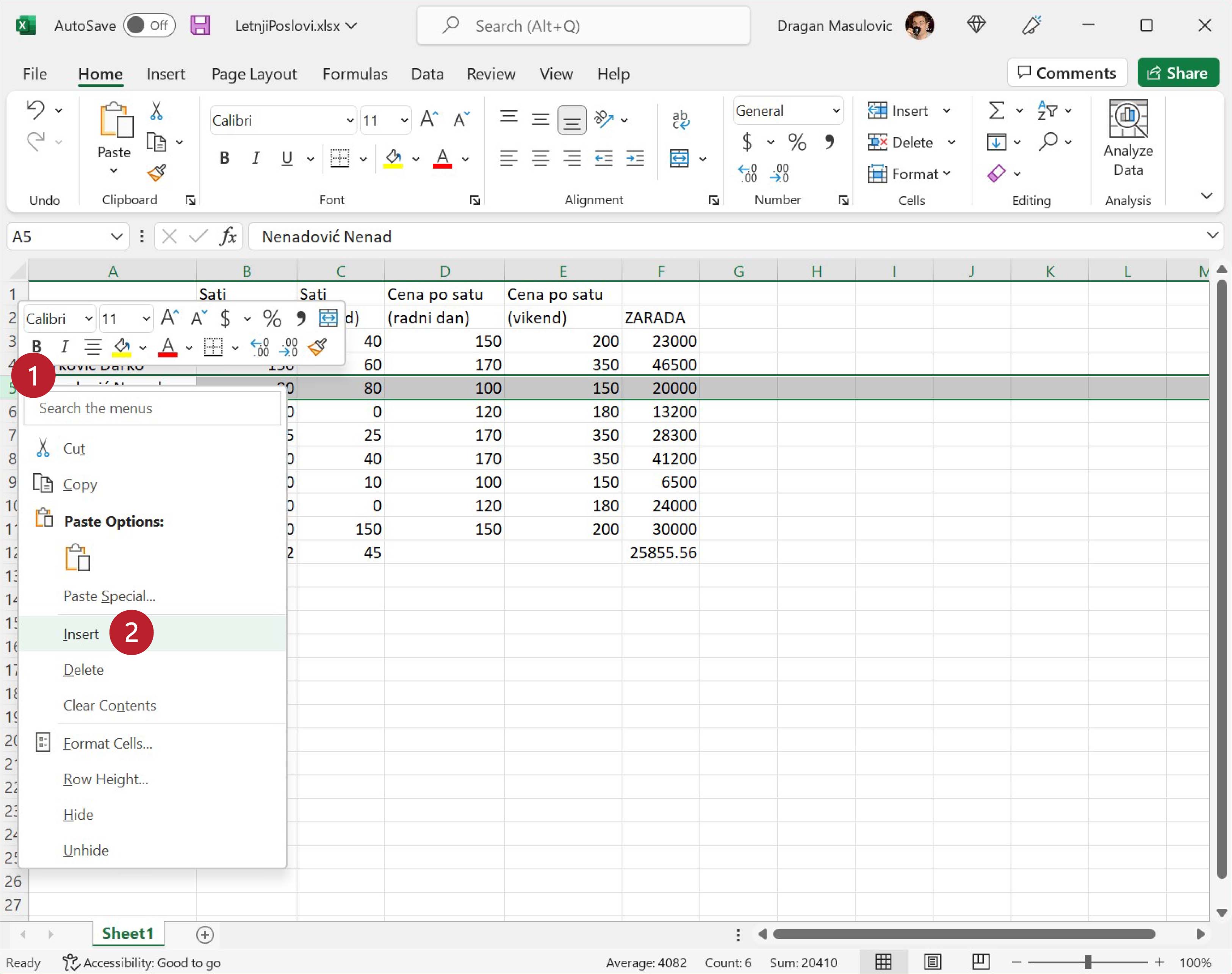 Десним („чудним“) кликом кликни на редни број врсте 5 (баш на број 5) и у малом менију који се појавио одабери „Insert“: