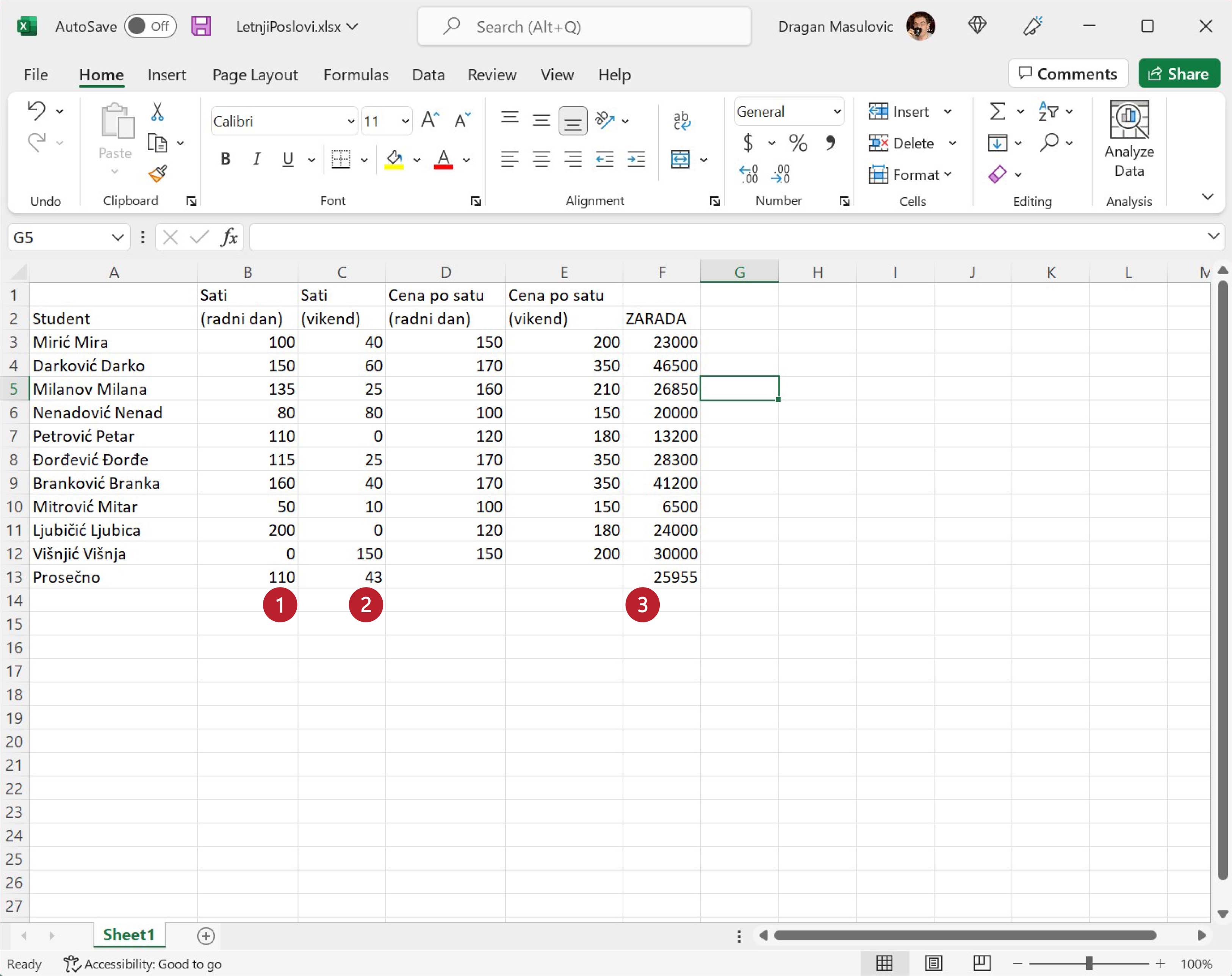 Унеси неко име и неке податке о радним сатима и накнадама, као и формулу за обрачун зараде, рецимо овако: