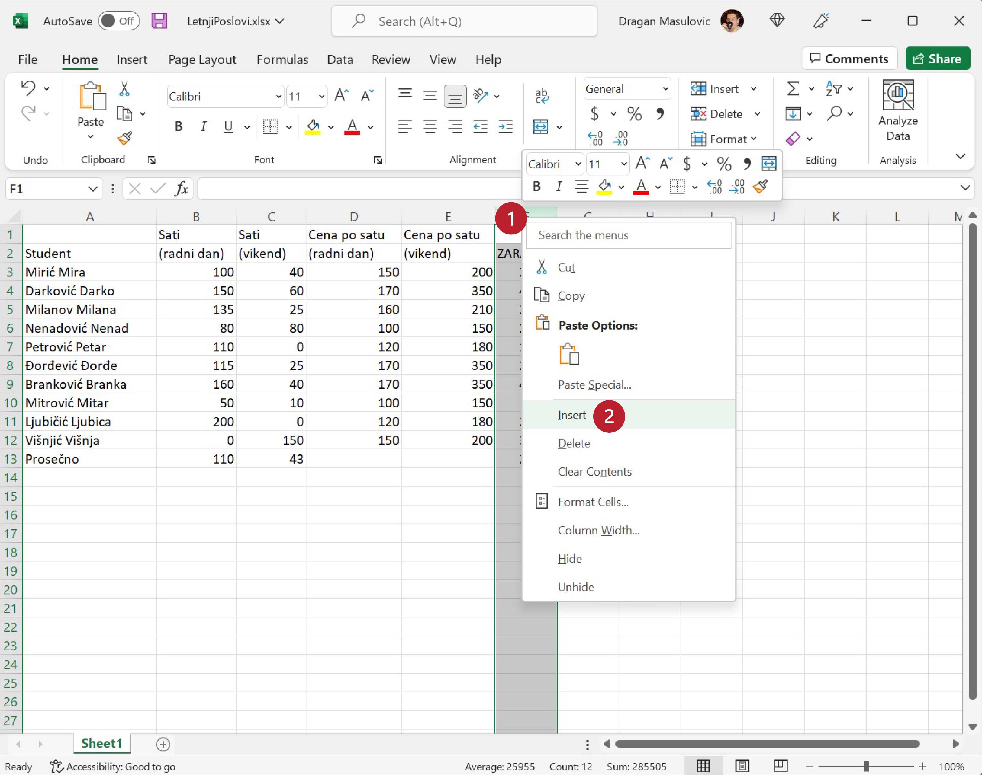 Десним („чудним“) кликом кликни на име колоне F (баш на слово F) и у малом менију који се појавио одабери „Insert“: