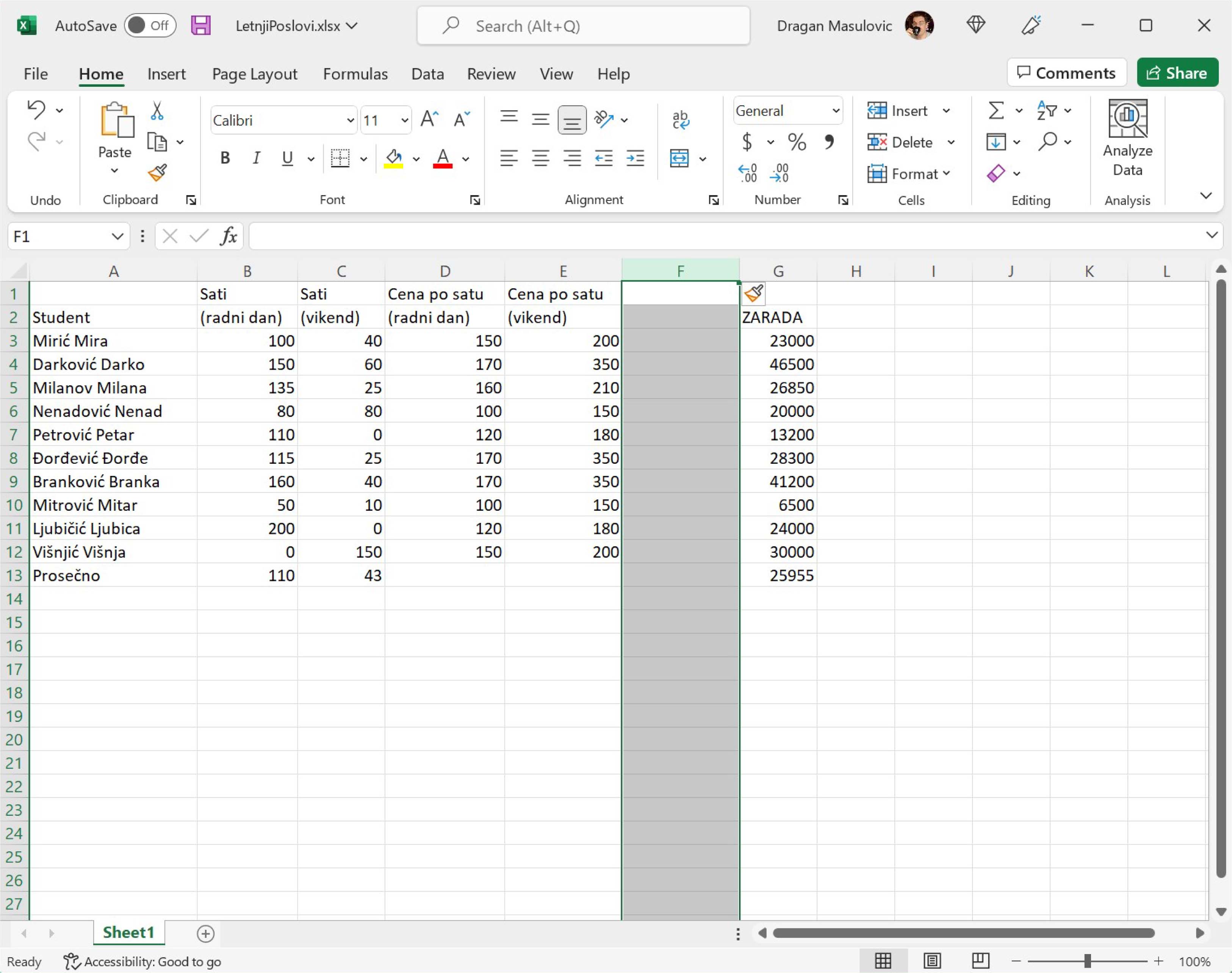 Администрацији Студентске задруге је потом јављено да неки студенти нису испоштовали уговор са фирмом код које су радили преко лета и да због тога треба да буду кажњени (новчано). Зато ћеш уметнути нову колону између колона E и F и у њу унети податке о казнама.