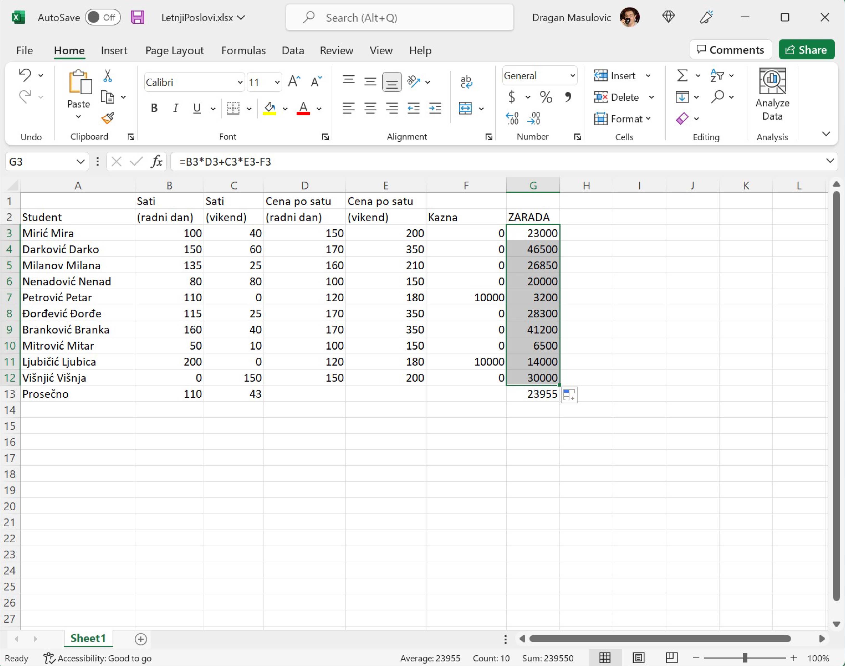 Овај пут Ексел није ништа прерачунао аутоматски: вредности зараде се нису измениле! Разлог је то што Ексел не зна како да укључи нове податке у обрачун зараде – за то нам је потребна нова формула! Зато ћеш сада у ћелију G3 унети формулу која и казну узима у обзир: