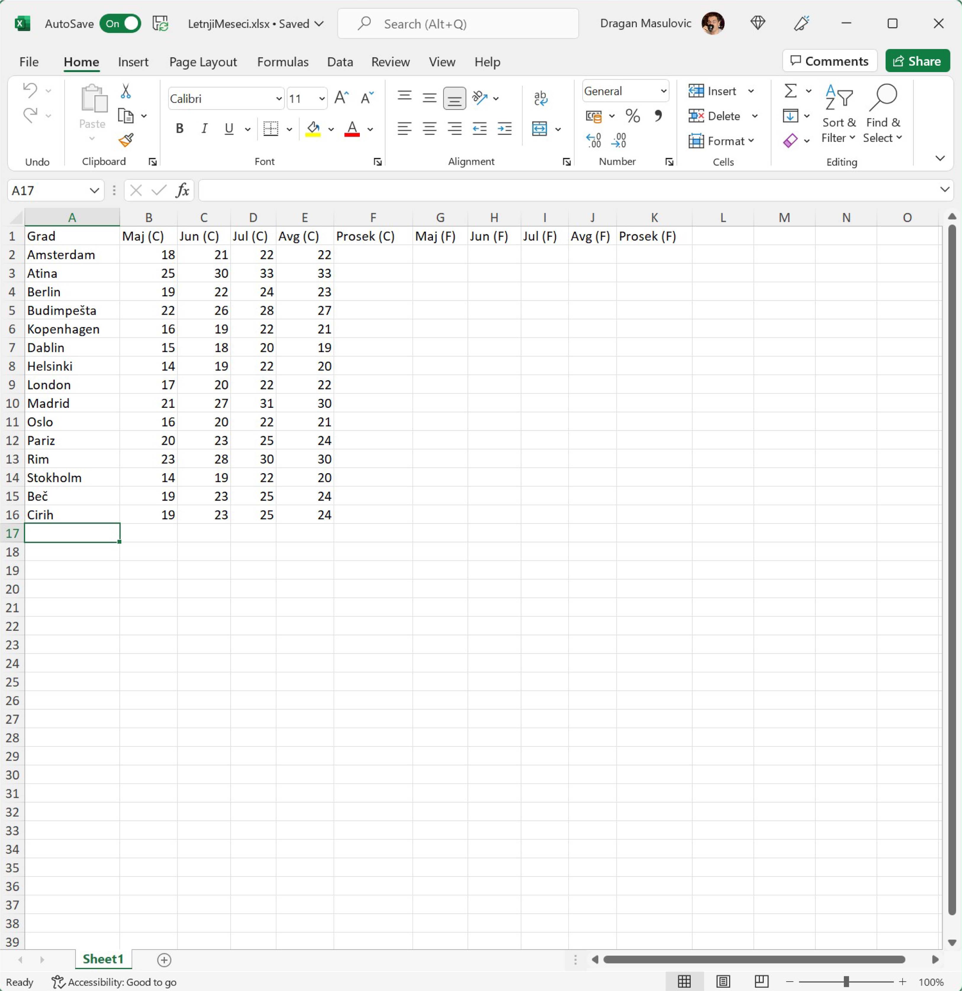 Преузми табелу са следећег линка LetnjiMeseci.xlsx тако што ћеш кликнути на линк десним тастером миша и онда у малом менију који се појави одабрати опцију „Save link as…“. Када отвориш табелу из Ексела треба да видиш следеће податке: