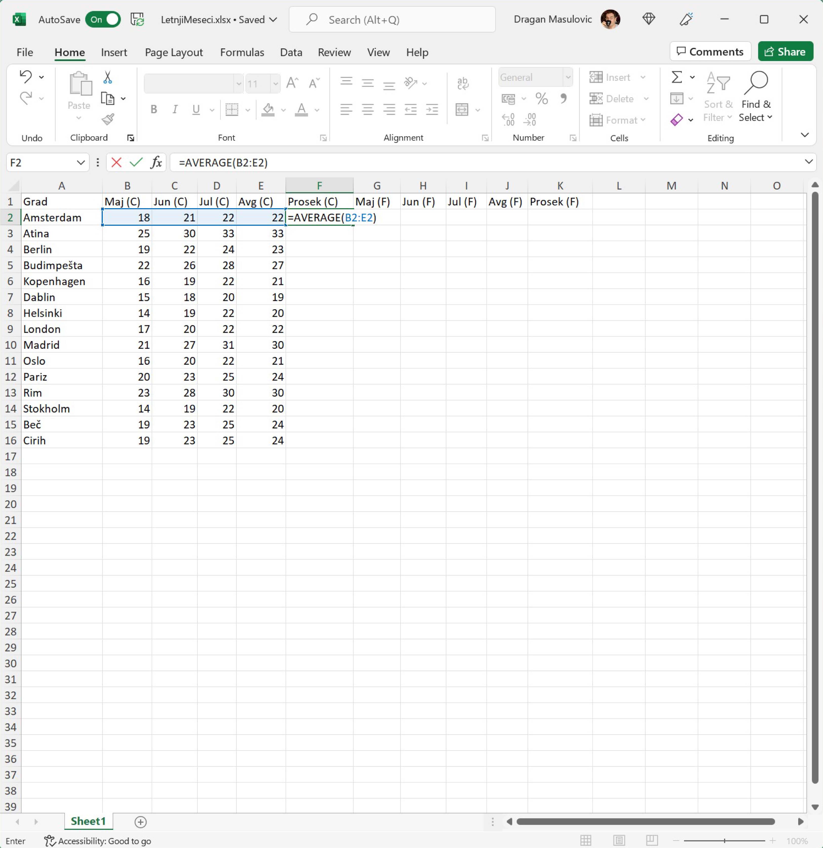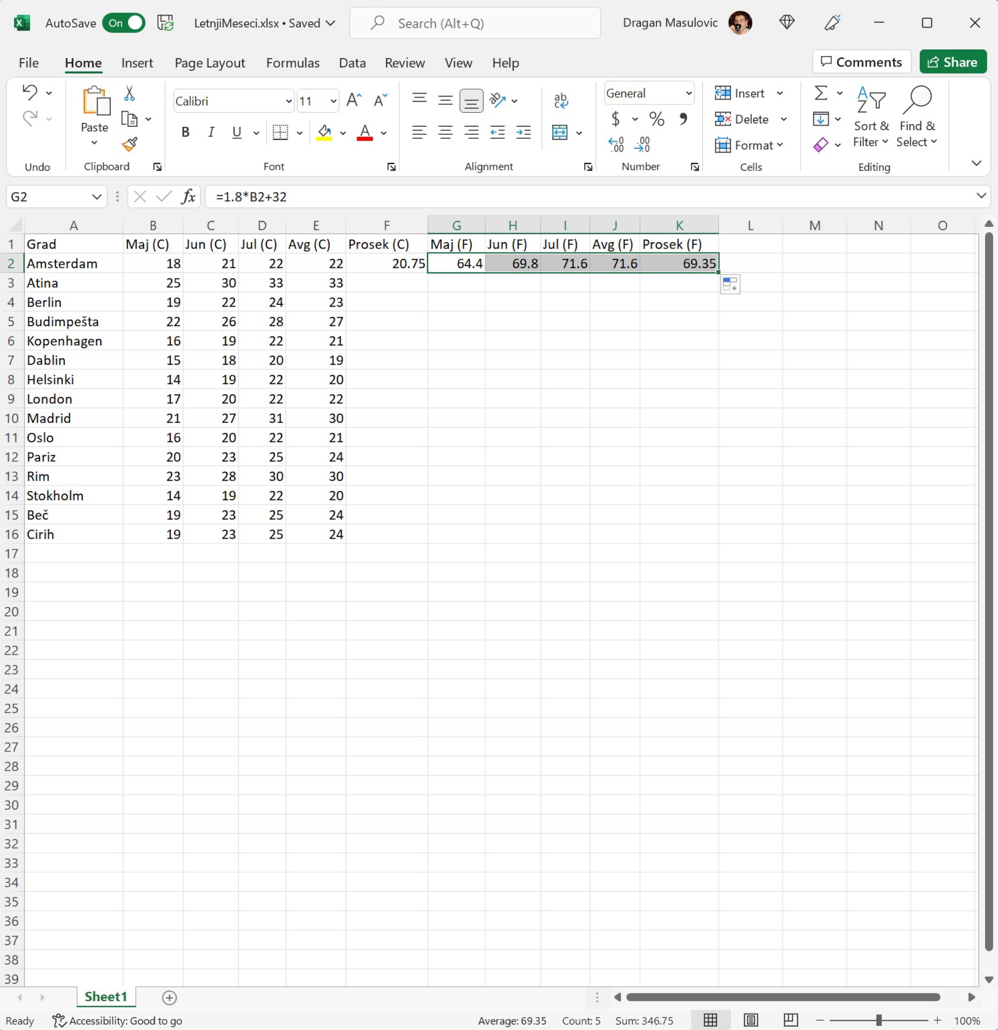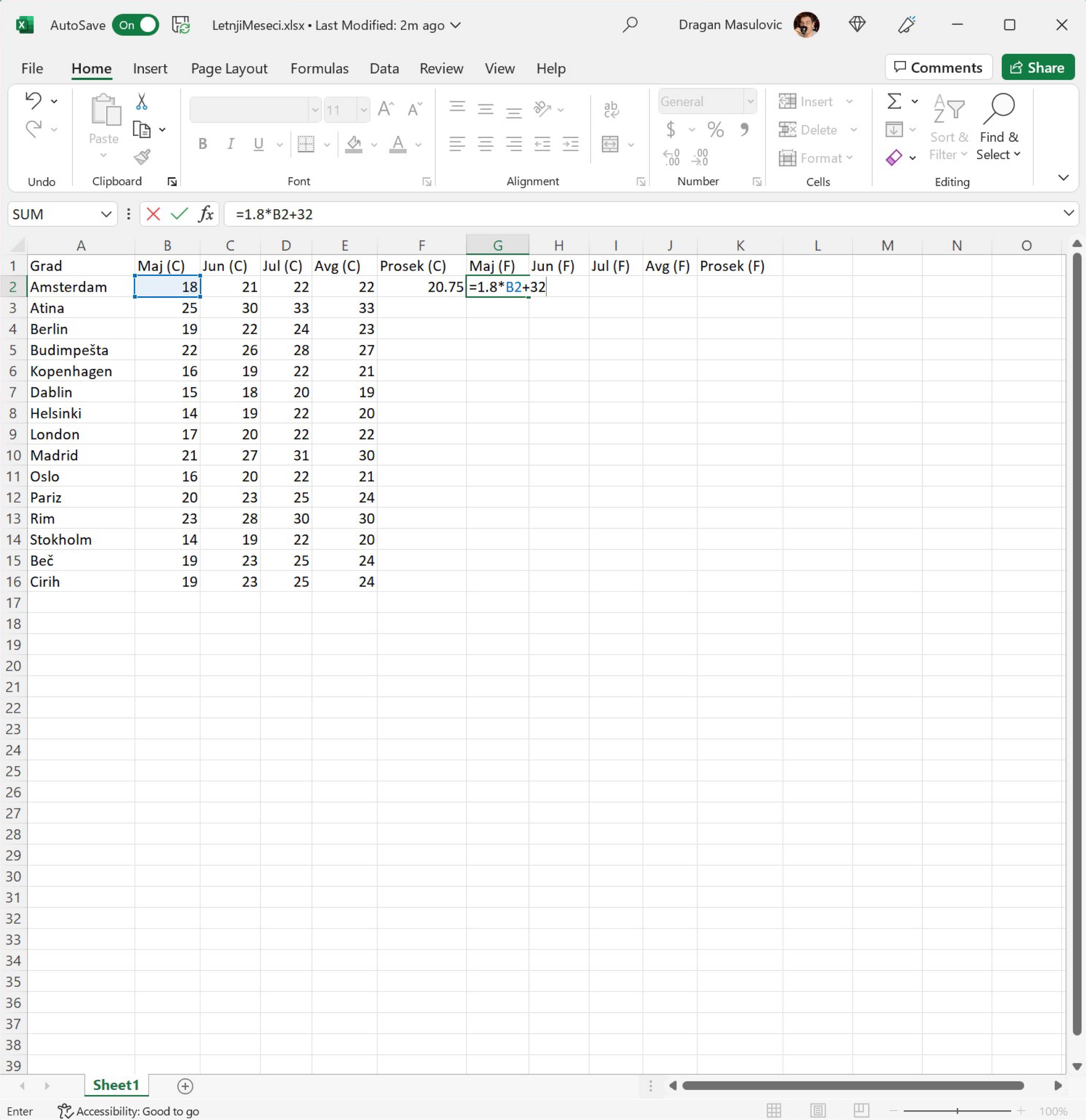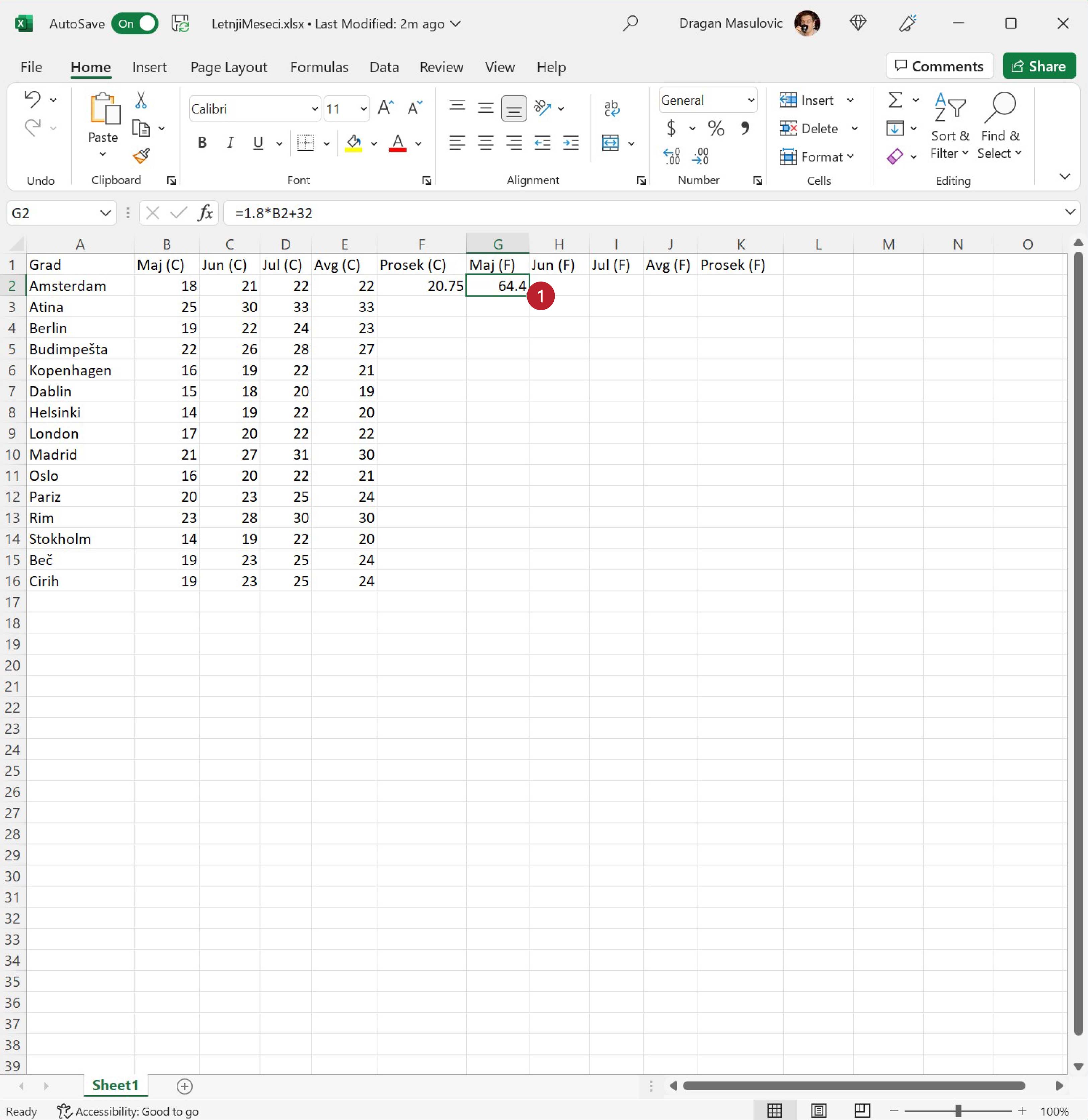 Сада ћемо у ћелију G2 да унесемо формулу која ће прерачунати температуру у мају у Амстердаму, из степена Целзијуса у степене Фаренхајта, по формули: