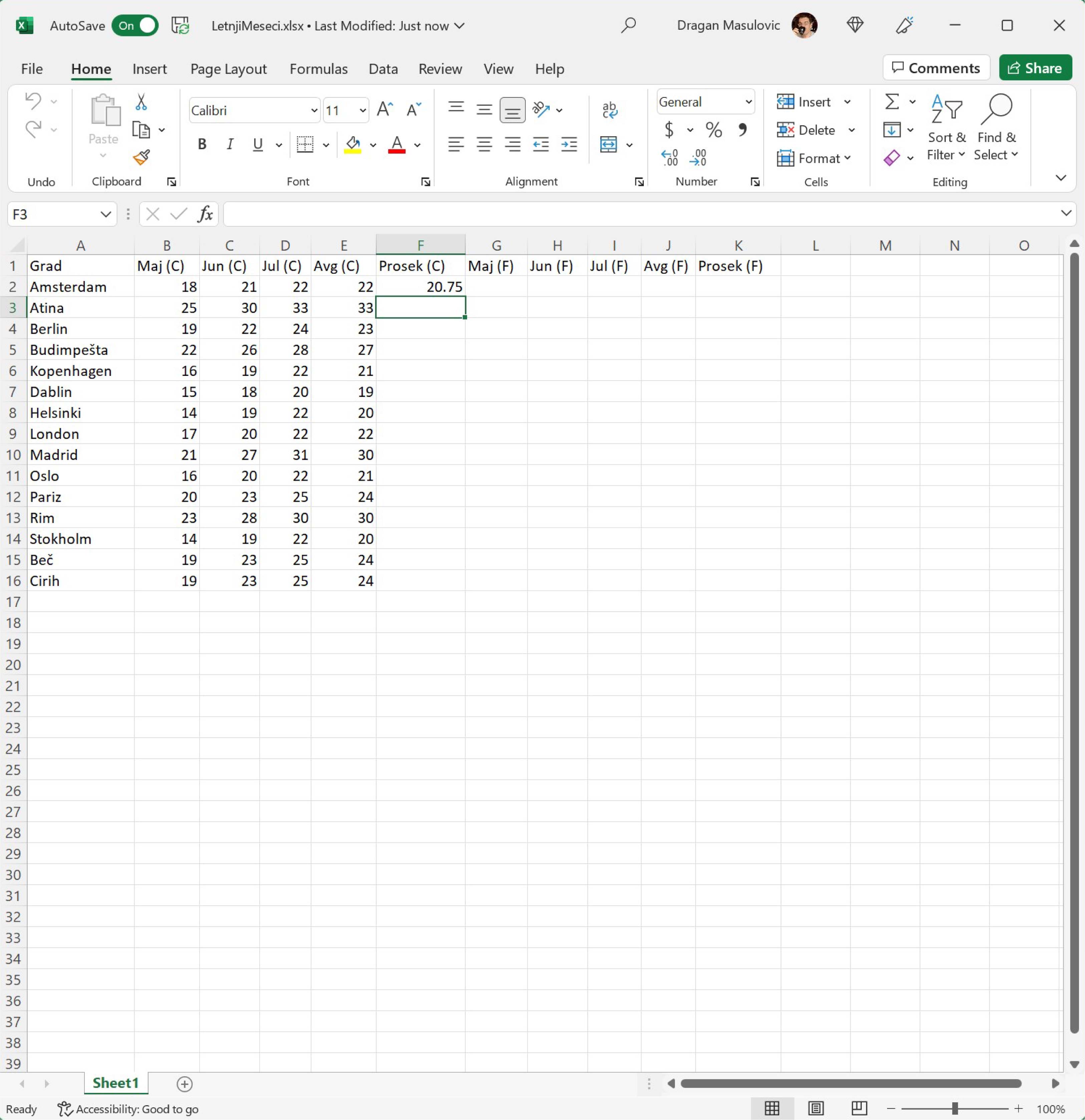 У табели испод су дате очекиване температуре у степенима Целзијуса у неким европским градовима у мају, јуну, јулу и августу једне године. Прерачунаћемо те податке у степене Фаренхајта, за сваки град одредити просек за четири наведена месеца, и одредићемо најтоплије и најхладније градове по месецима.