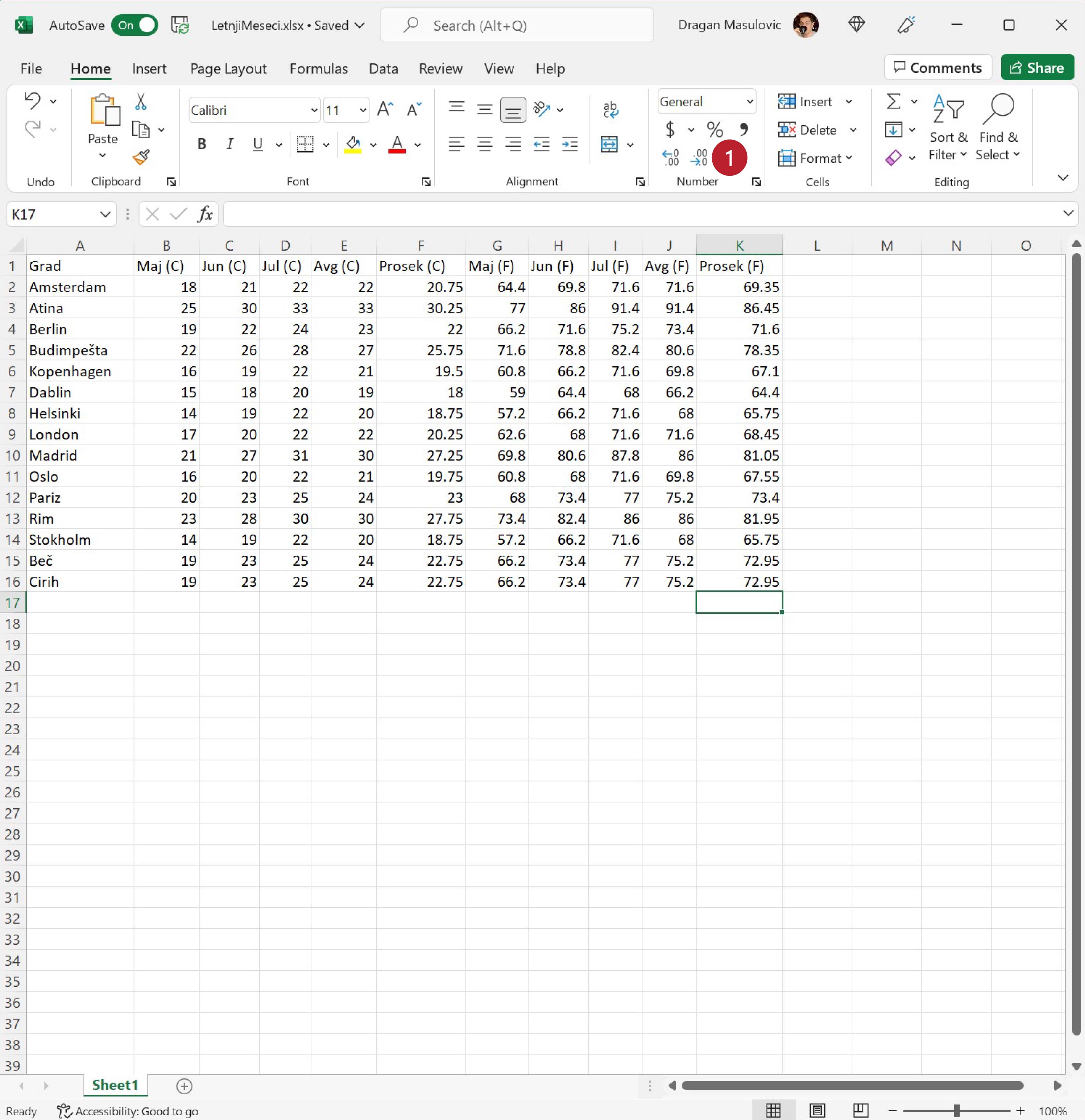 За подешавање приказа бројева у табели користимо групу команди „Number“ (1):