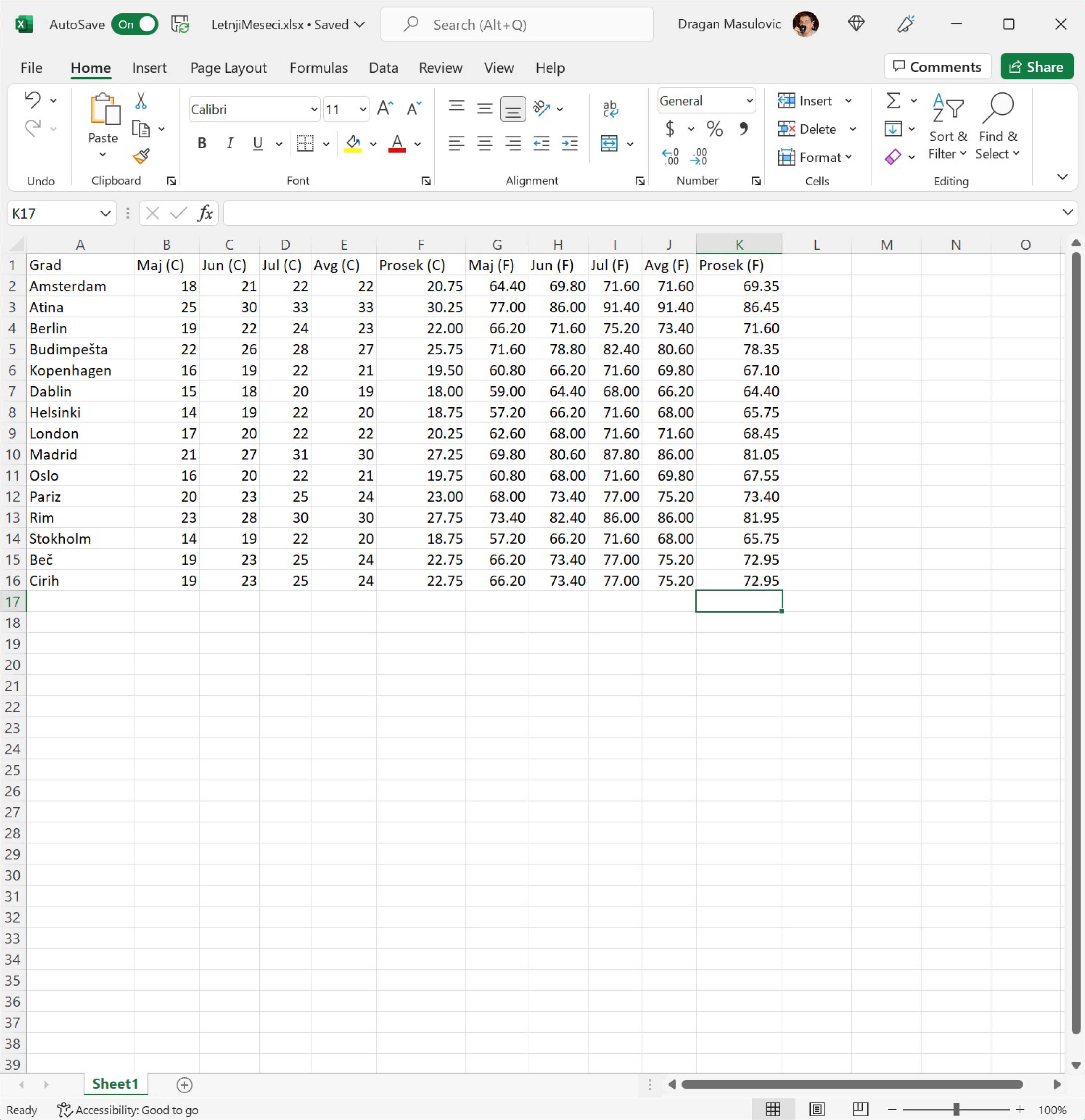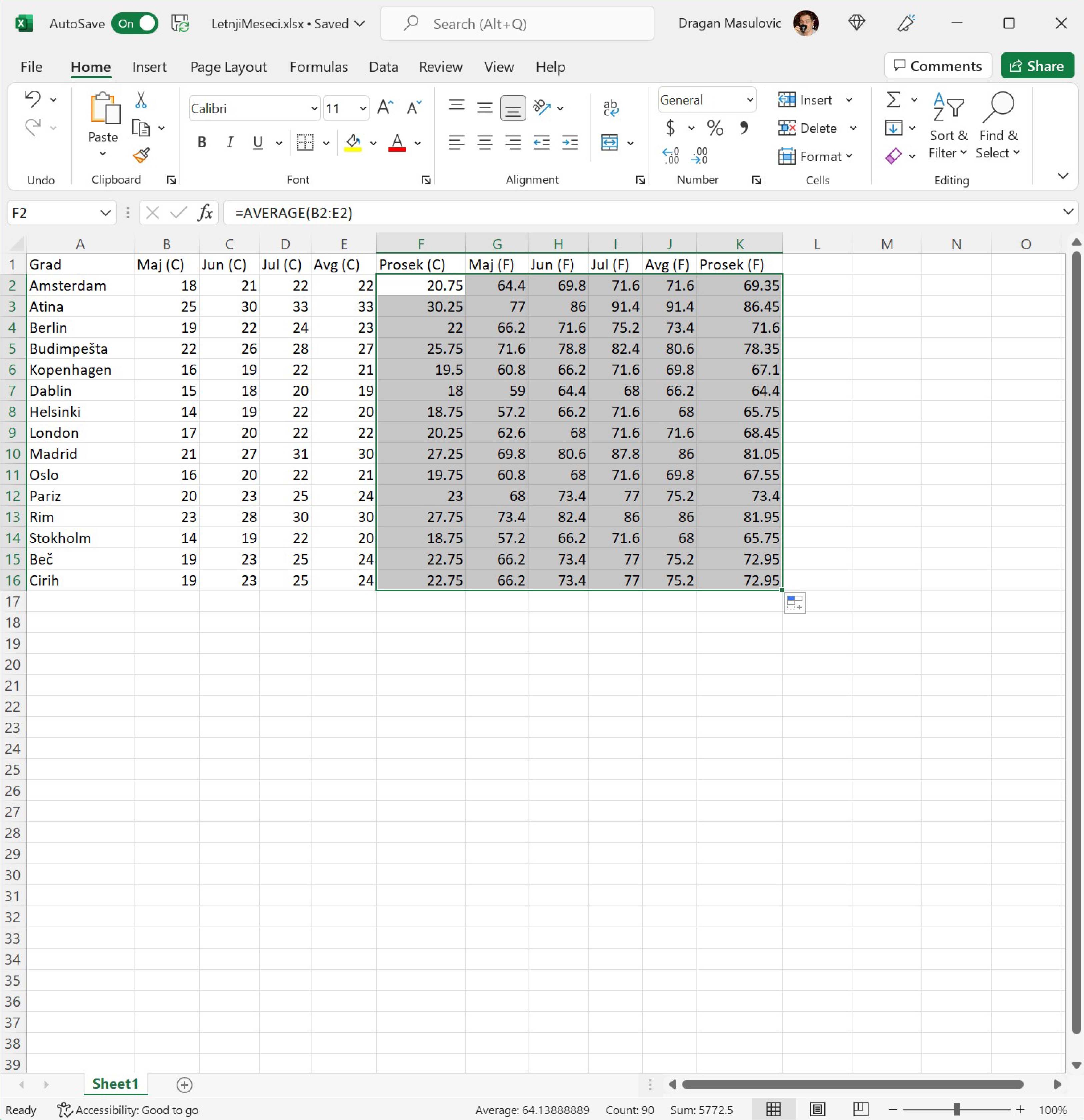 Кликни мишем на ћелију F2 и не пуштајући леви тастер на мишу развуци оквир до ћелије K16 овако: