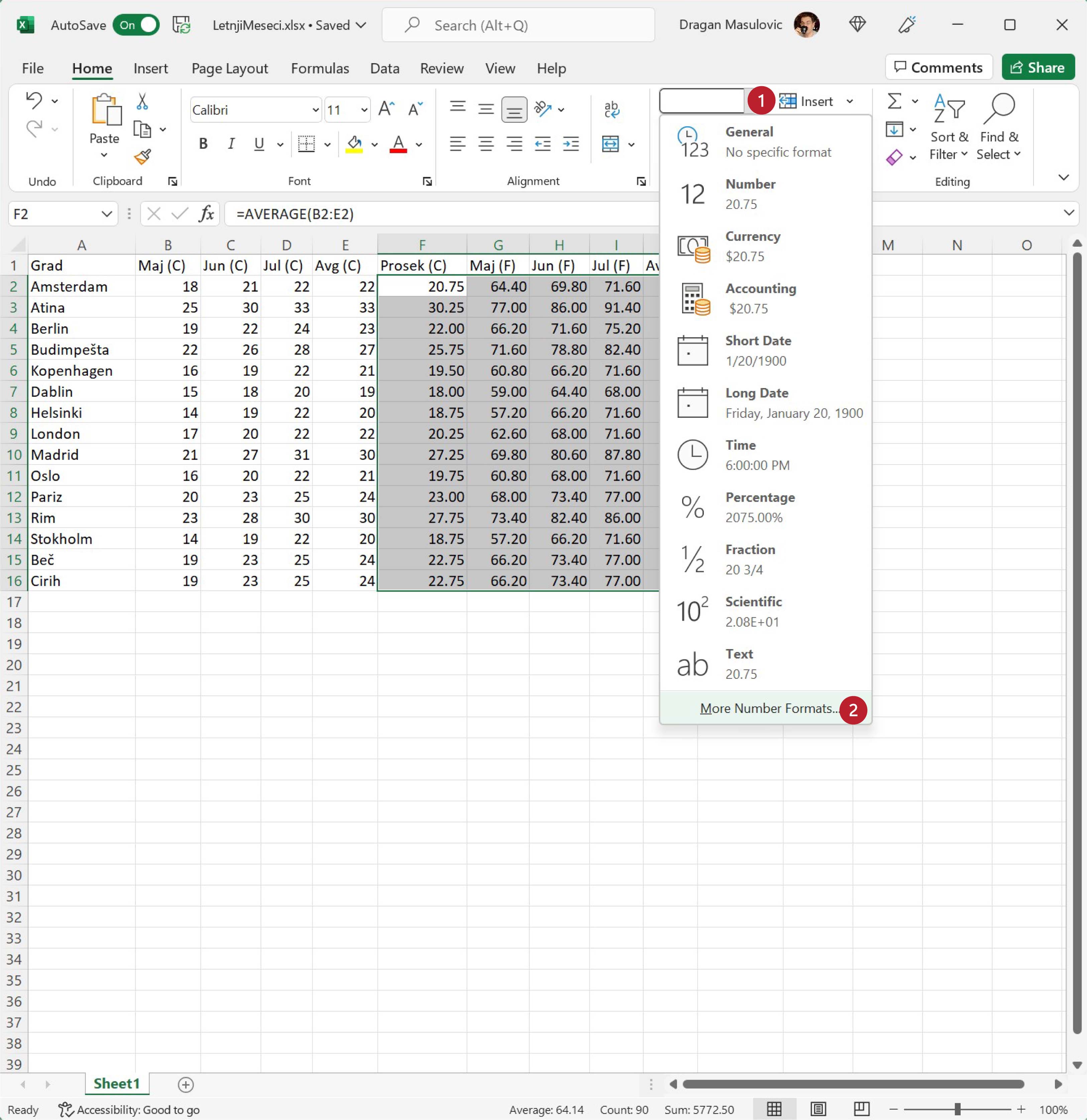 Приказивање бројева са две децимале је најчешћи захтев који корисници Ексела имају, и зато је подразумевано да ће Ексел приказати бројеве на две децимале. Ако из неких разлога желимо да прикажемо бројеве са три децимална места, или само једним, треба кликнути на стрелицу поред „General“ (1), па уместо „Number“ одабрати „More Number Formats…“ што значи „још формата бројева“ (2):
