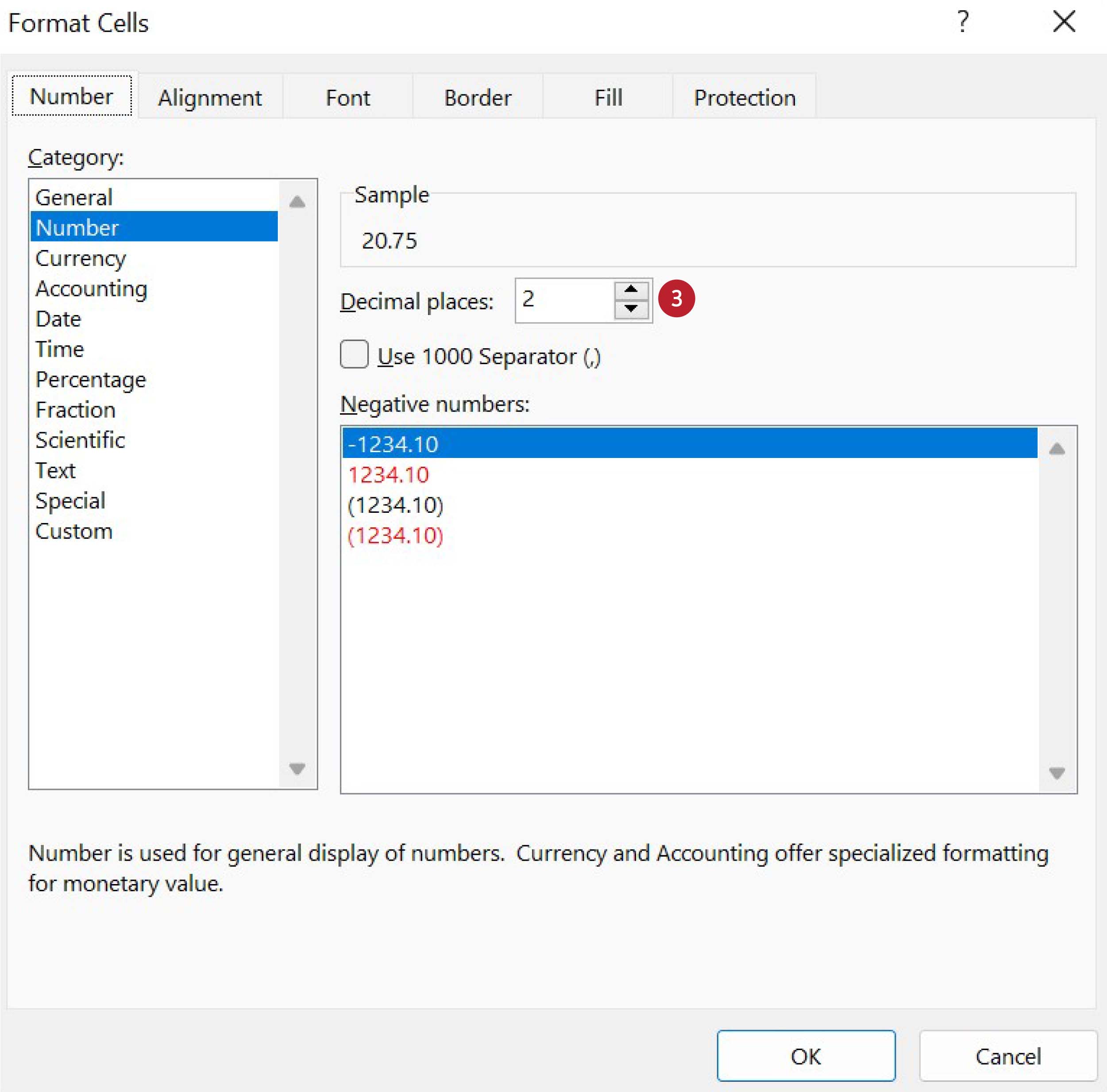 Кликни на стрелицу поред „General“ (1) и у менију који се појави одабери „Number“ (2):