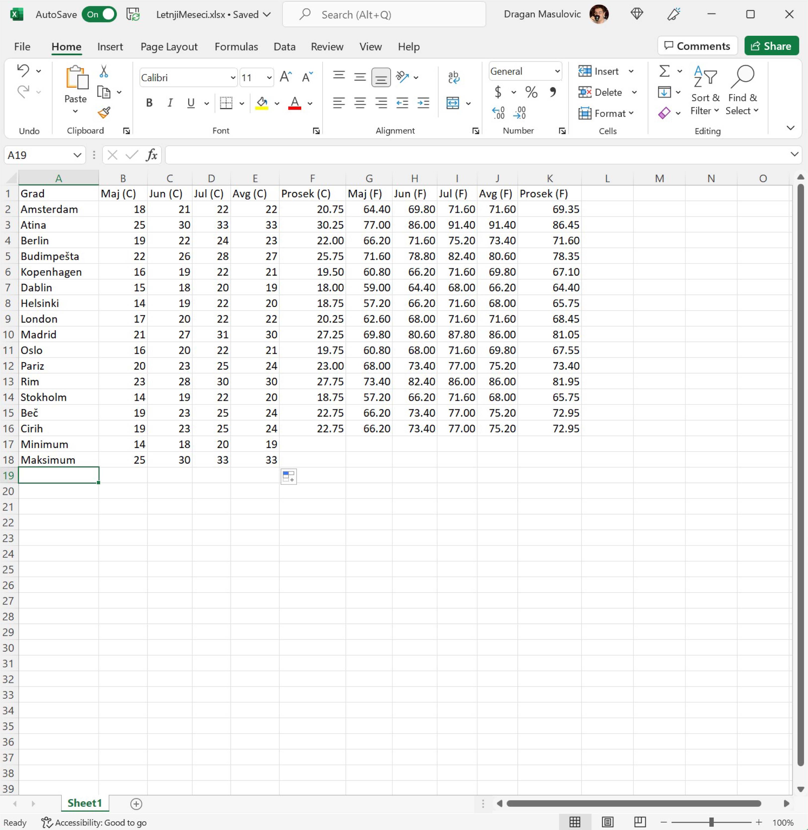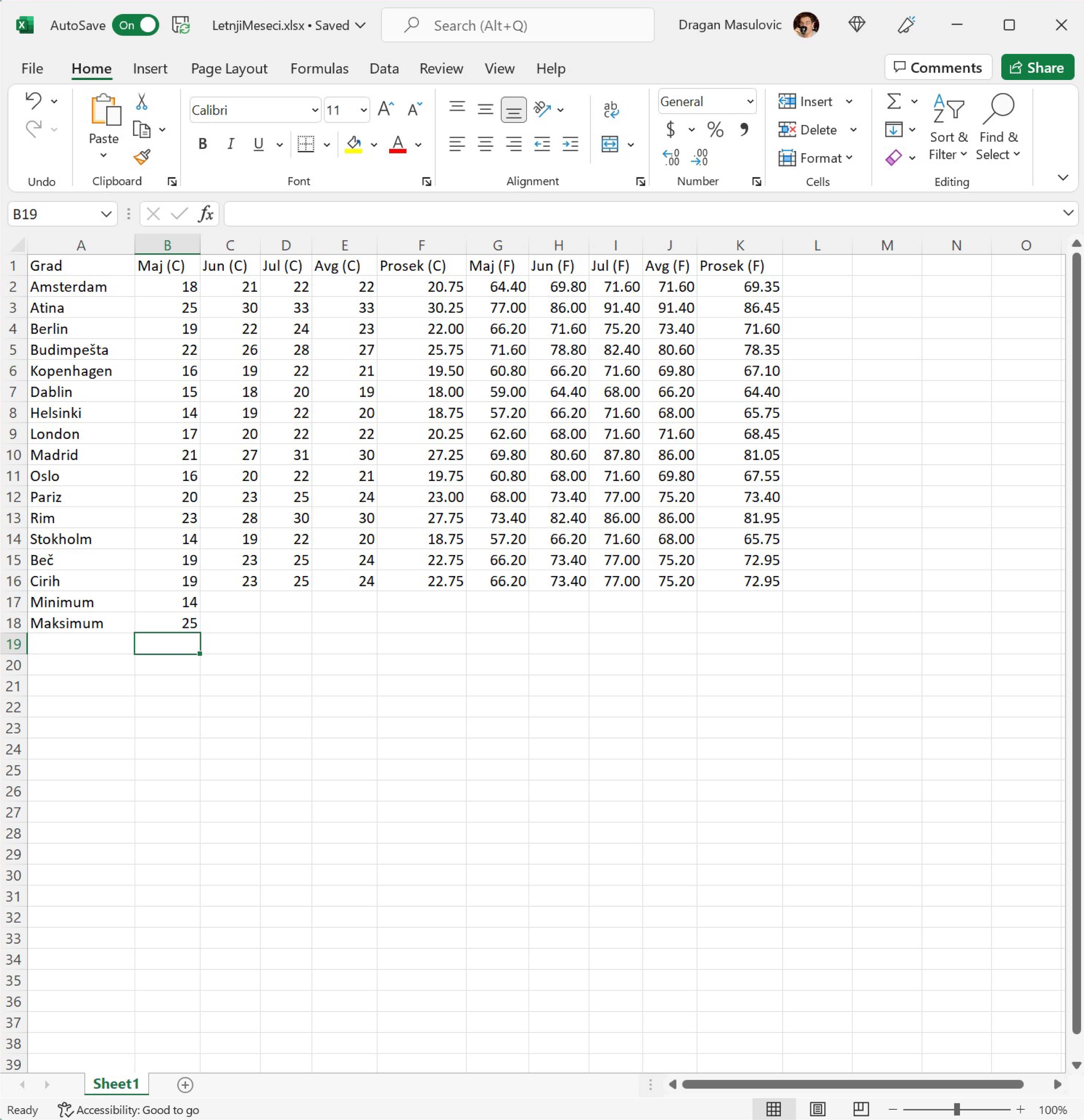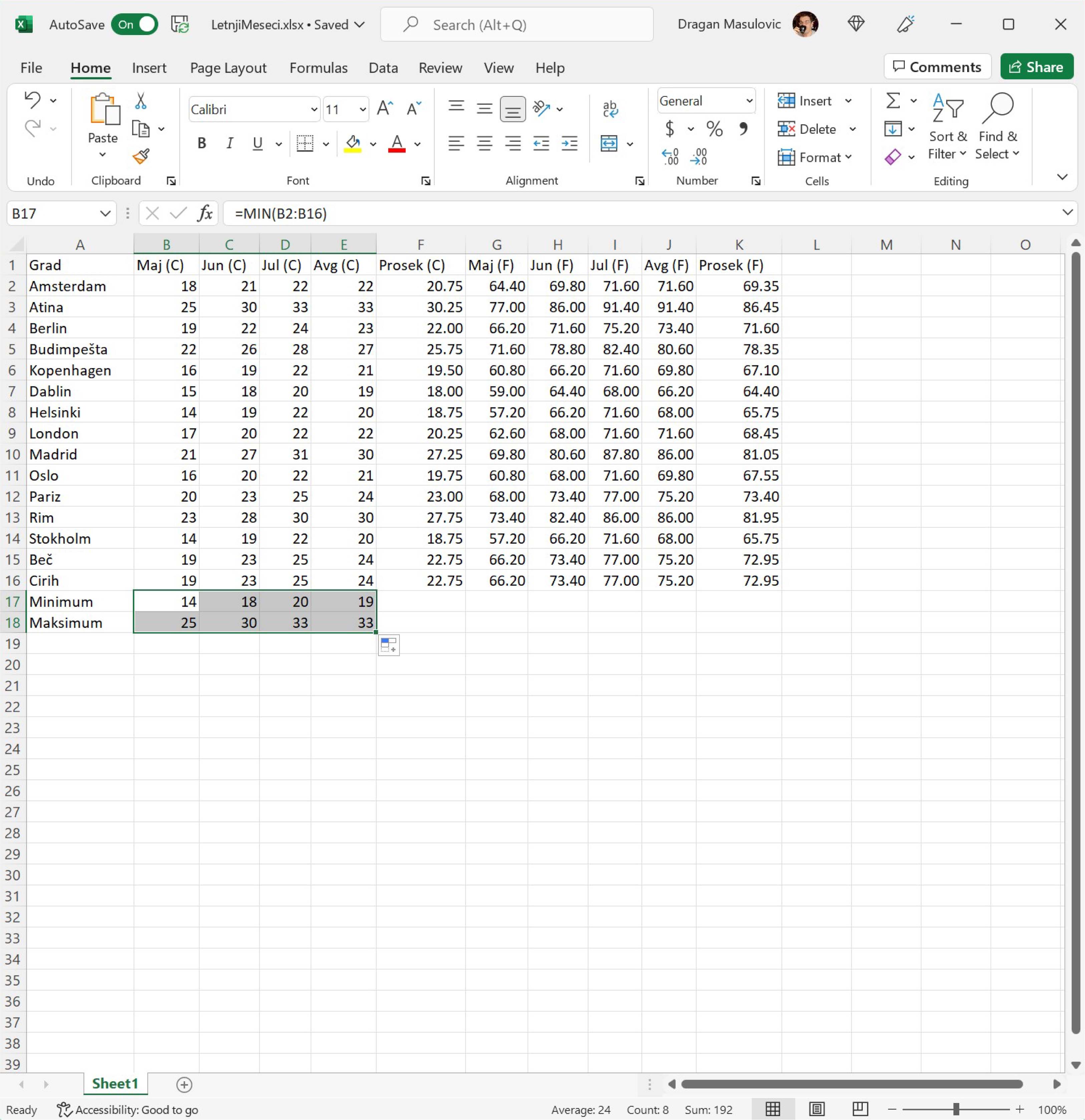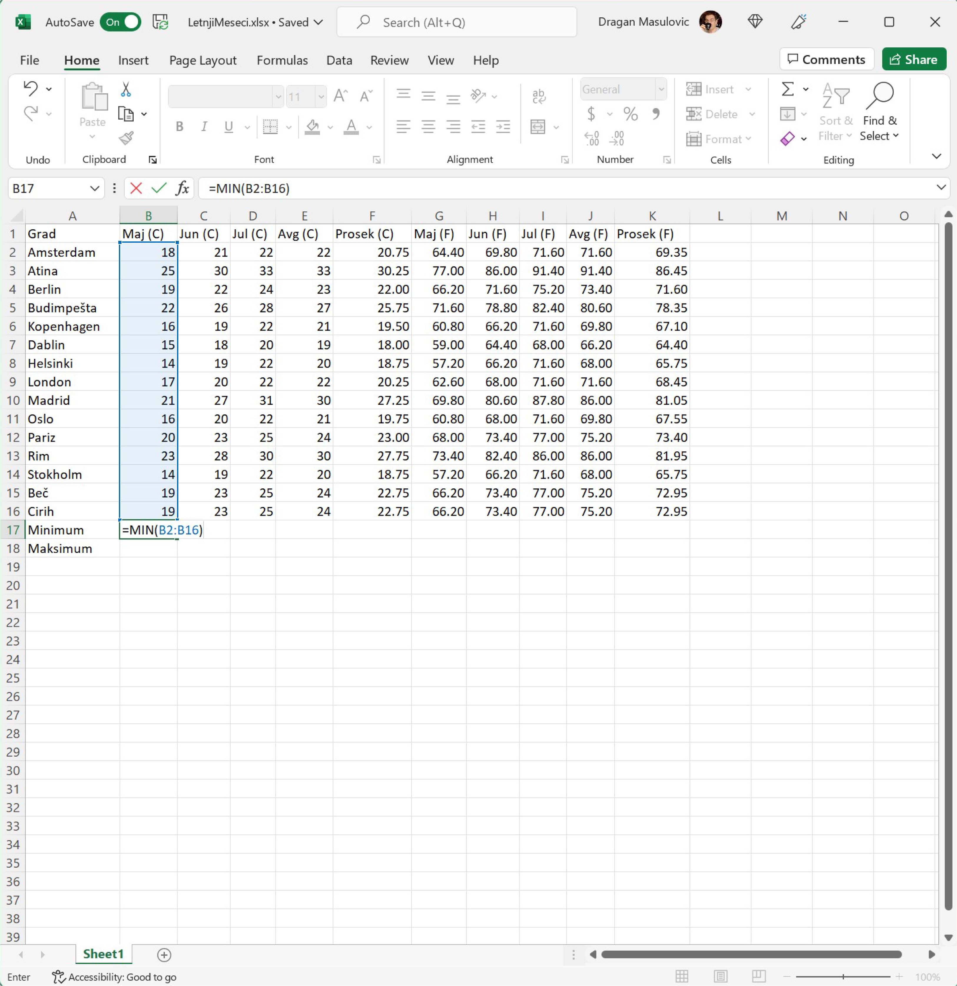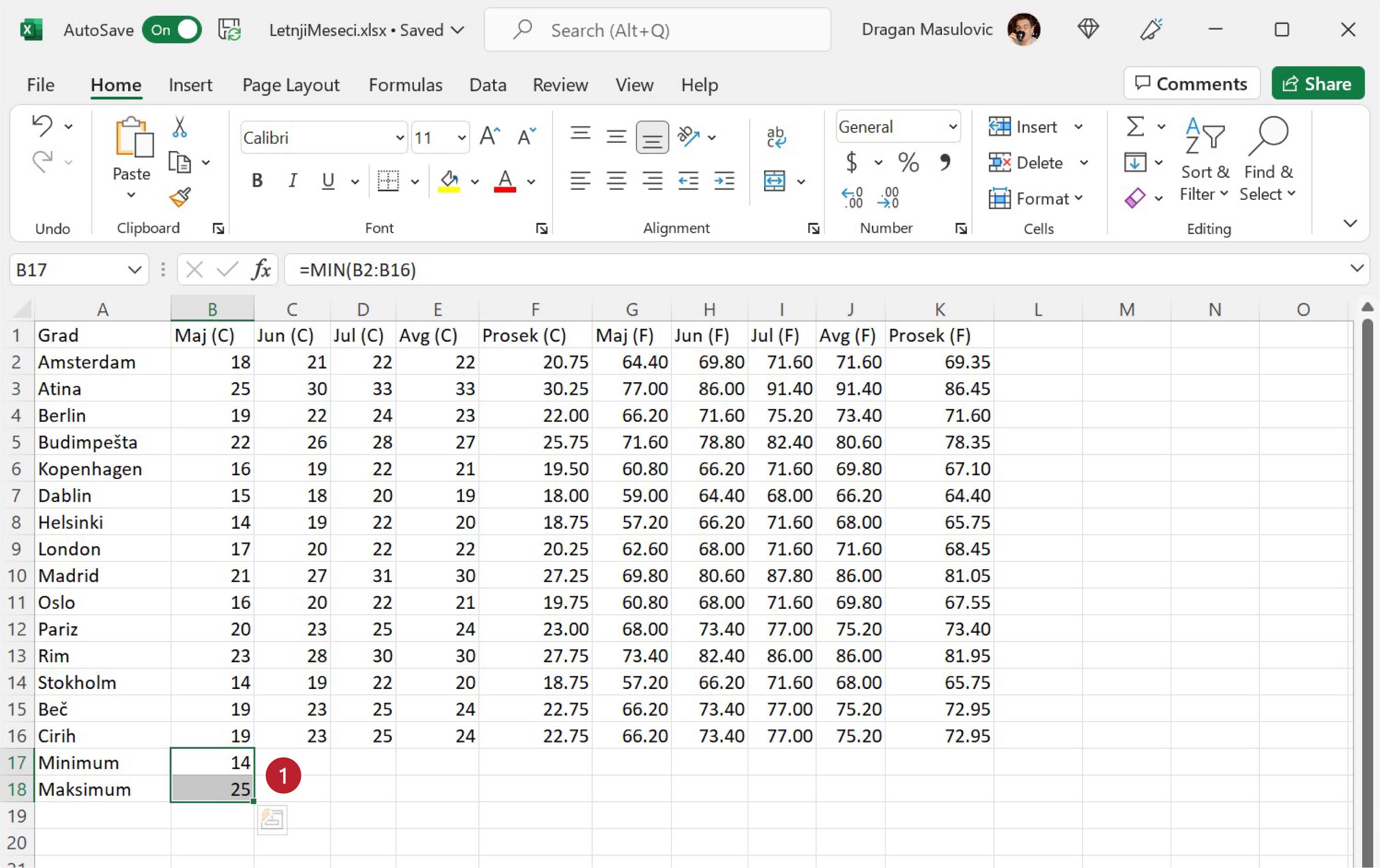 У ћелију А17 упиши „Minimum“, а у ћелију A18 упиши „Maksimum“: