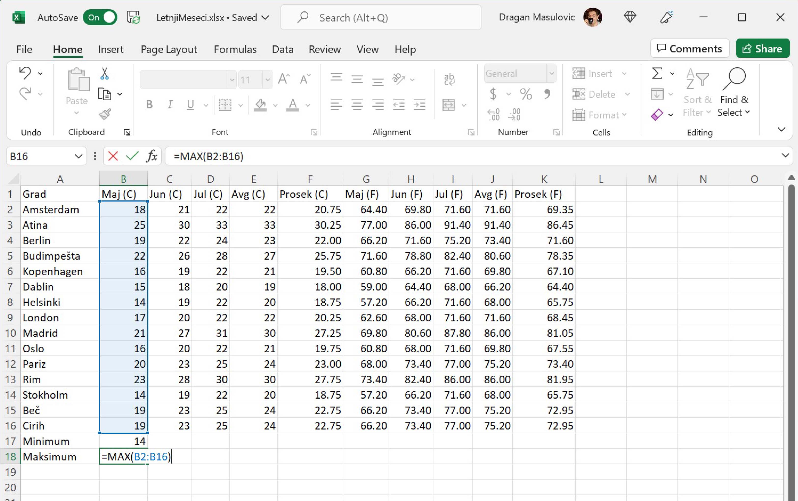Ова формула ће израчунати највећи (MAX) од бројева B2, B3, …, B16 (B2:B16) и ту вредност уписати у ћелију B18: