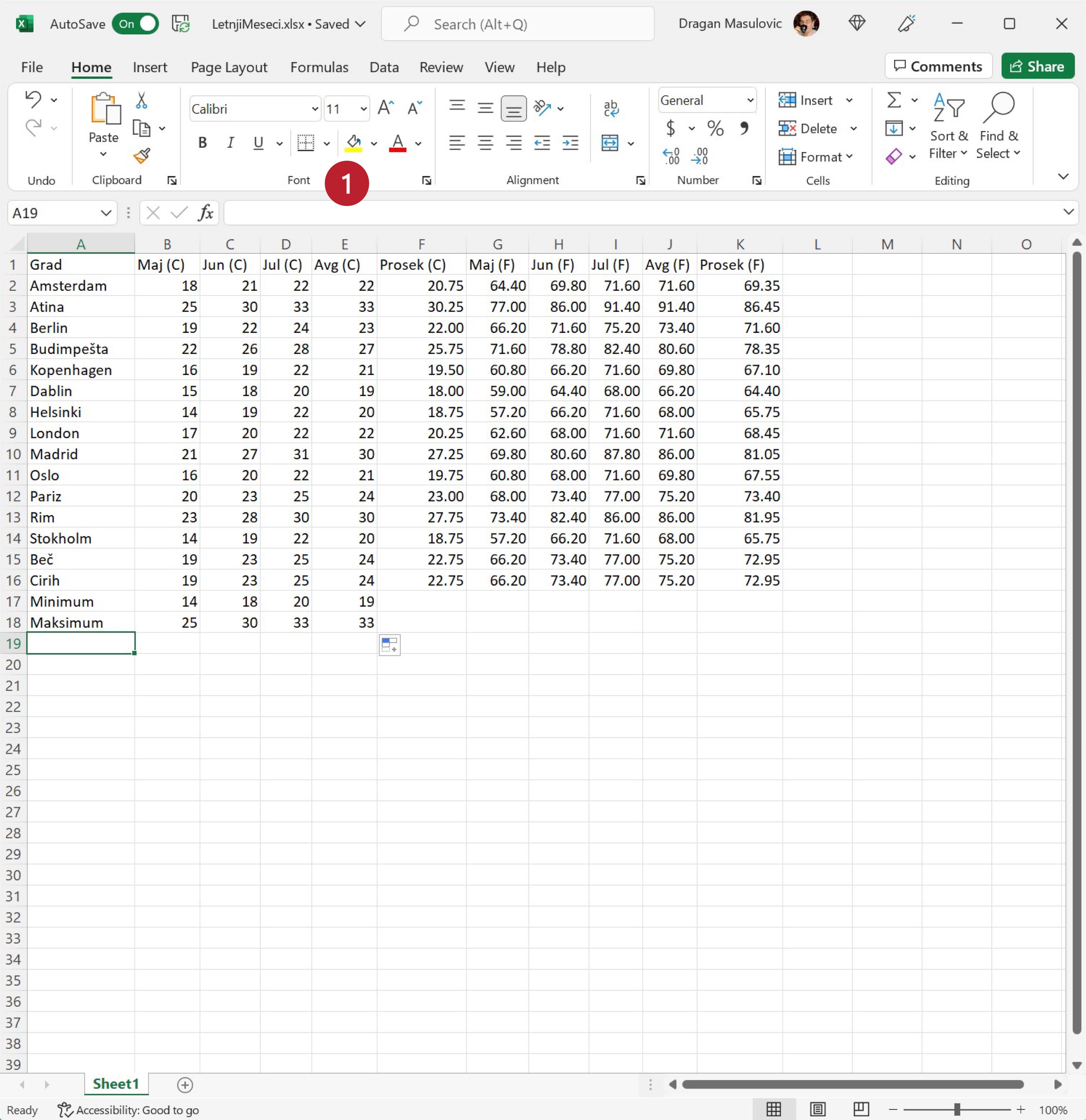 Позадину ћелија које одговарају просечним температурама (F2:F16 и K2:K16) обој у жуто: