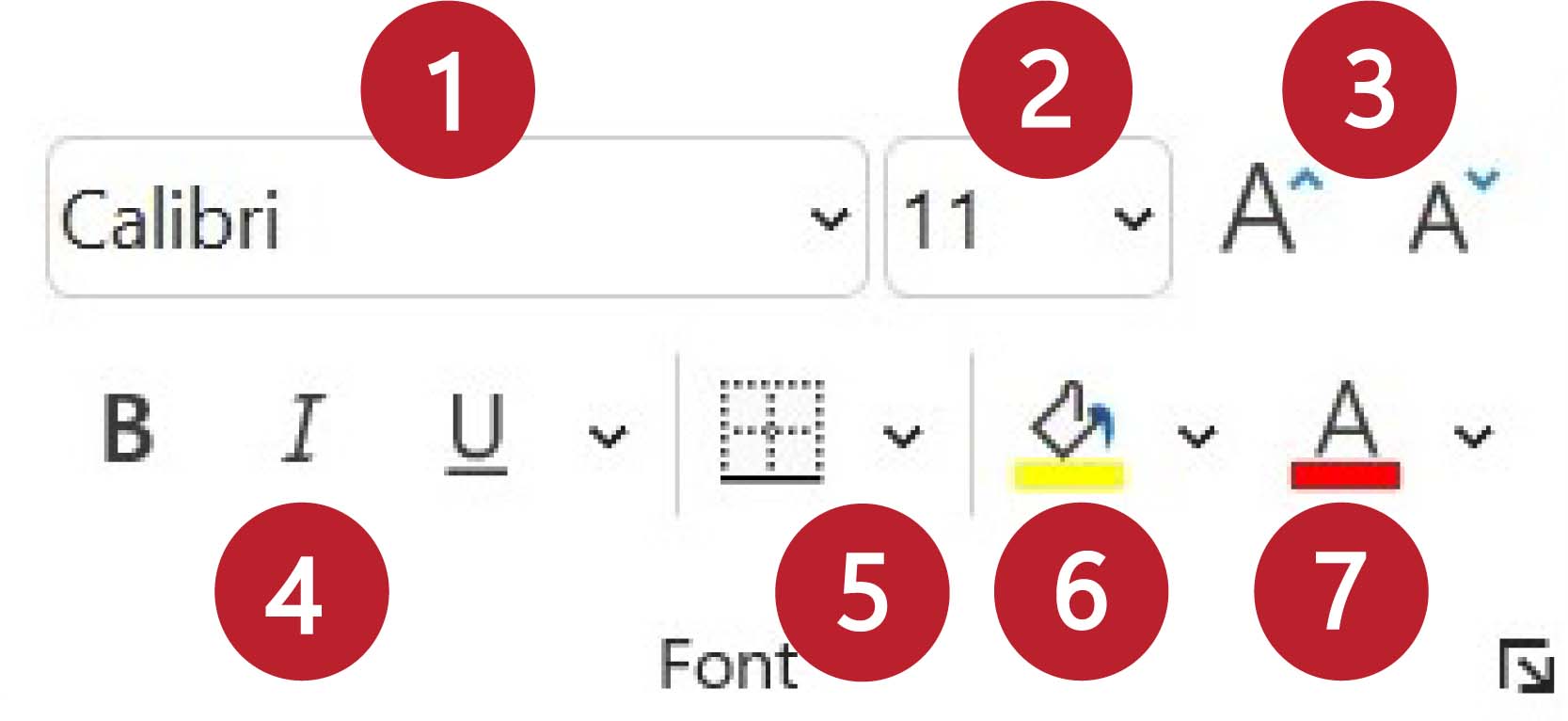 За истицање елемената у табели користимо сегмент команди које се налазе у групи „Font“ (1):
