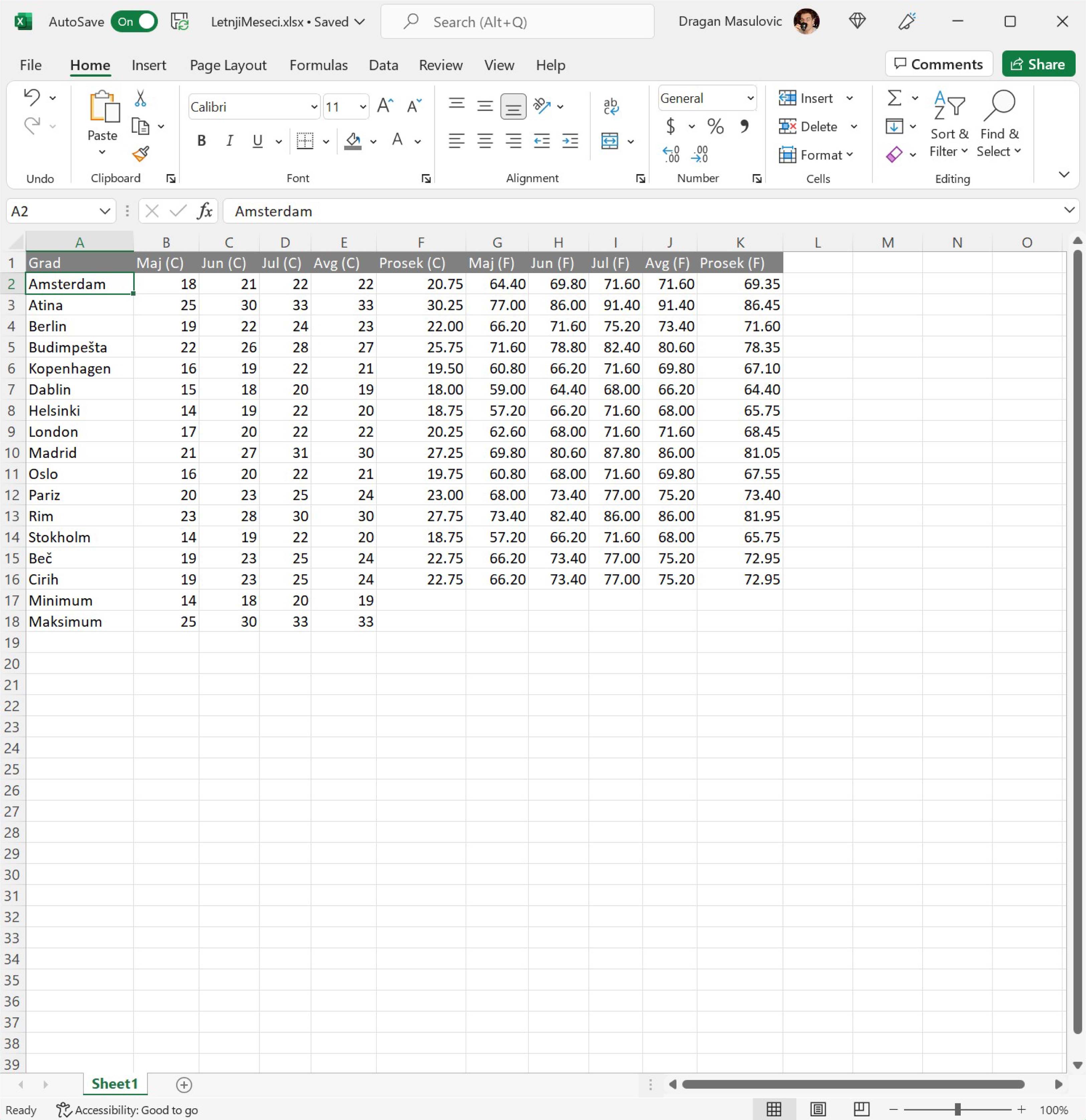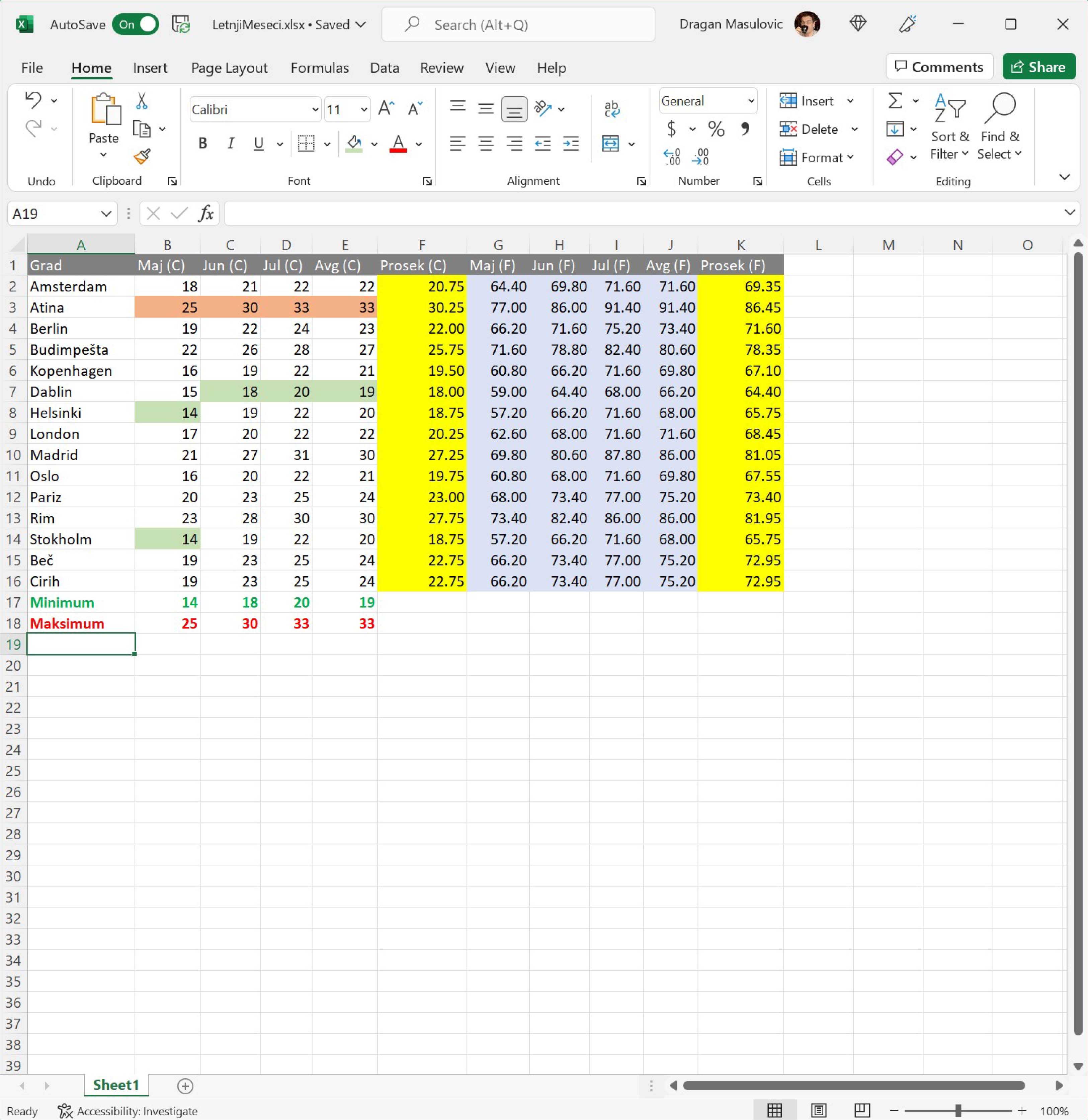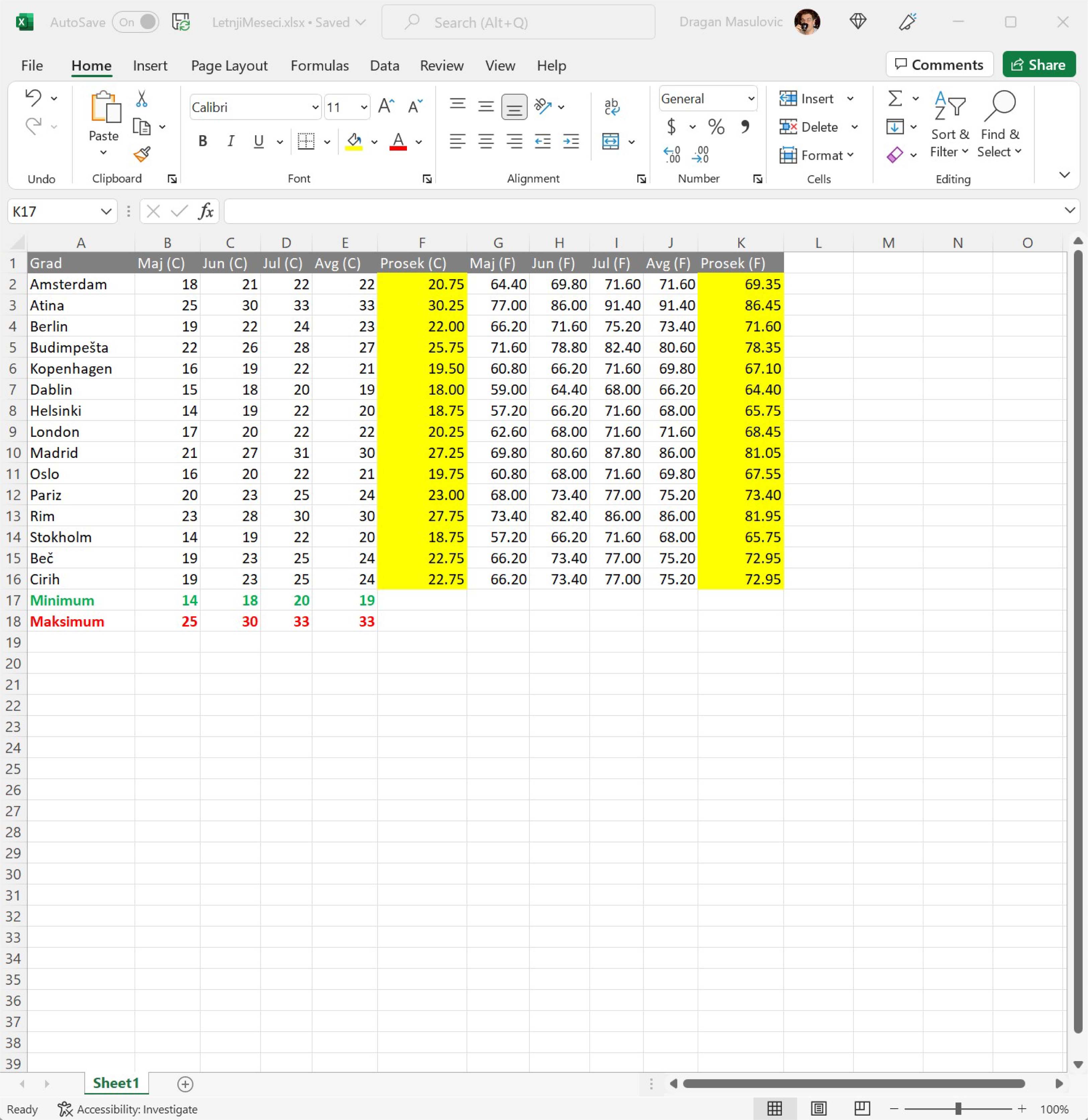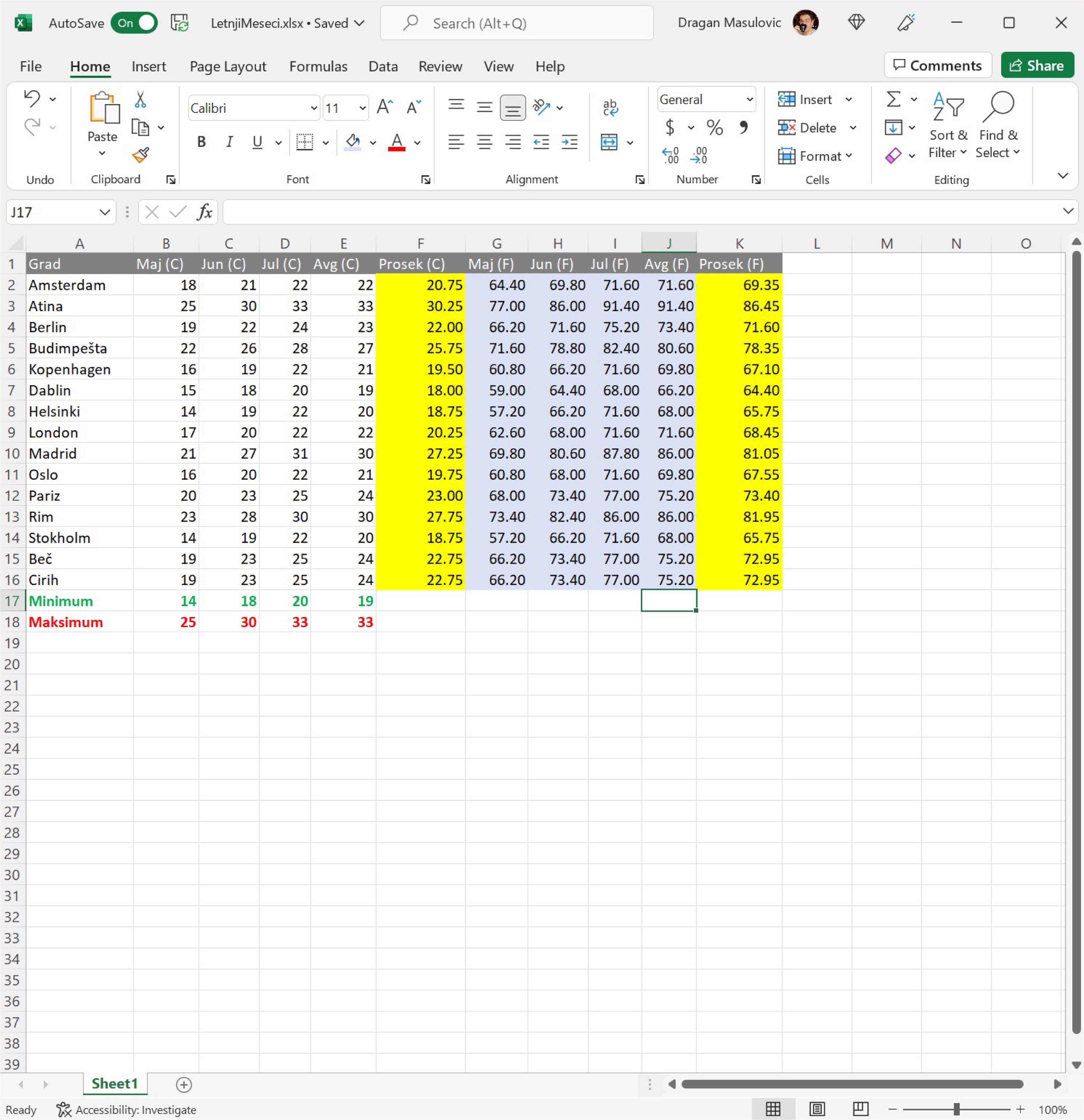 Коначно, у делу табеле B2:E16 где су температуре исказане у степенима Целзијуса: