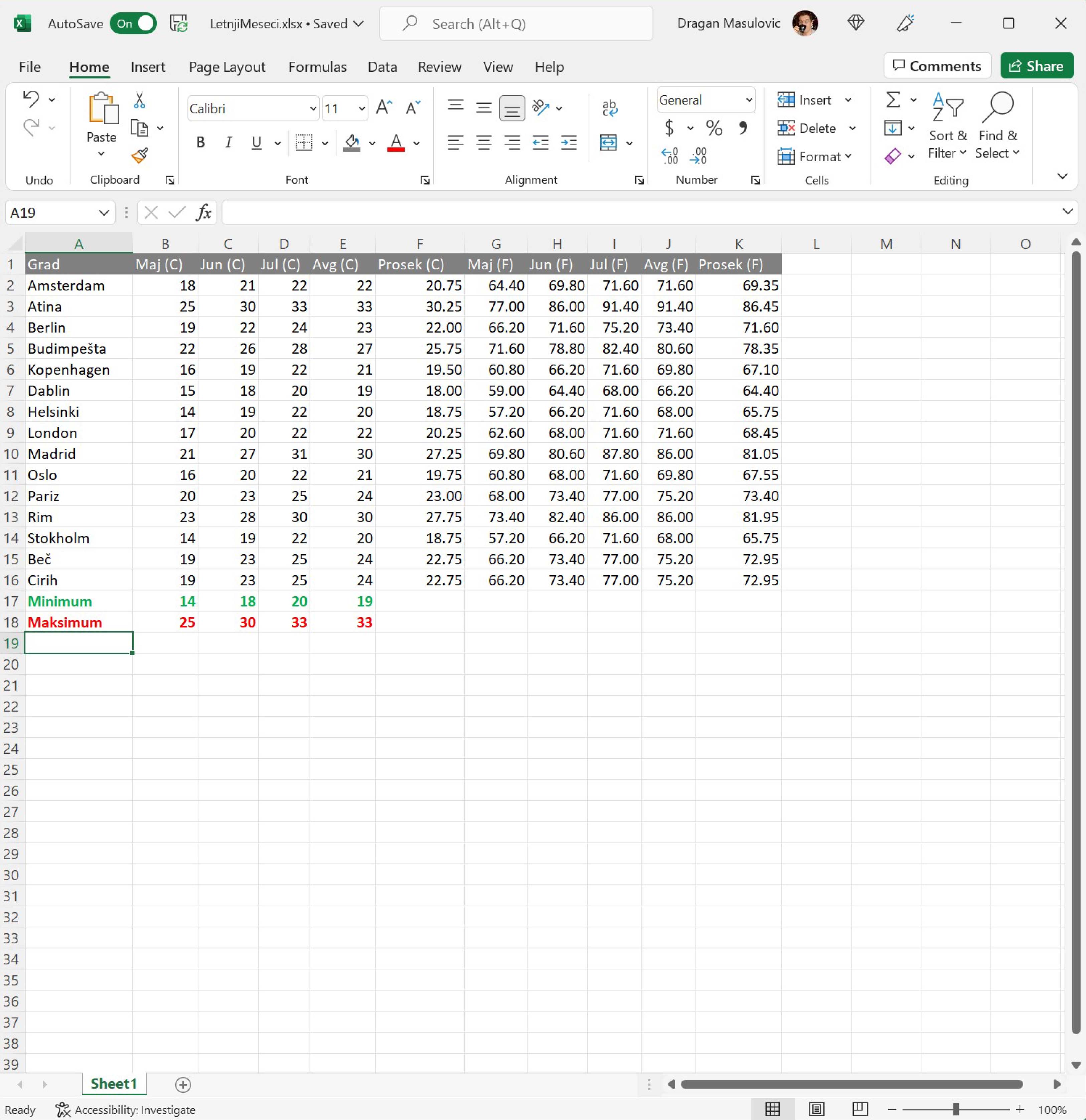 За слова у ћелијама А17:Е18 (минималне и максималне температуре):