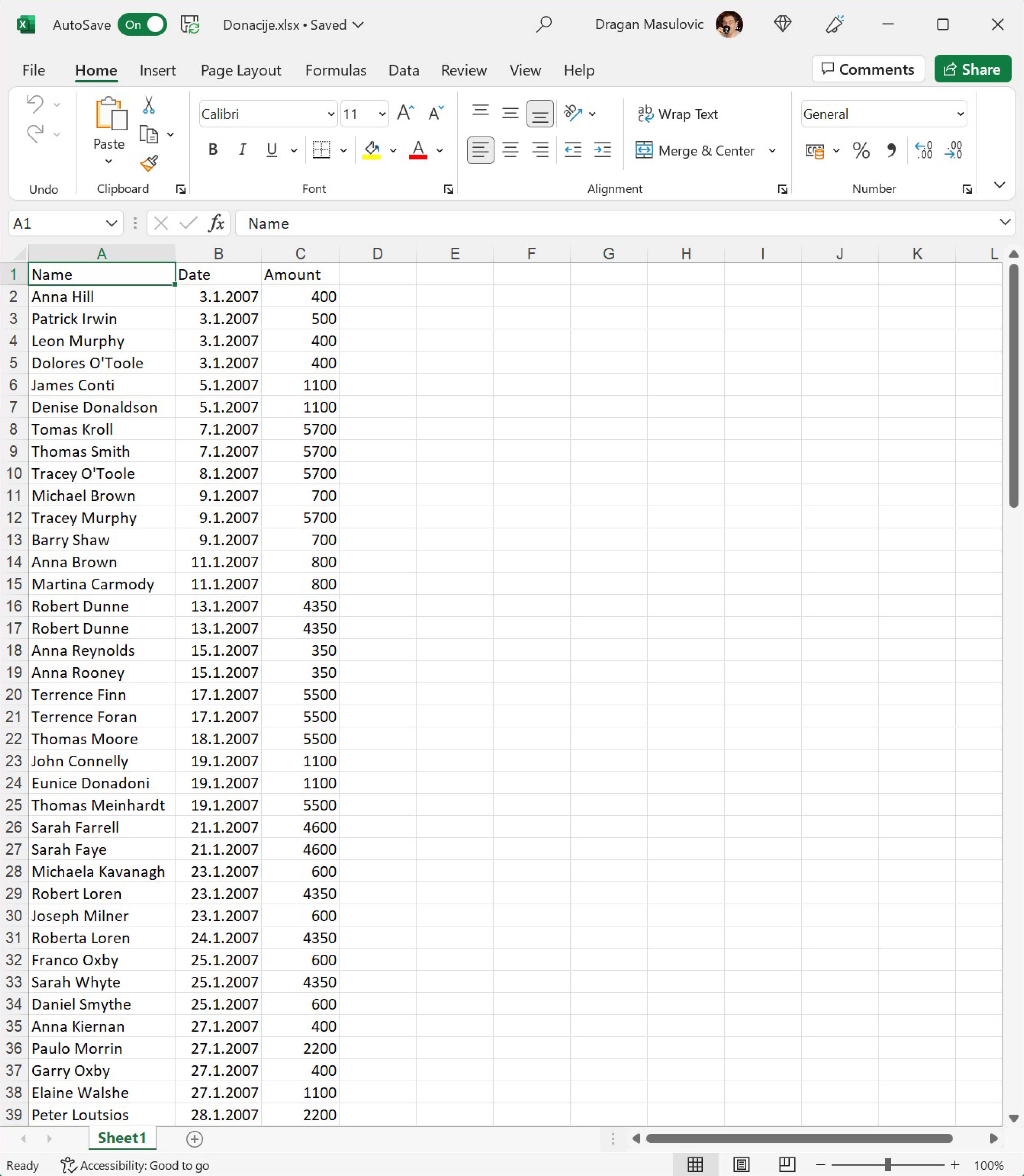 Погледаћемо сада списак донација које је примило једно спортско друштво. За сваку донацију је наведено име донатора (у колони „Name“), датум донације (у колони „Date“) и износ (у колони „Amount“).