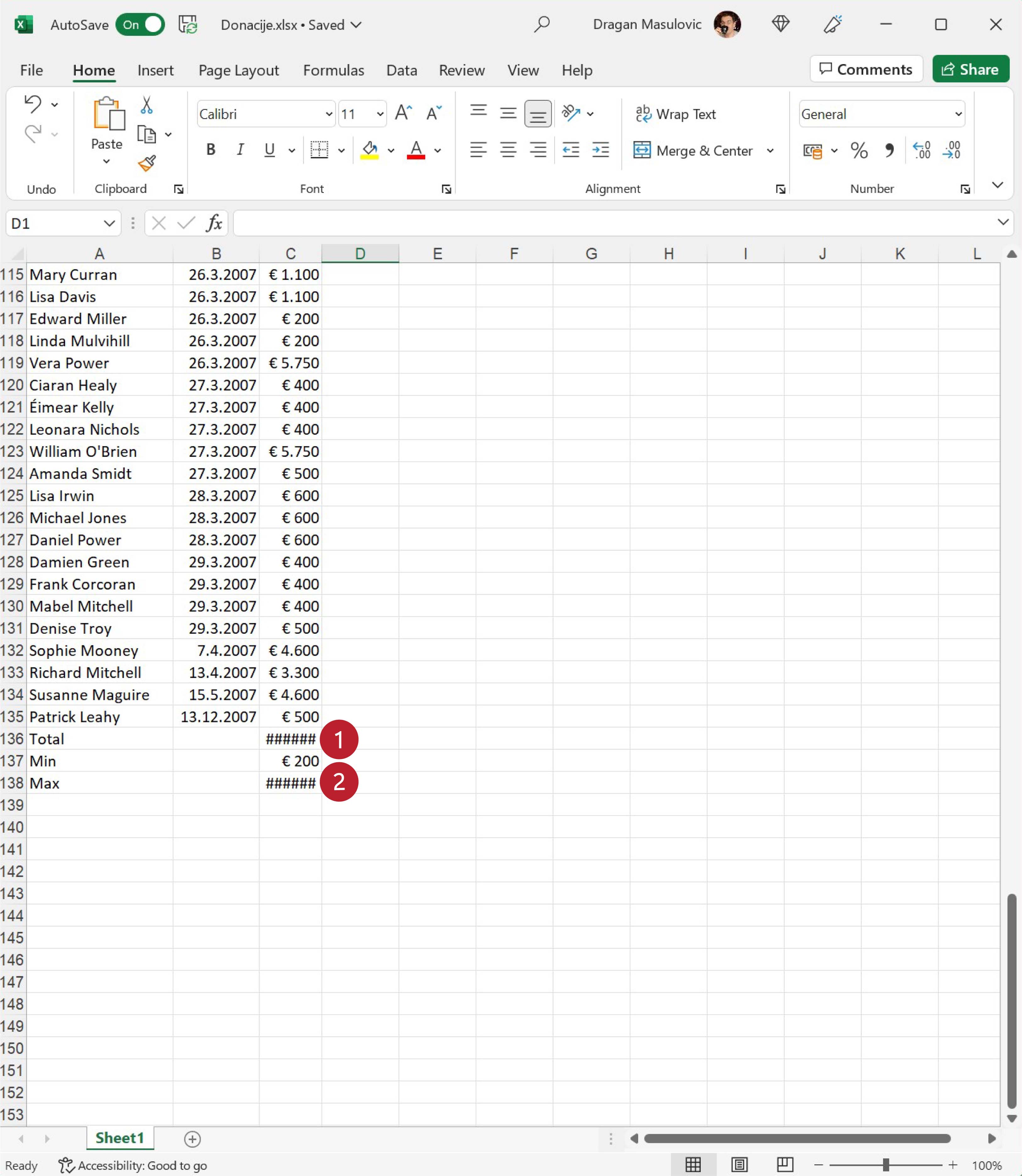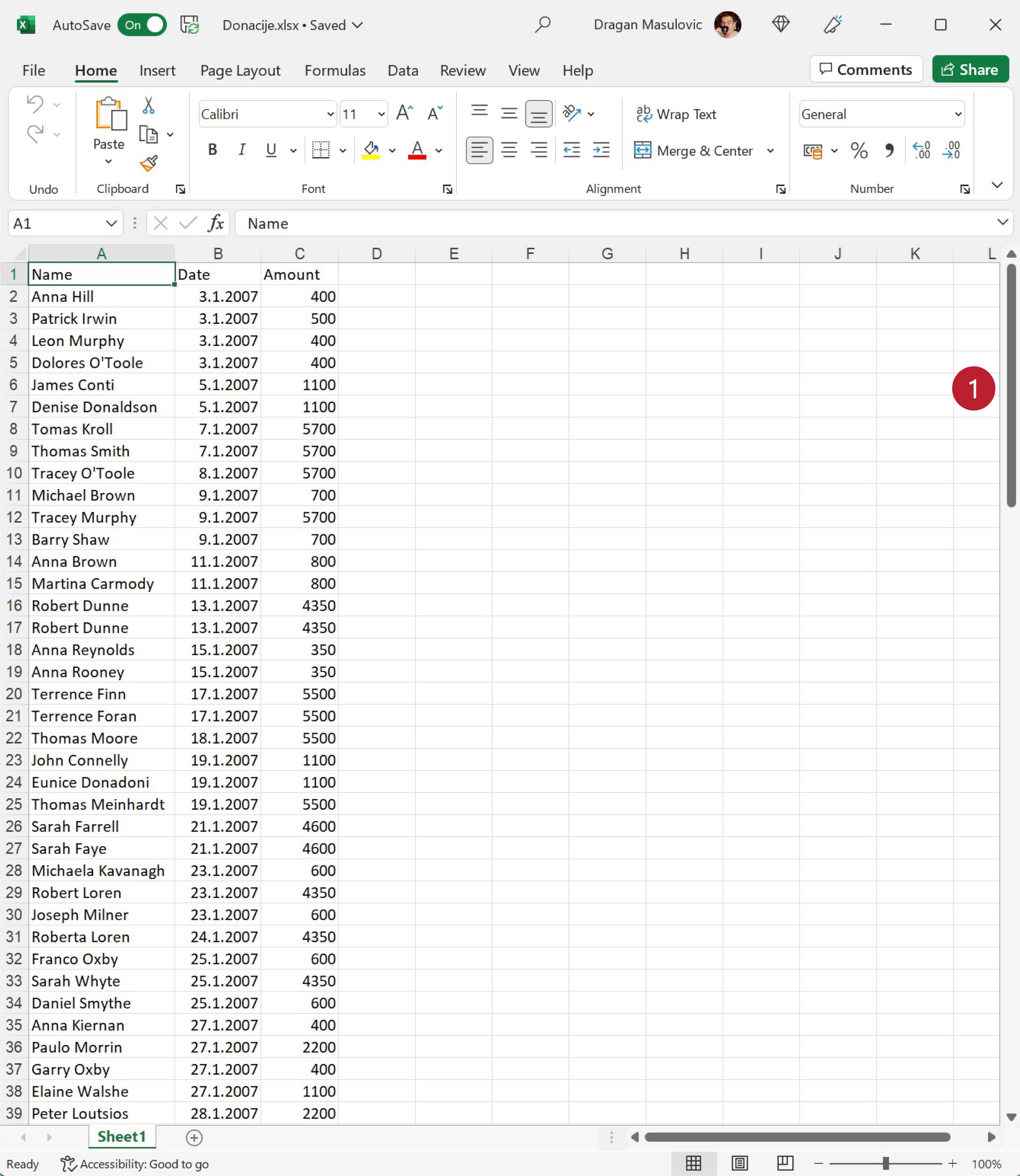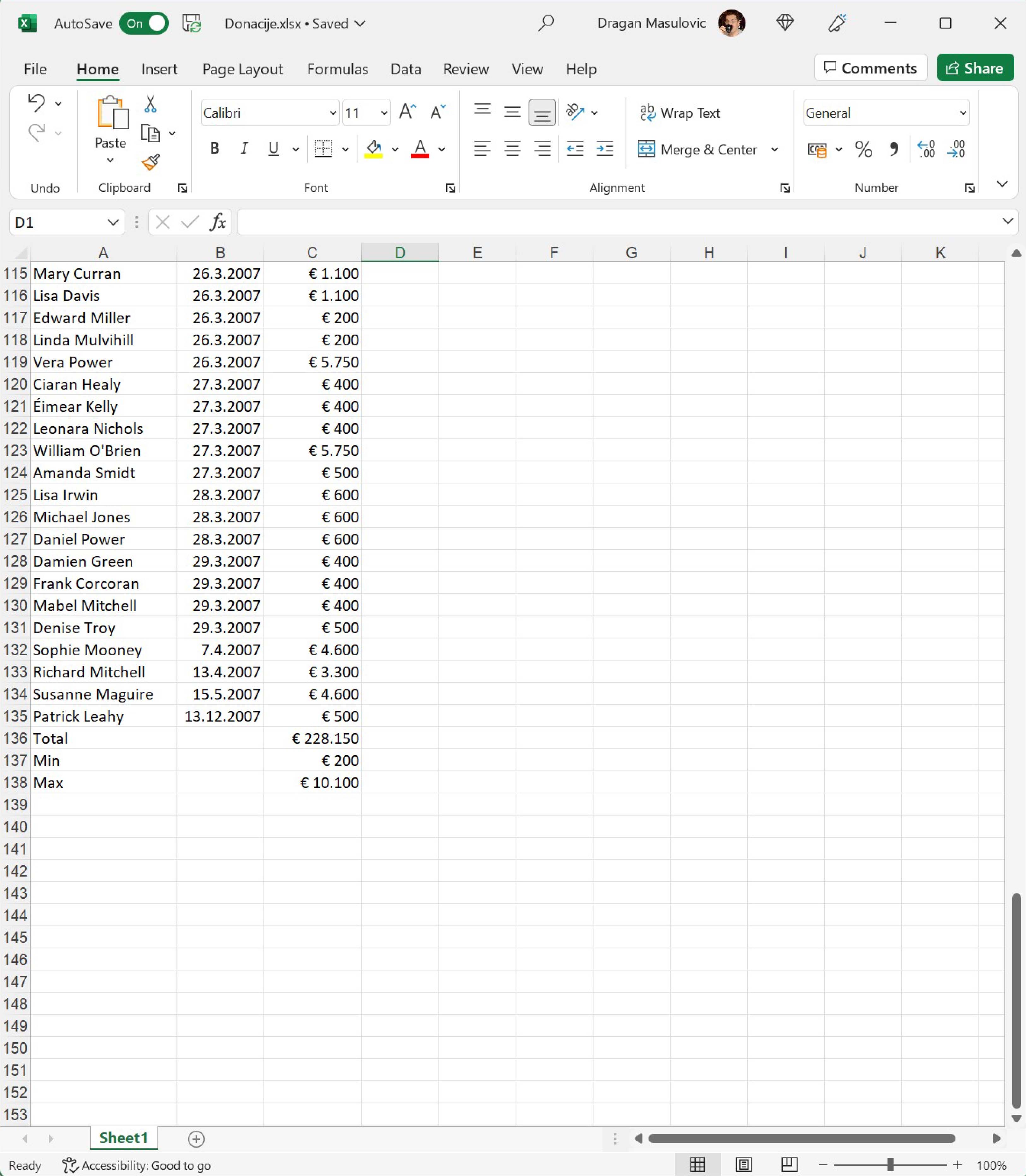 Покрени Ексел и отвори фајл. Видећеш да су у фајлу наведене донације: