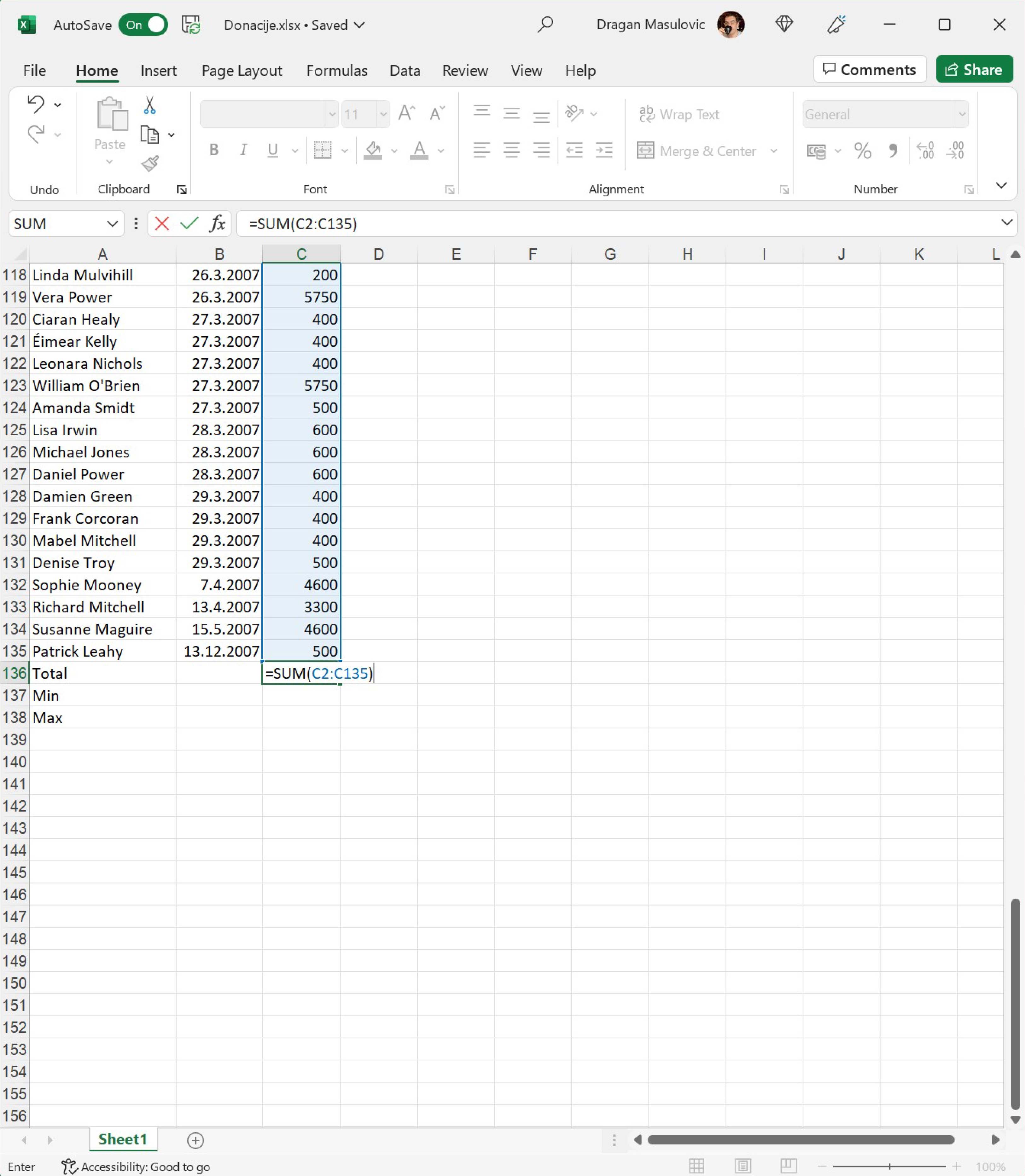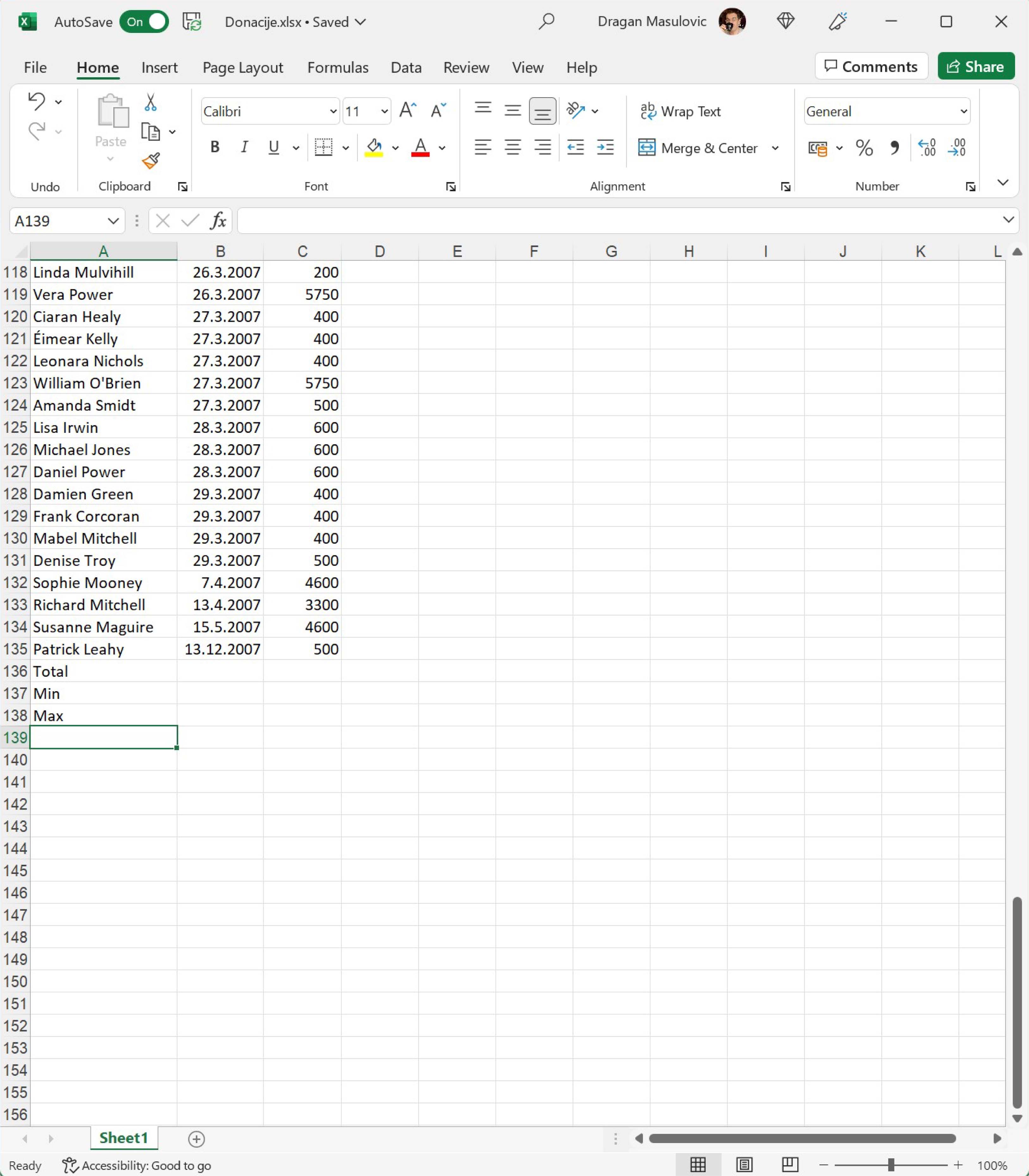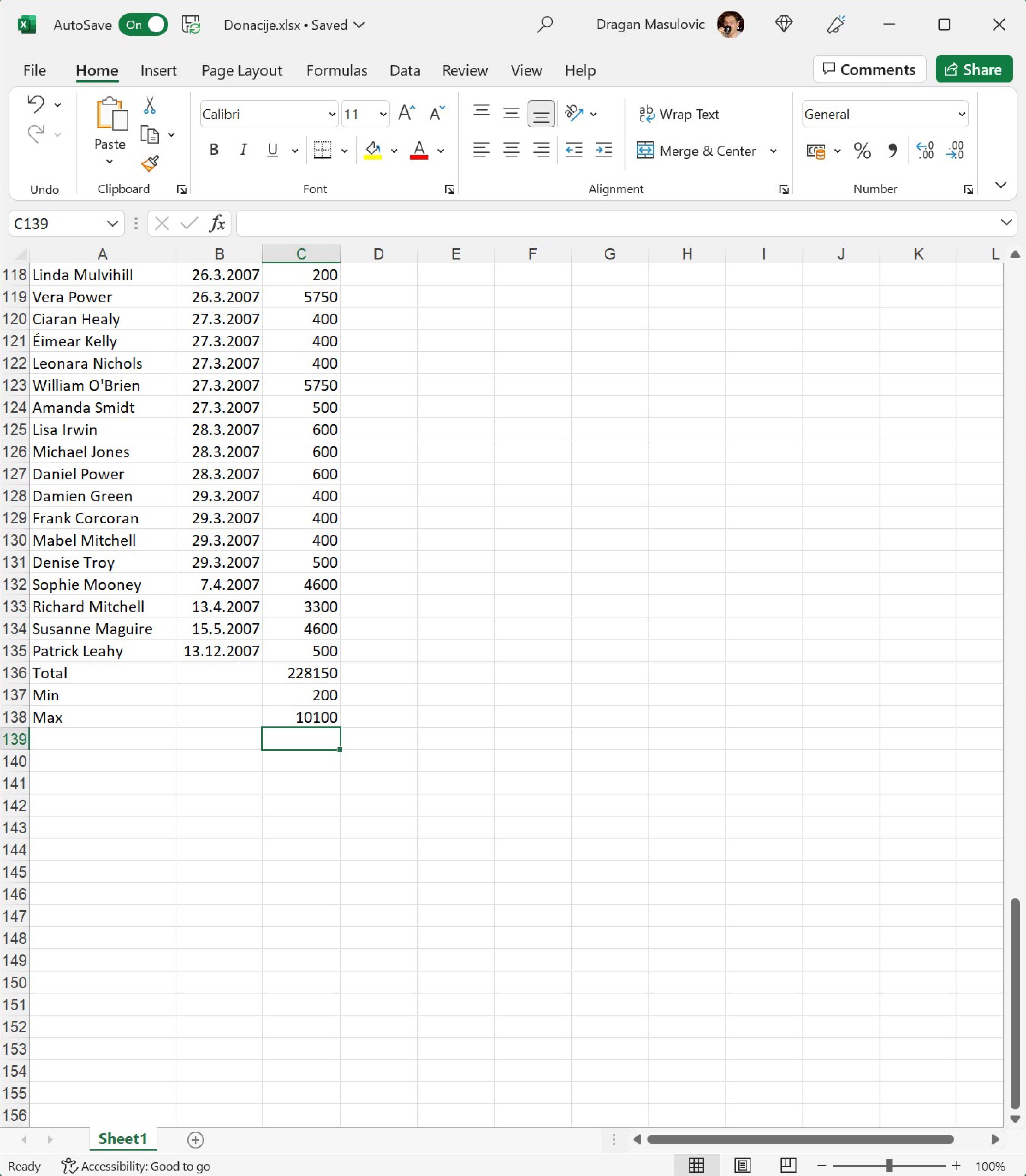 Покрени Ексел и отвори фајл. Видећеш да су у фајлу наведене донације: