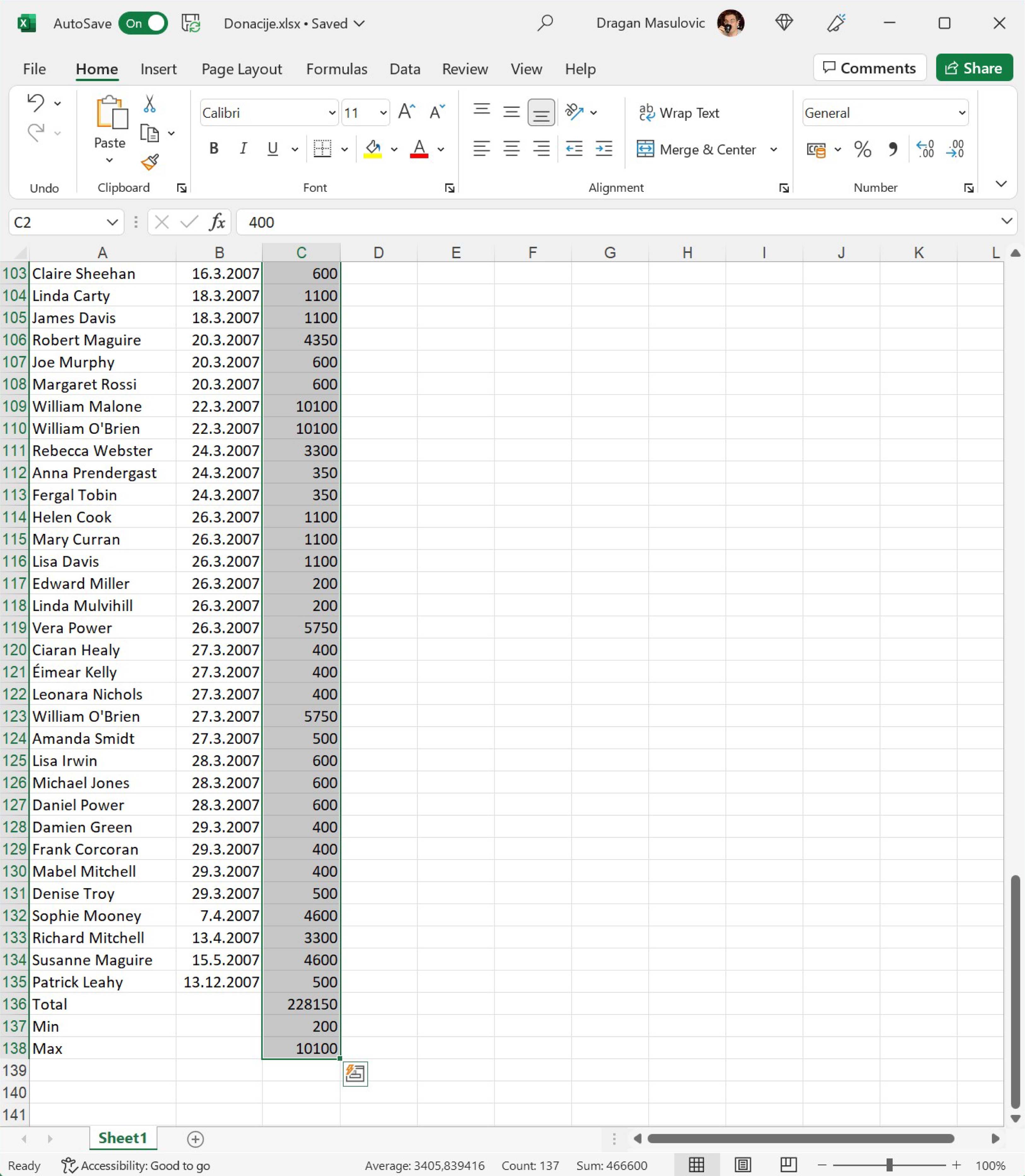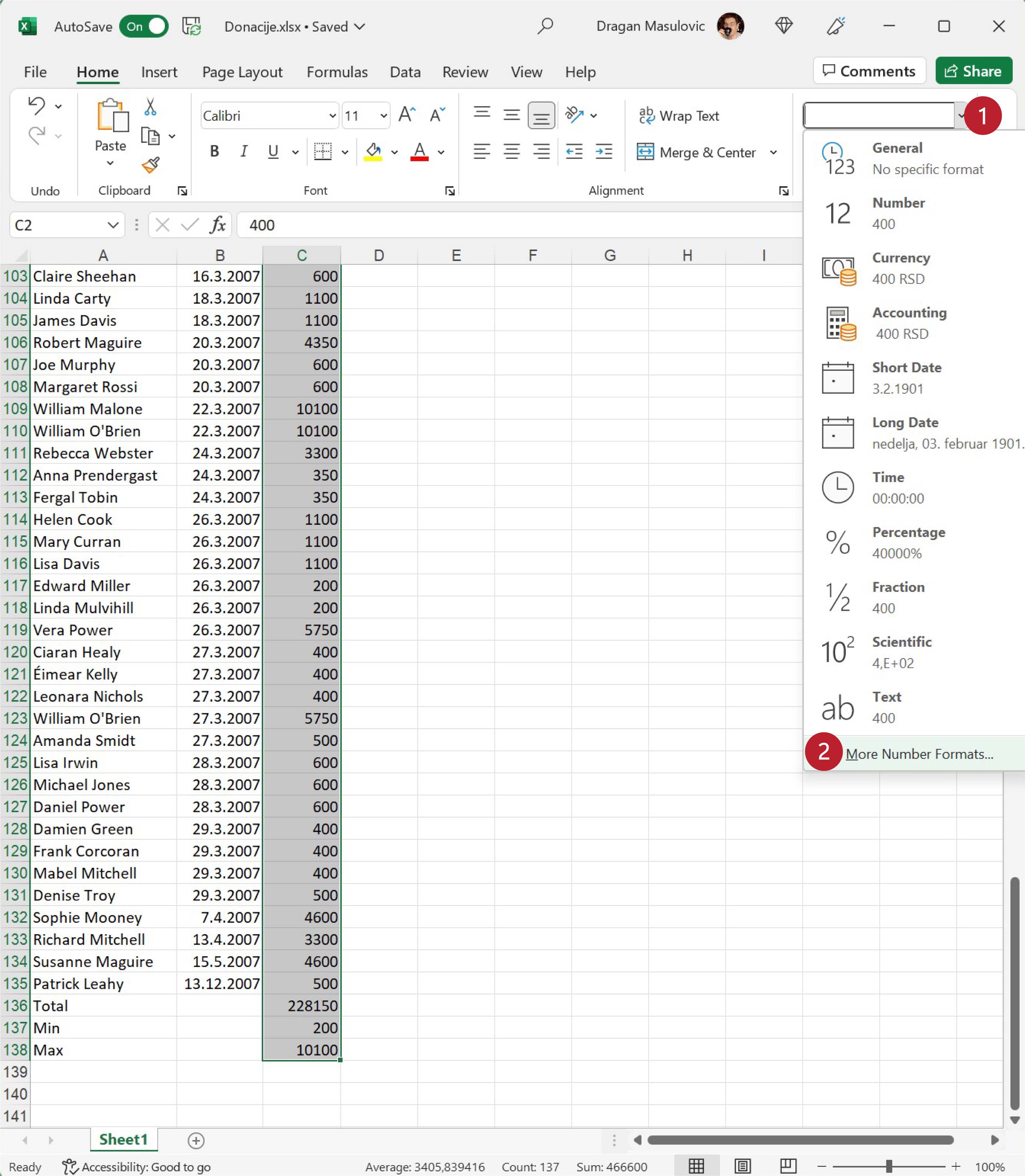 Пошто су све донације биле у еврима, форматираћемо све бројеве у колони C тако да се испред броја појави ознака за евро. Селектуј ћелије C2:C138: