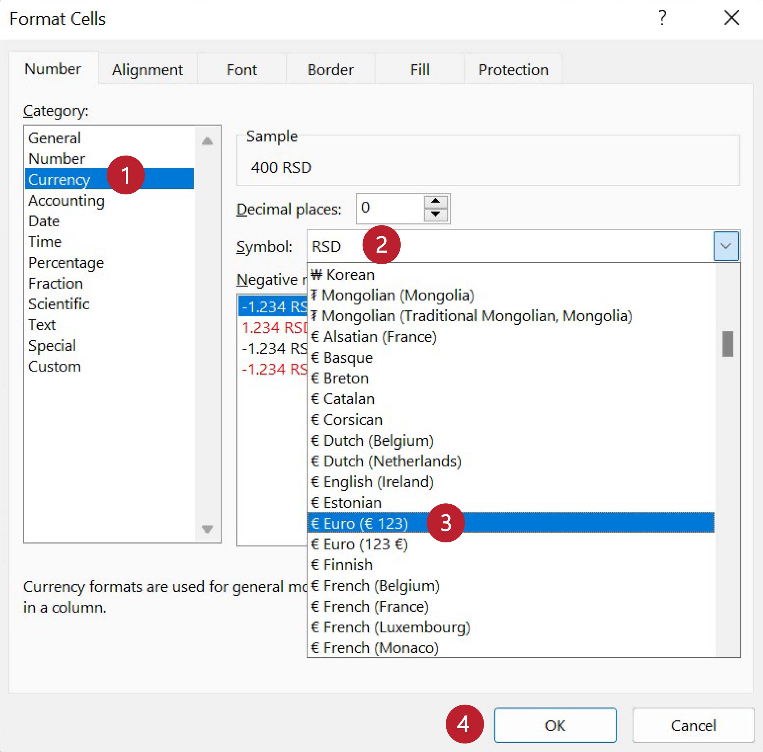 У одељку „Category“ („Категорија“) одаберемо „Currency“ (1). Ексел нам поново нуди симбол за амерички долар или наш динар. Да бисмо променили симбол кликнемо на стрелицу (2) која отвара избор расположивих симбола валута. Тако добијамо листу у којој потражимо симбол за евро. За ово треба стрпљења јер симбол за евро уопште није близу врха. Одаберемо симбол за евро (3) и кликнемо ОК (4).
