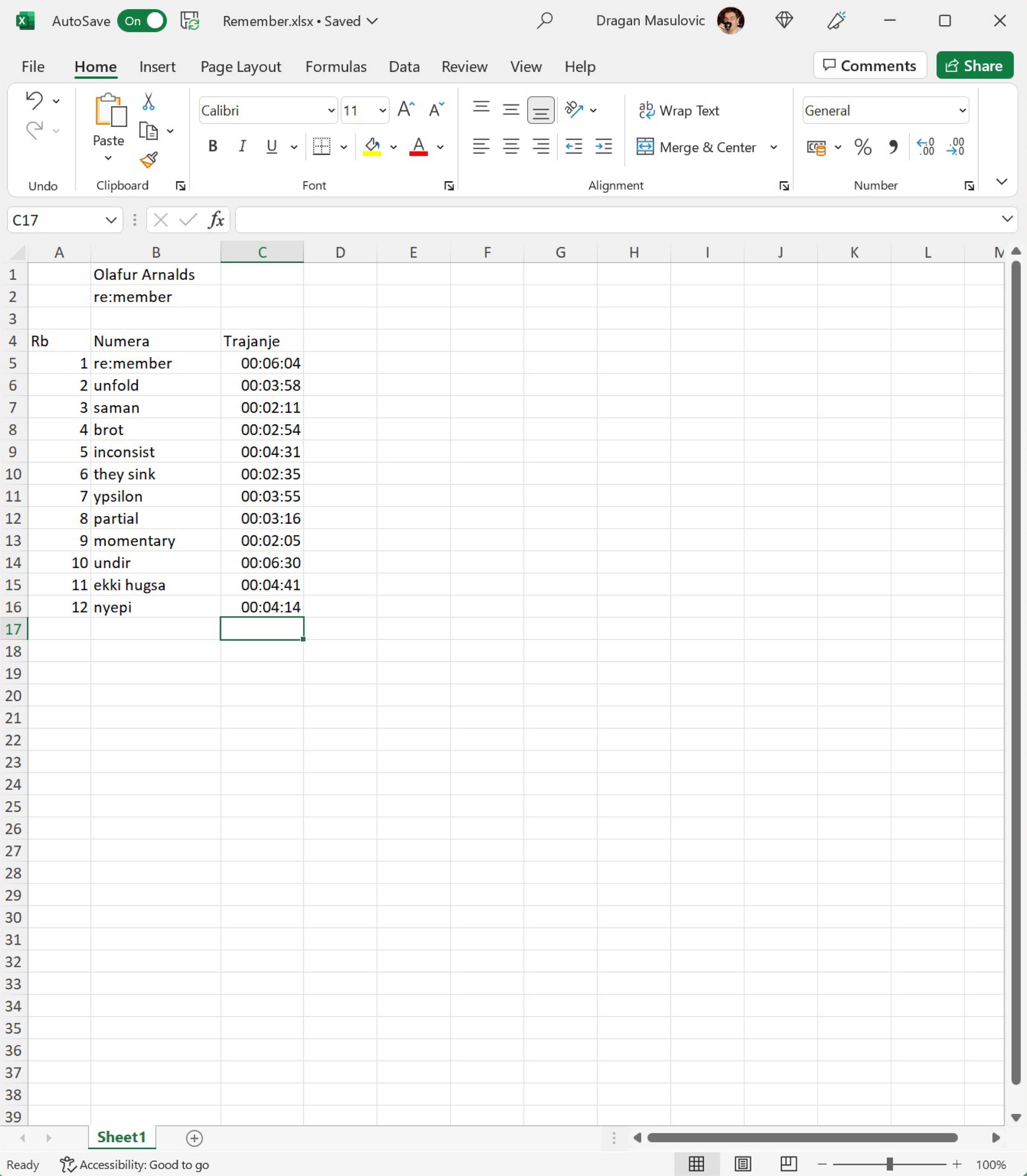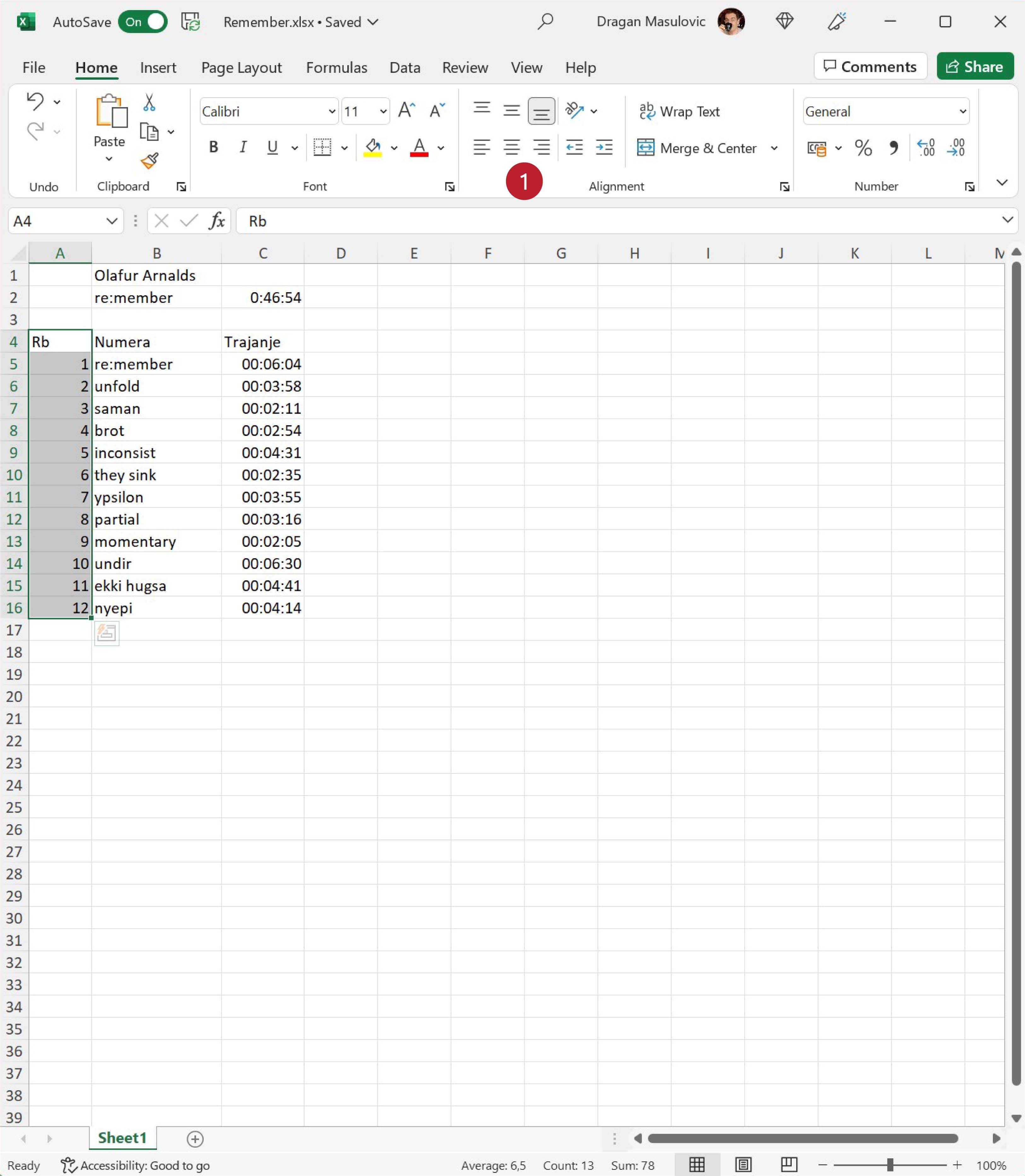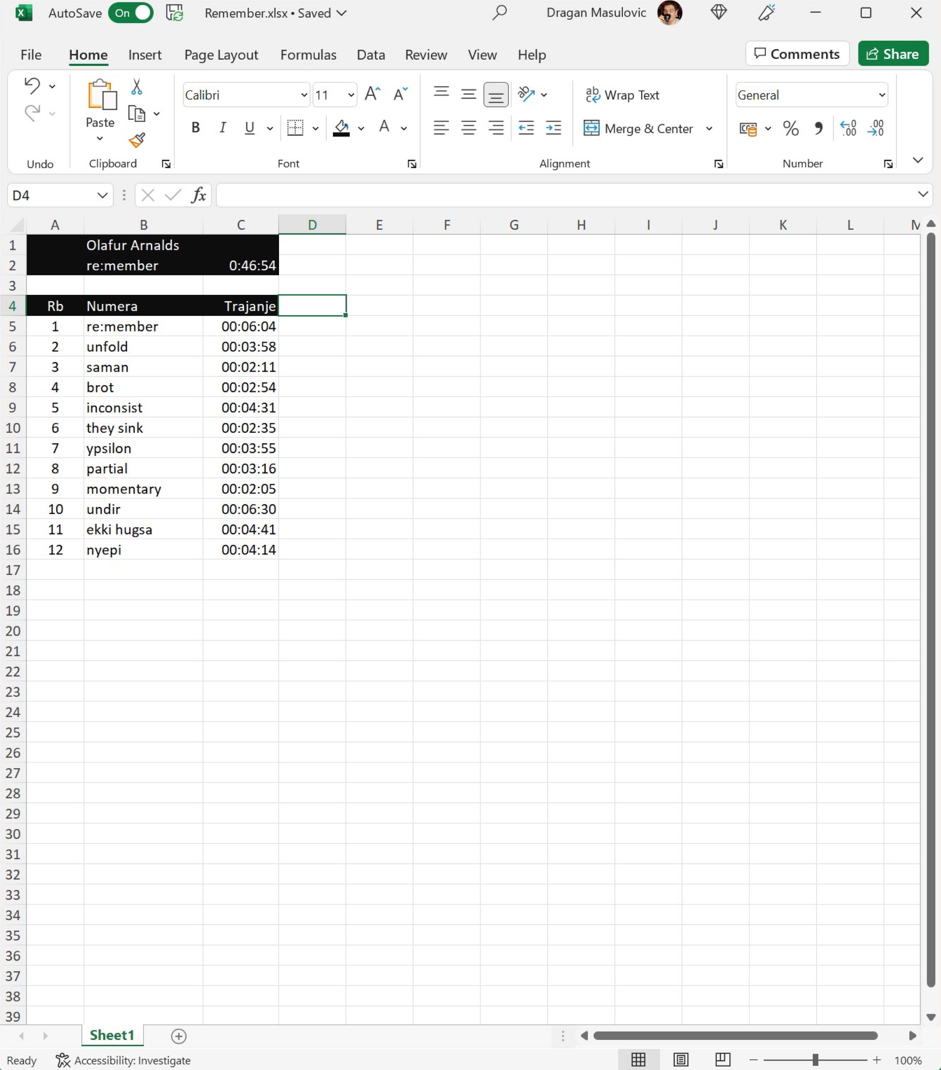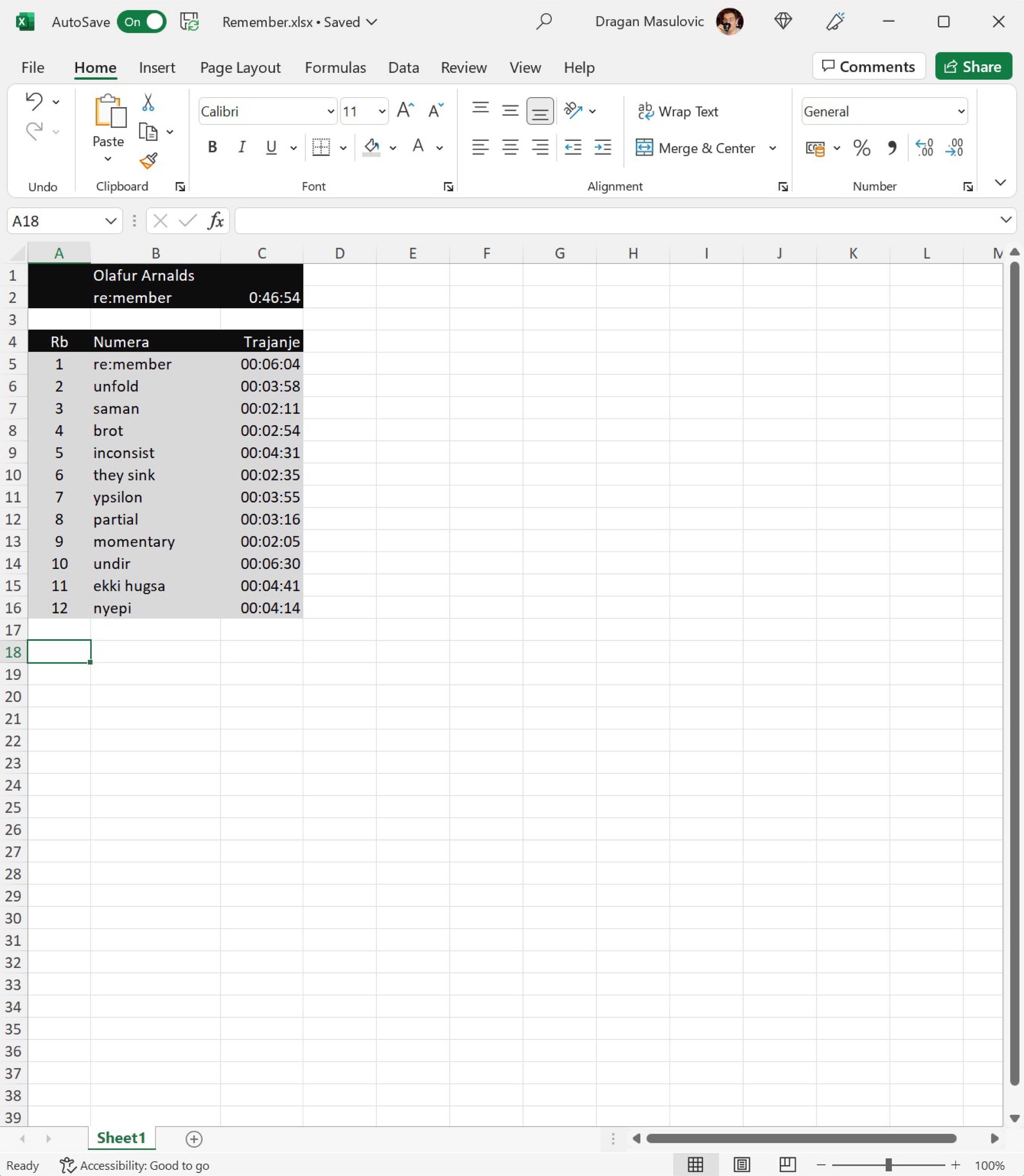Са следећег линка Remember.xlsx преузми датотеку која садржи имена нумера, покрени Ексел и учитај датотеку: