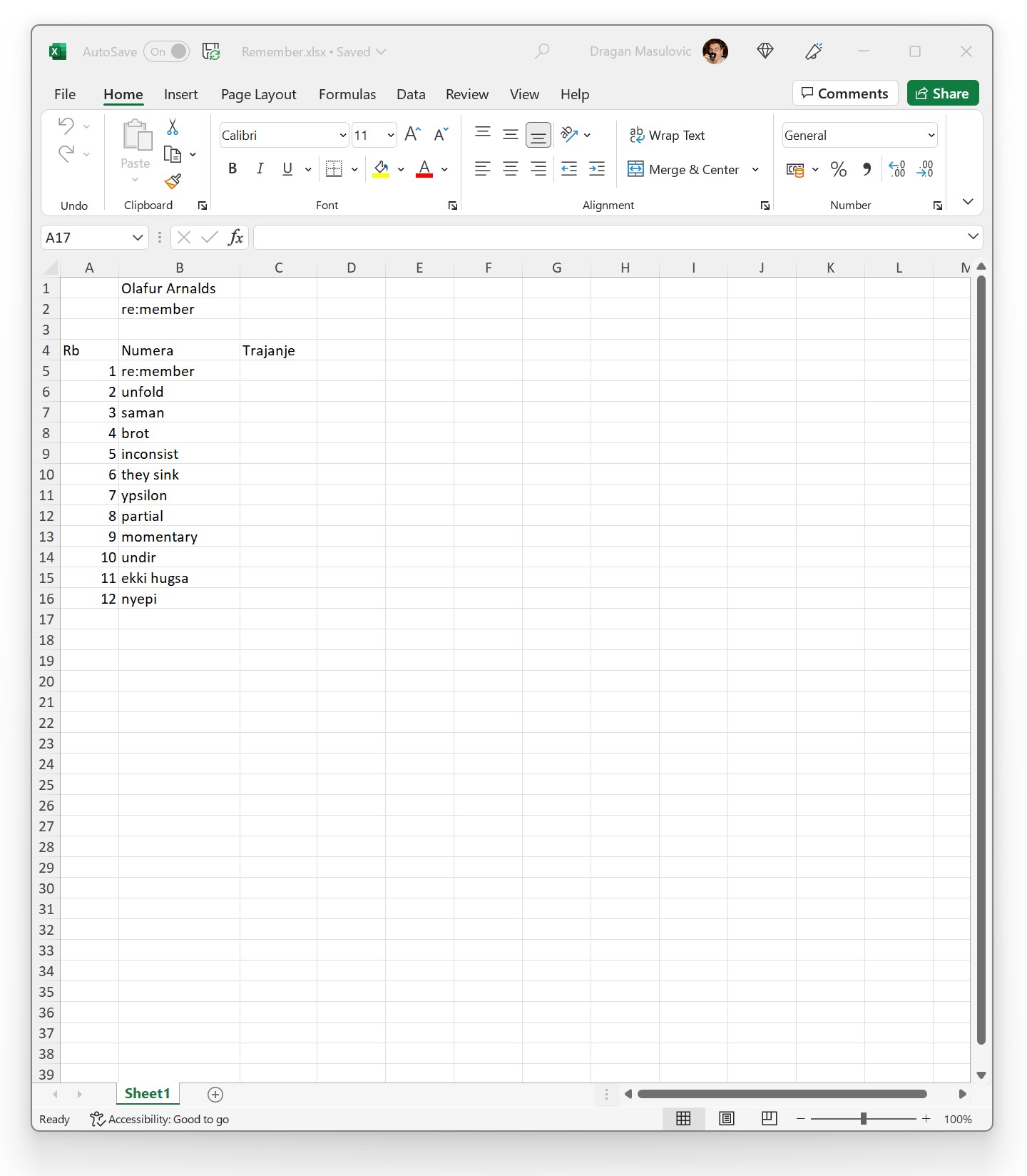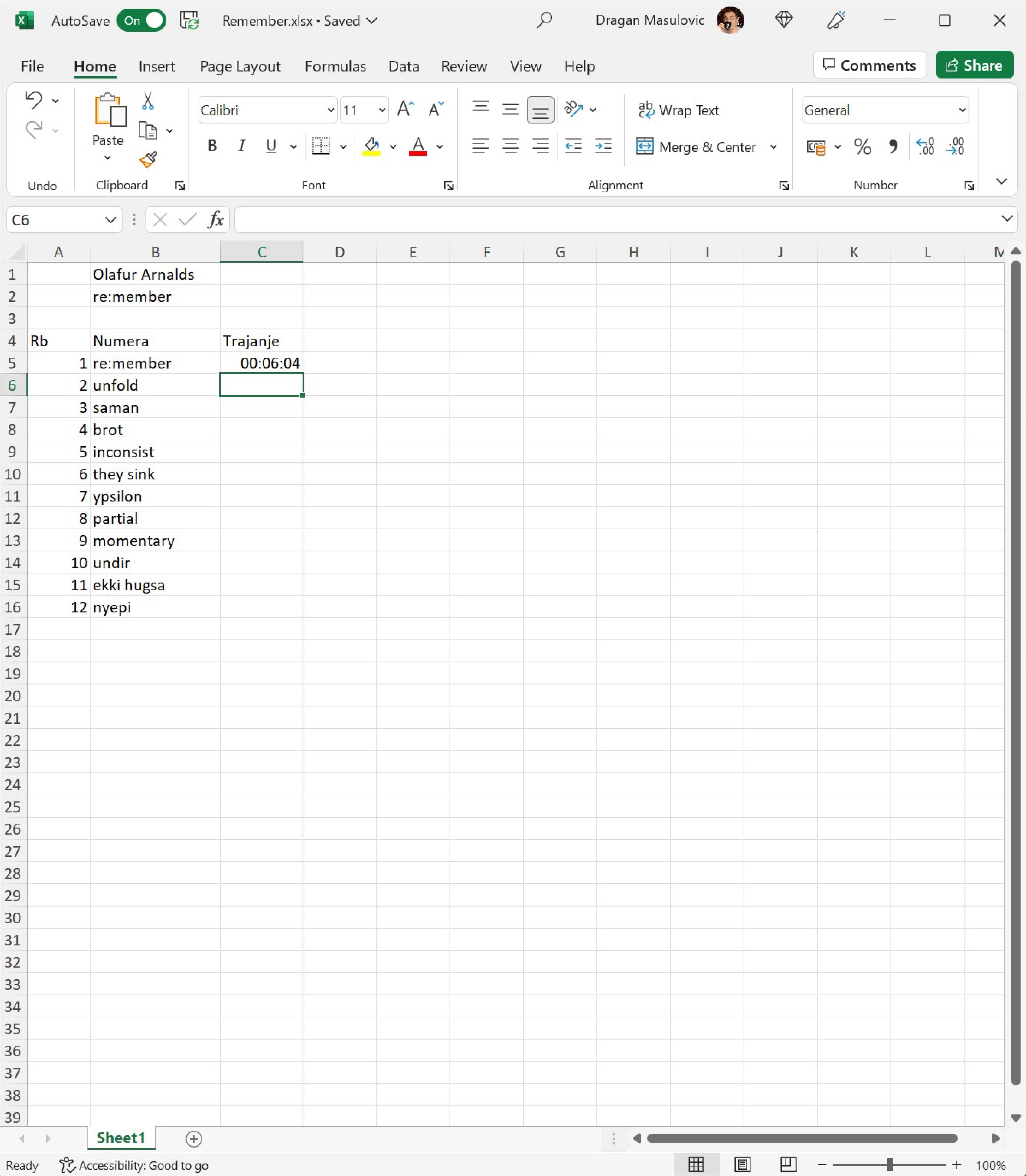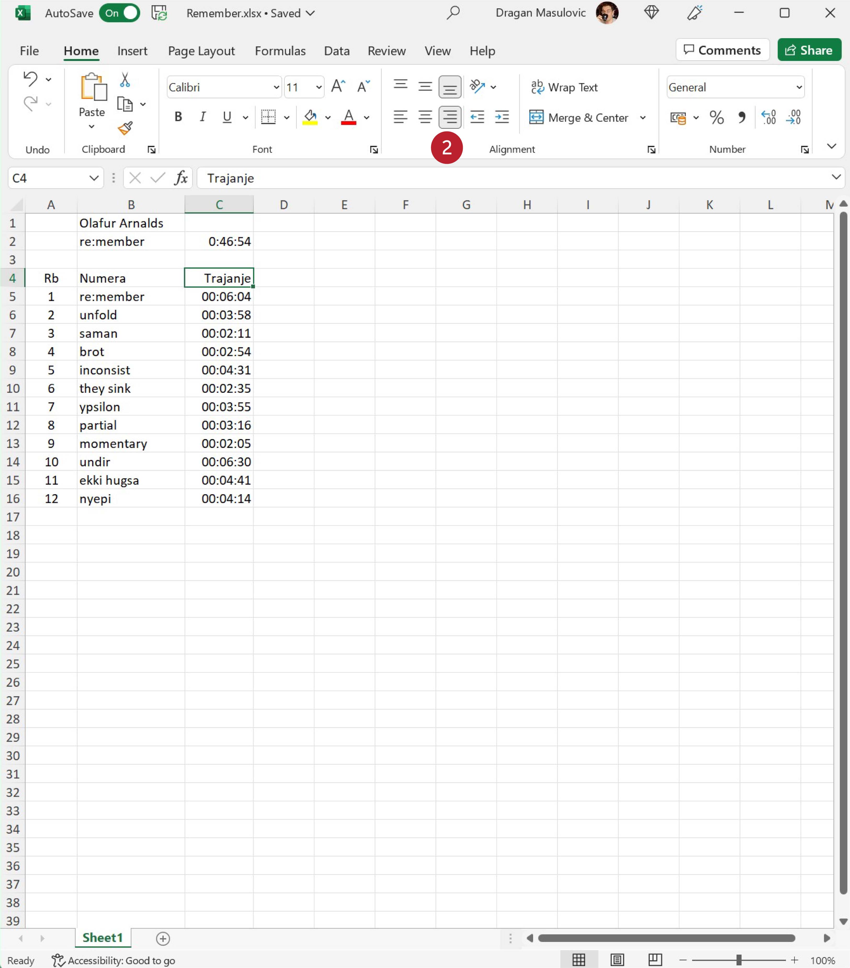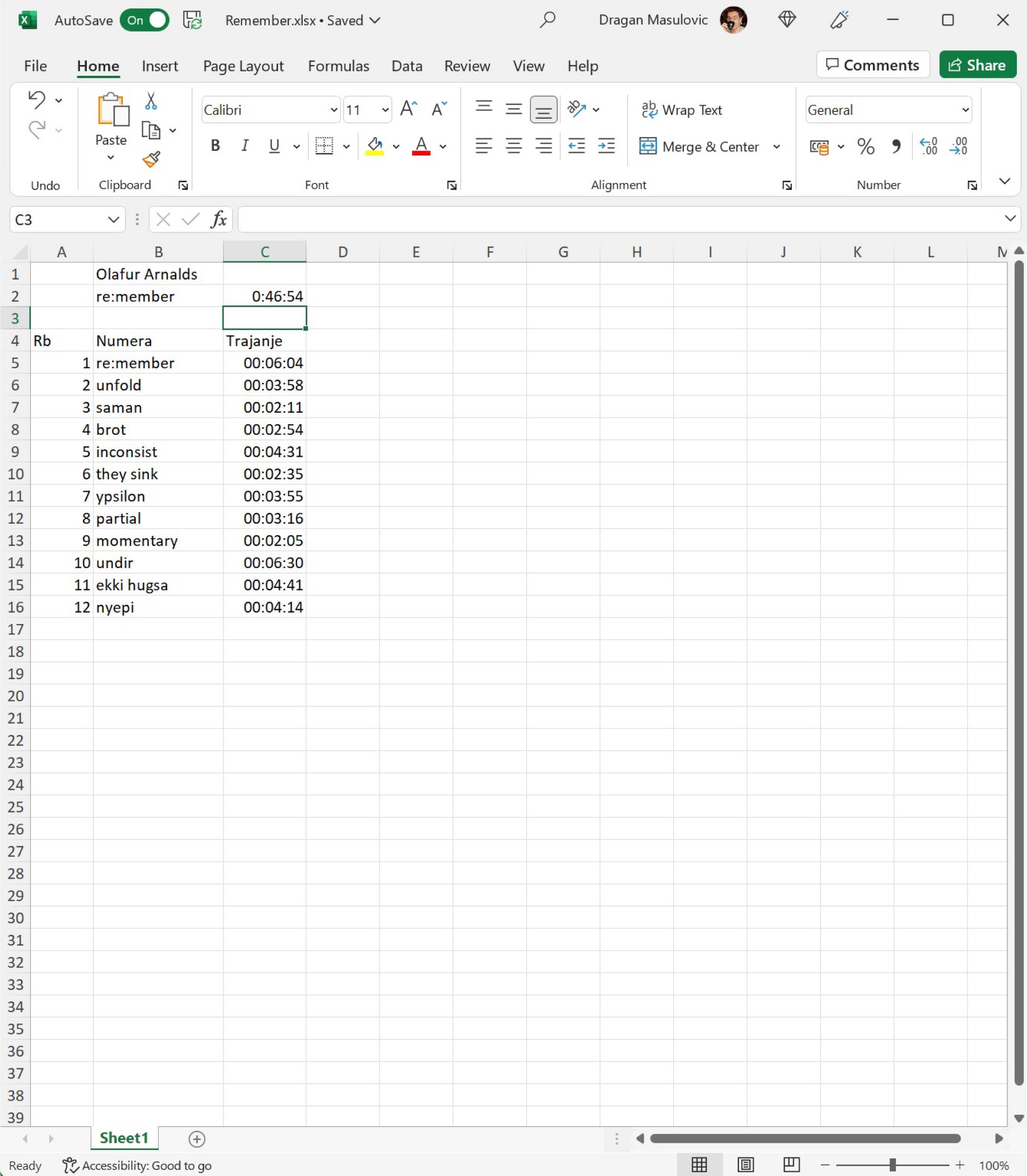 Са следећег линка Remember.xlsx преузми датотеку која садржи имена нумера, покрени Ексел и учитај датотеку: