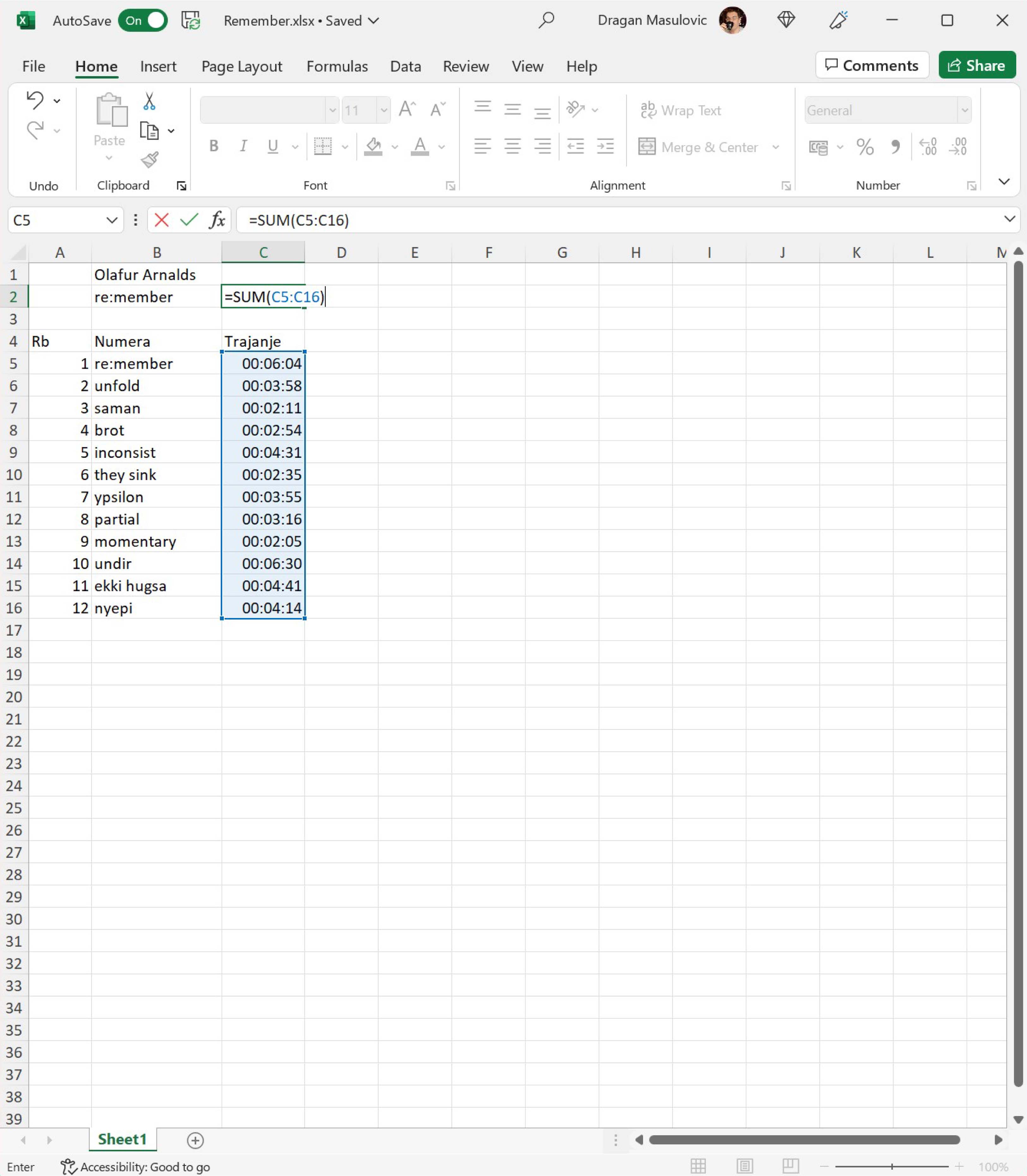 Ексел је сабрао трајање свих нумера и у поље уписао трајање целог албума:
