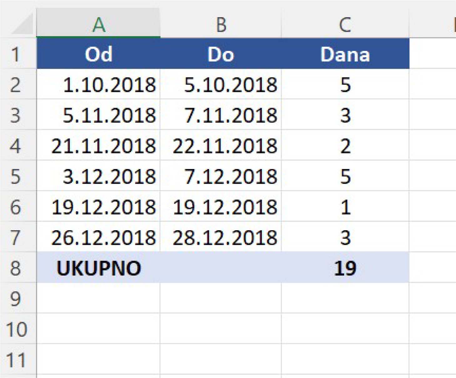У последњи ред табеле у колону „Od“ упиши „Ukupno“ и онда у колони „Dana“ израчунај колико je укупно одсуствовање корисећи формулу сличну овој:
