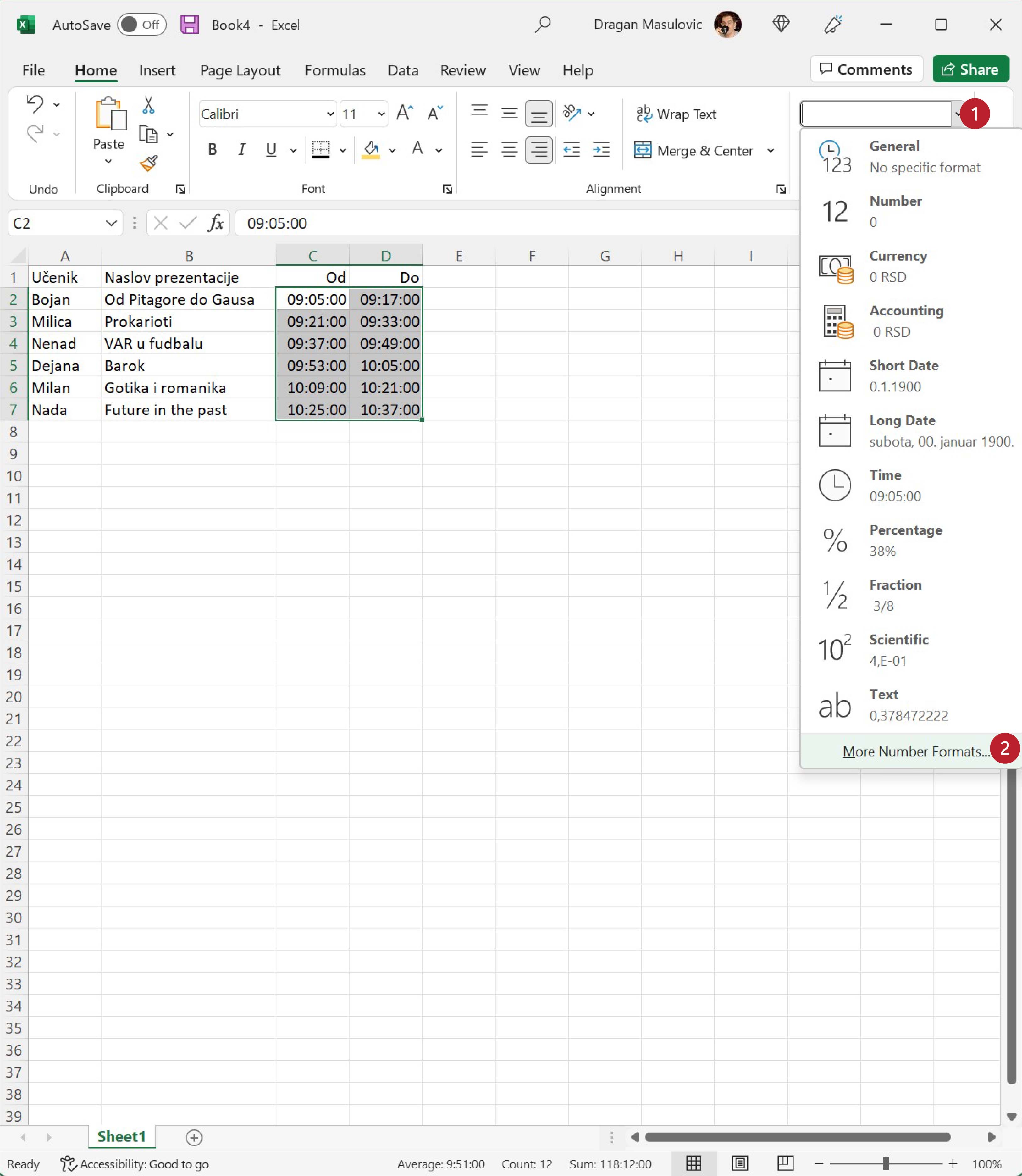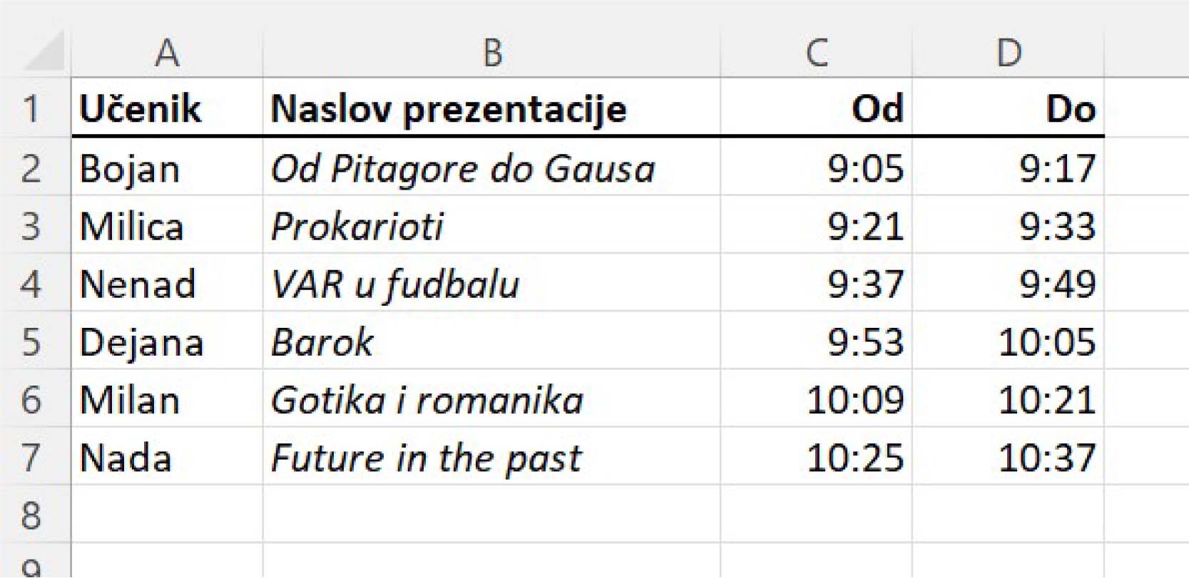 Први ученик креће са излагањем у 9:05 часова. Сваки ученик има 12 минута за излагање презентације, и предвиђено је 4 минута паузе између два излагања. Ако знаш када је ученик почео са излагањем, крај излагања ћеш добити тако што ћеш, на пример у ћелију D2 унети формулу: