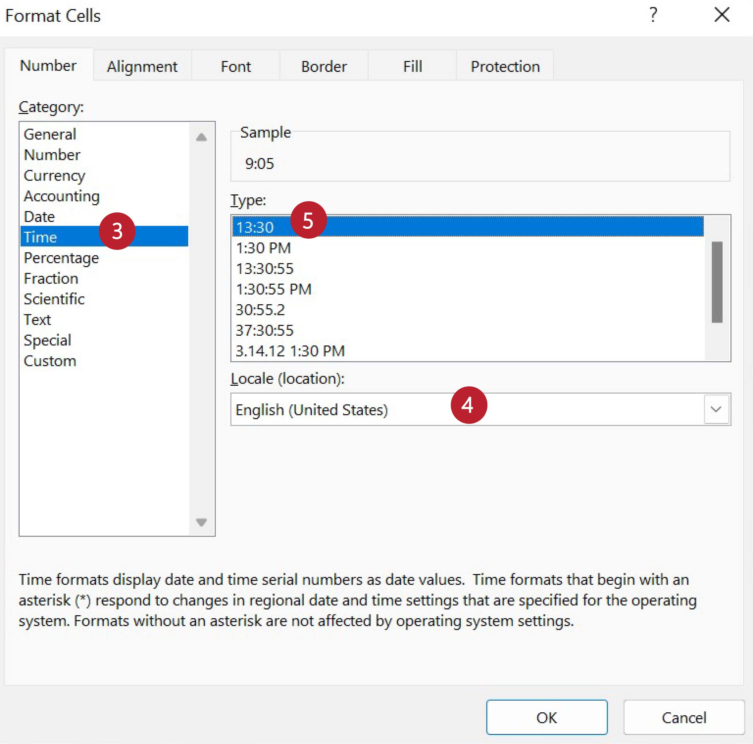 У листи „Category“ одабери „Time“, у листи „Locale“ одабери „English (United States)“, па онда у листи „Type“ одабери „13:30“, што представља пример формата: