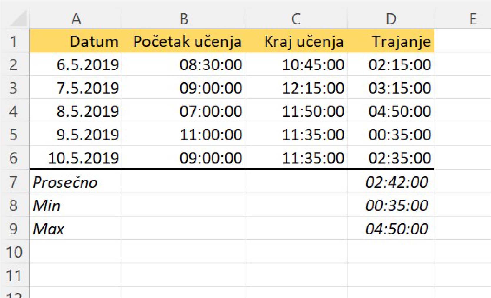 У табелу унеси податке о томе када је ученик почео да учи и када је завршио учење за неколико дана. Онда за сваки дан израчунај колико времена је провео учећи. На крају табеле додај табели редове који се зову: