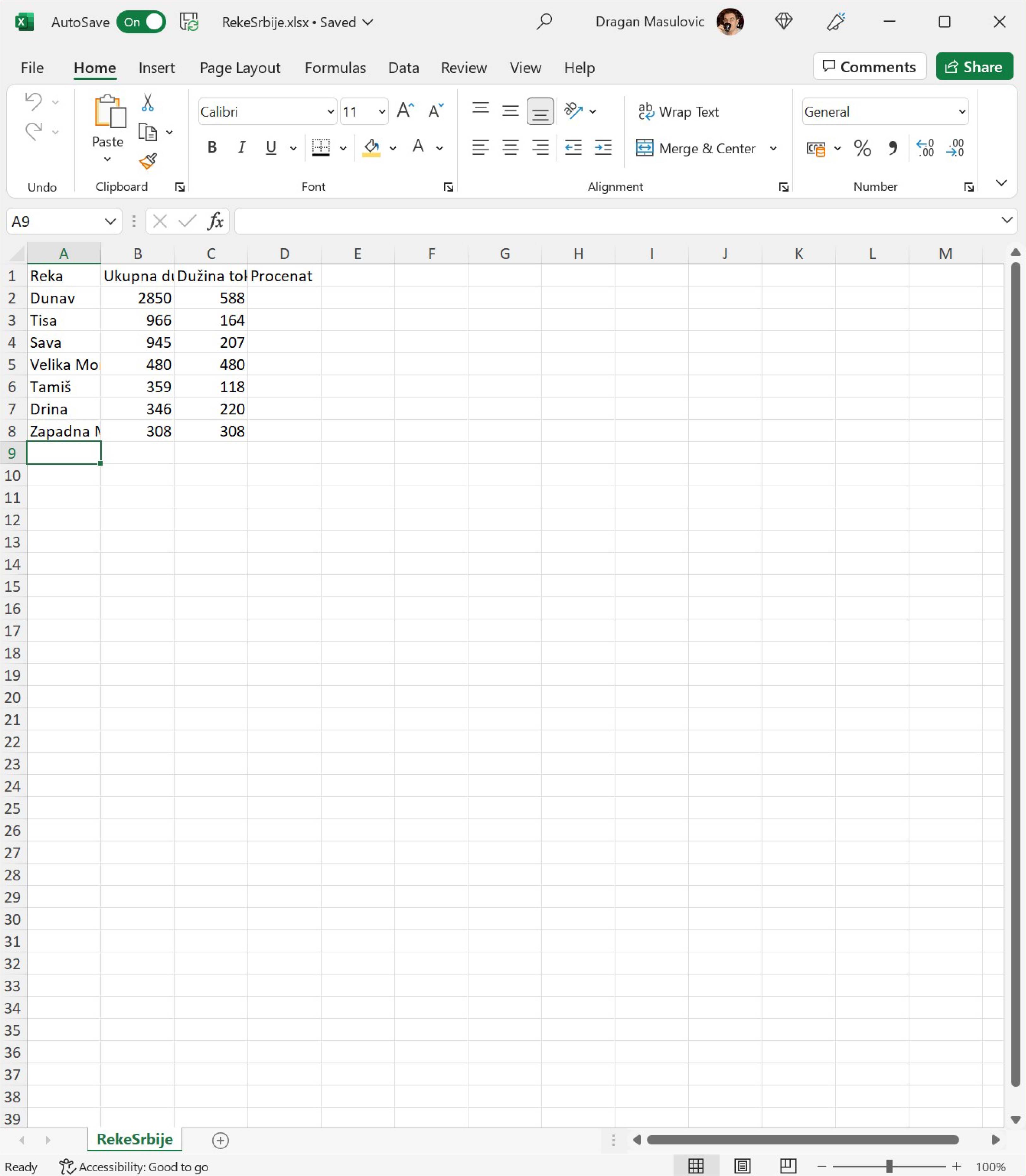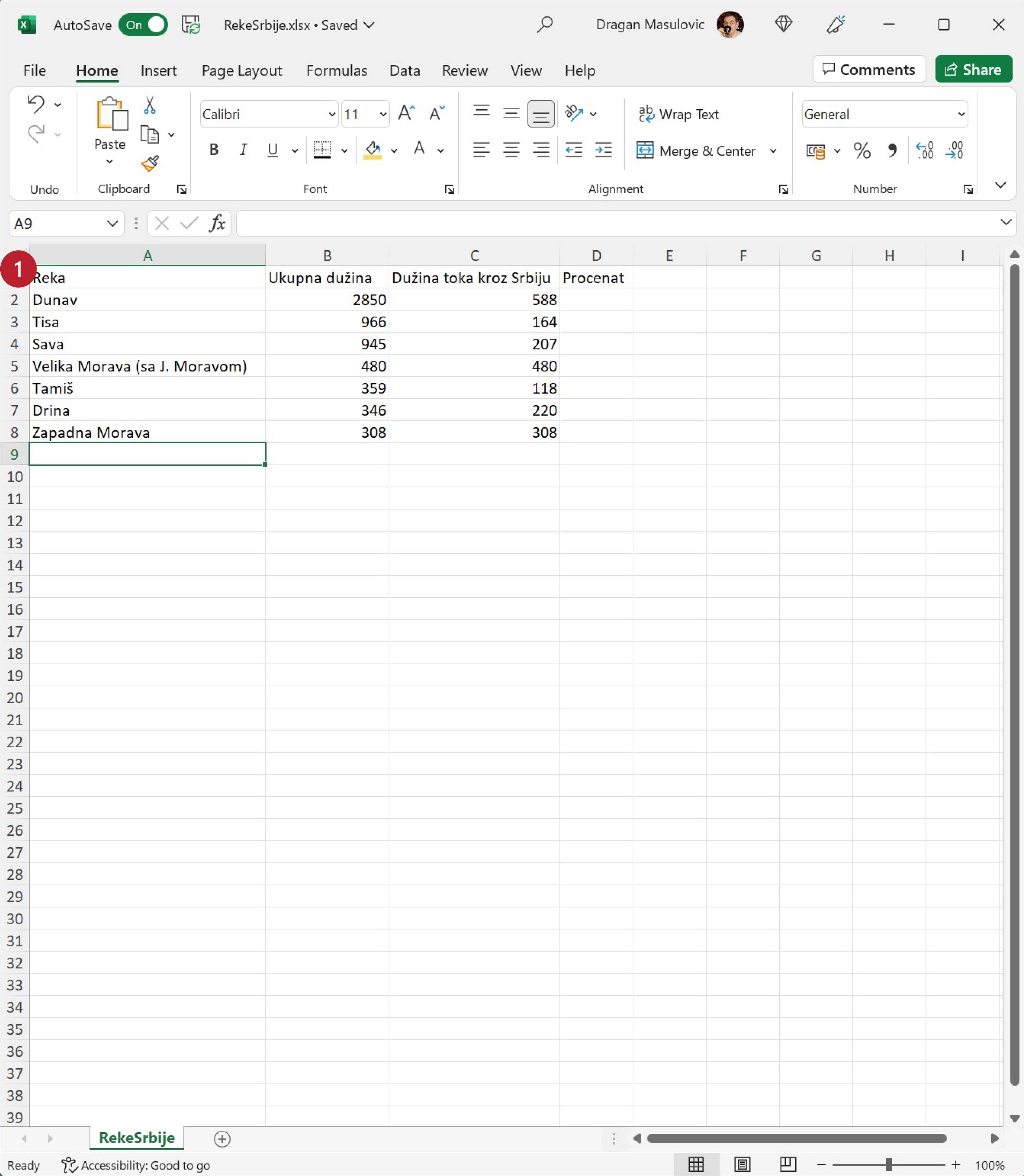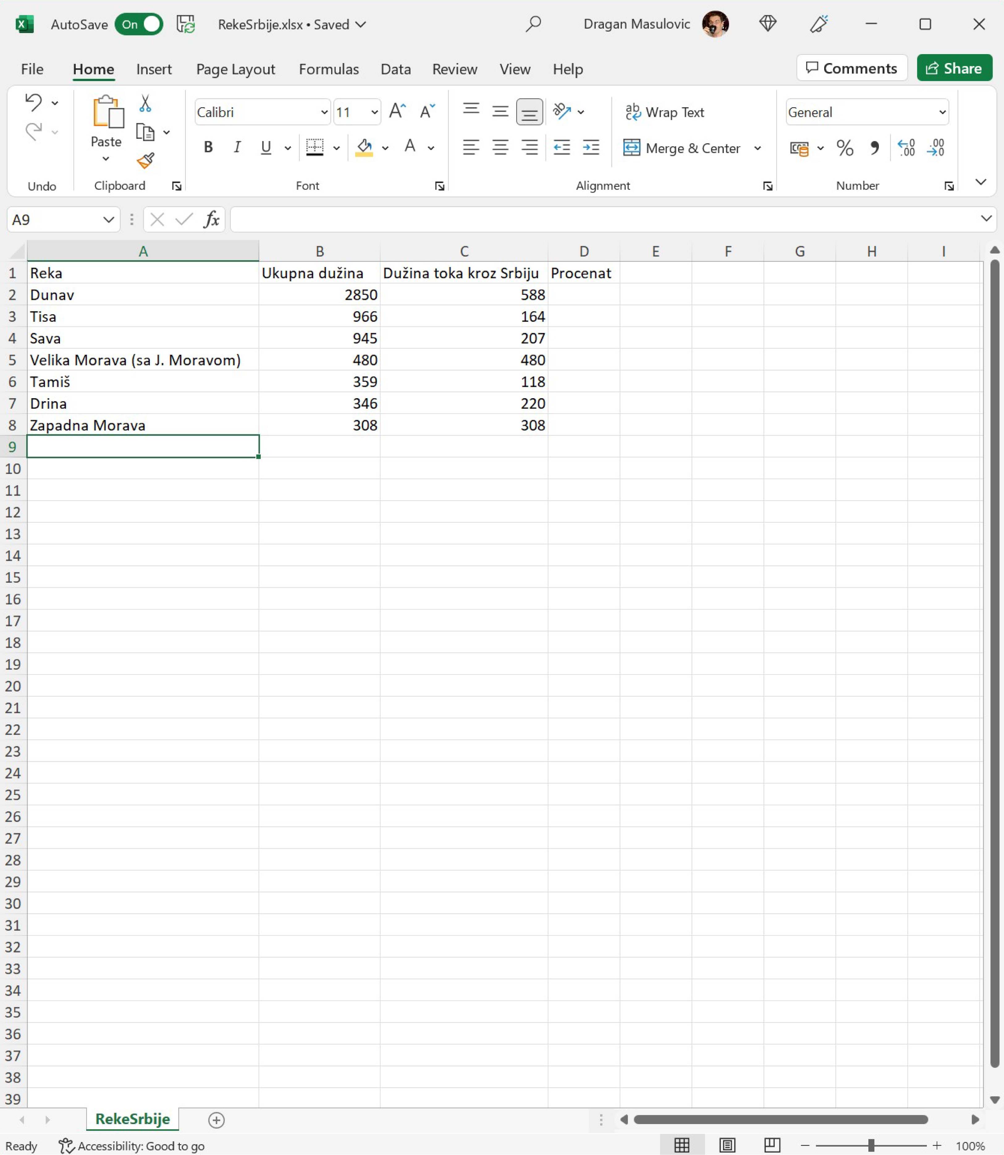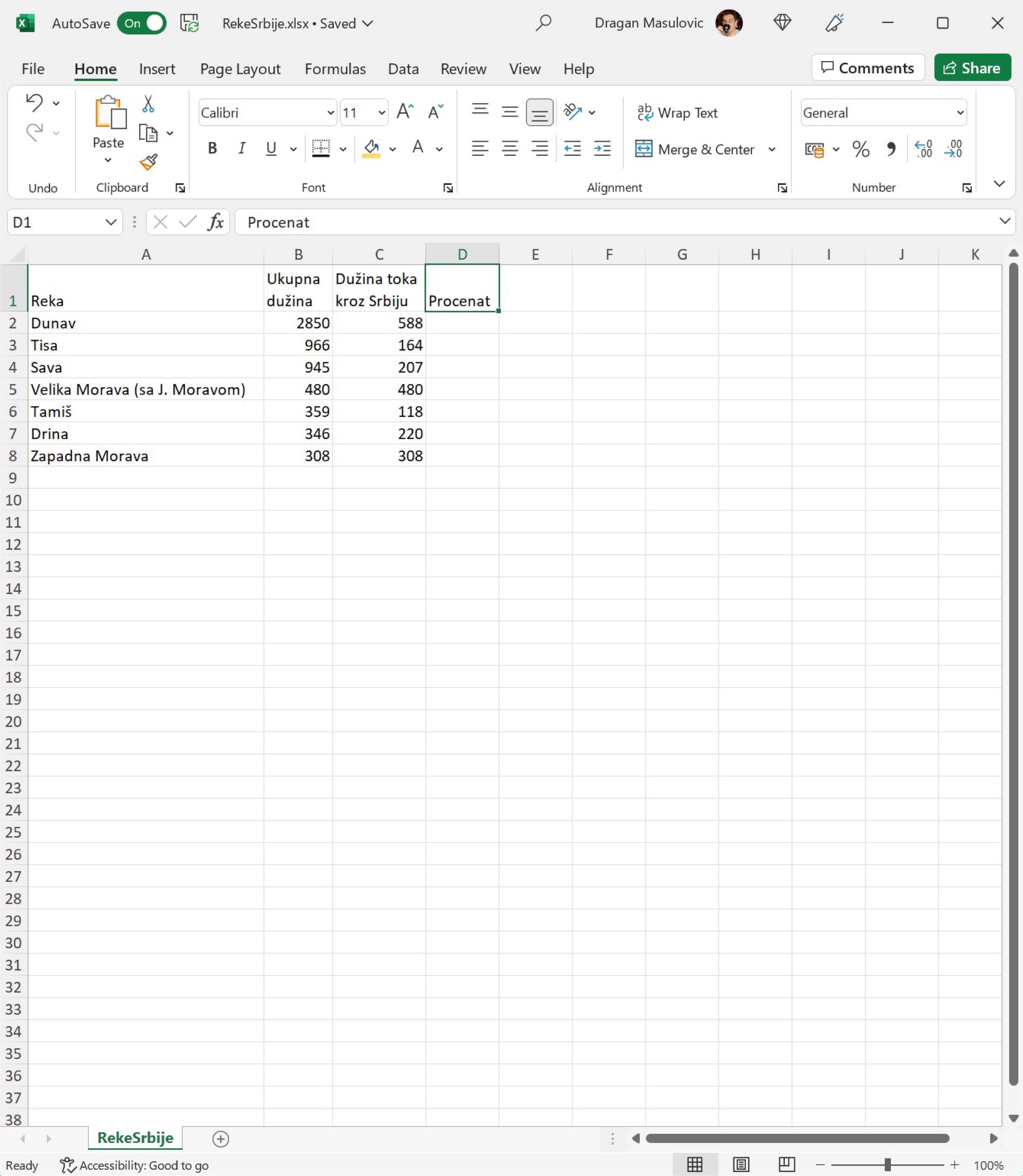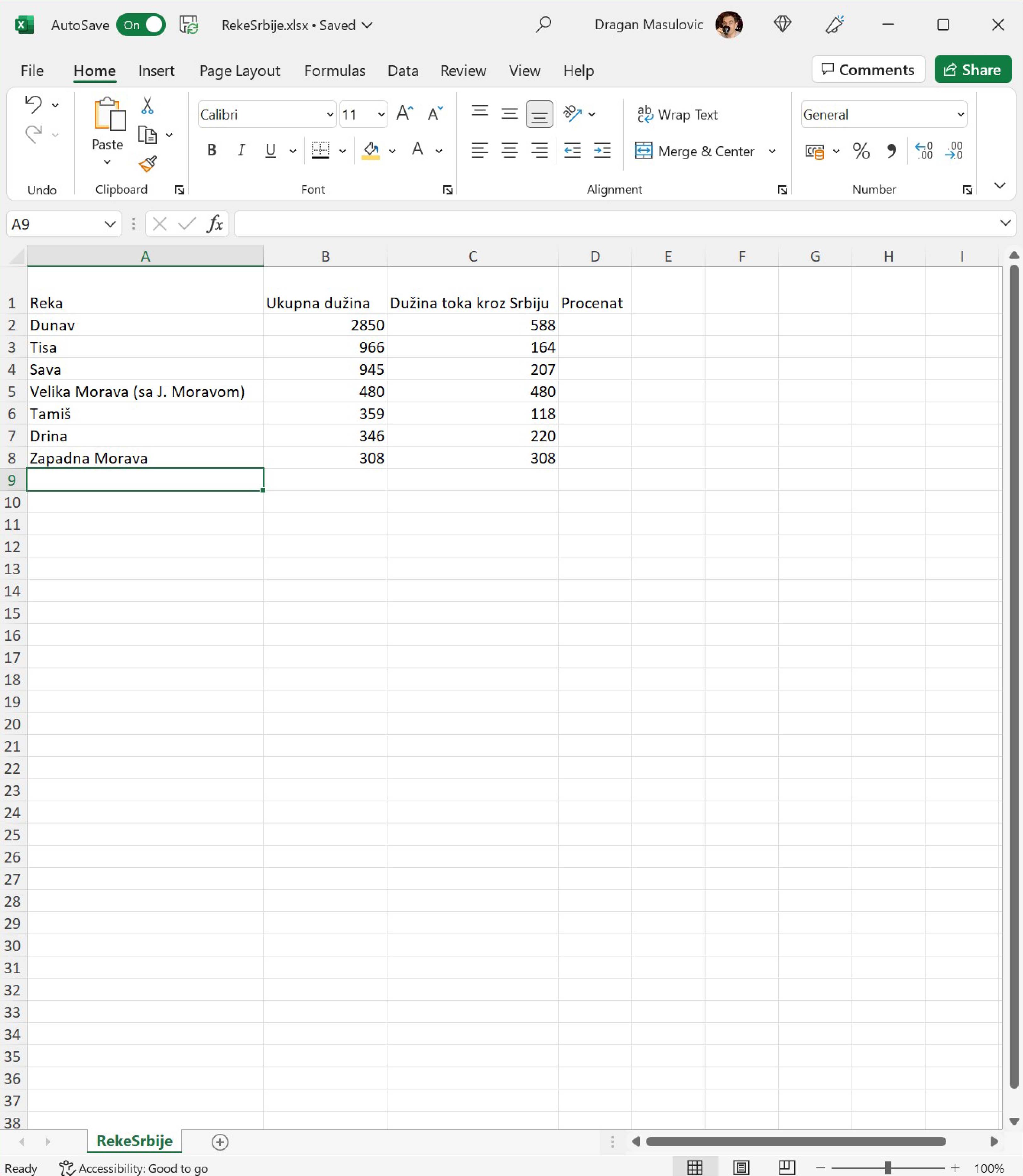 Са следећег линка RekeSrbije.xlsx преузми документ RekeSrbije.xlsx која садржи податке о најдужим рекама у Србији и сними га на свој рачунар.