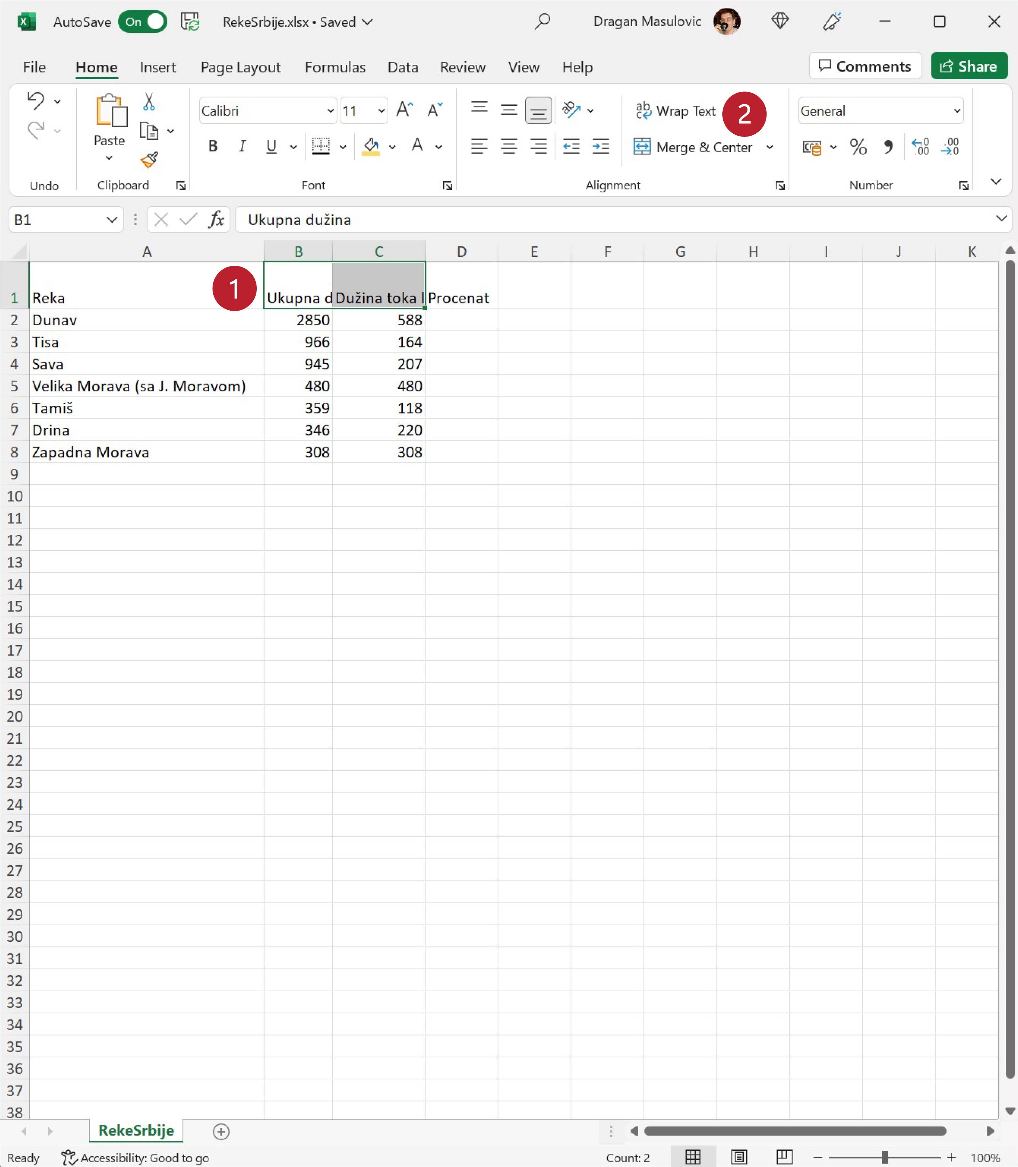 И даље се текст не види у целости: Ексел, наиме, неће сам од себе „смотати текст“ у два реда чак и када је ћелија довољно висока. Морамо му наредити да то уради. Селектуј ћелије B1 и C1, па онда кликни на икону која одговара операцији „Wrap Text“ („смотај текст“):
