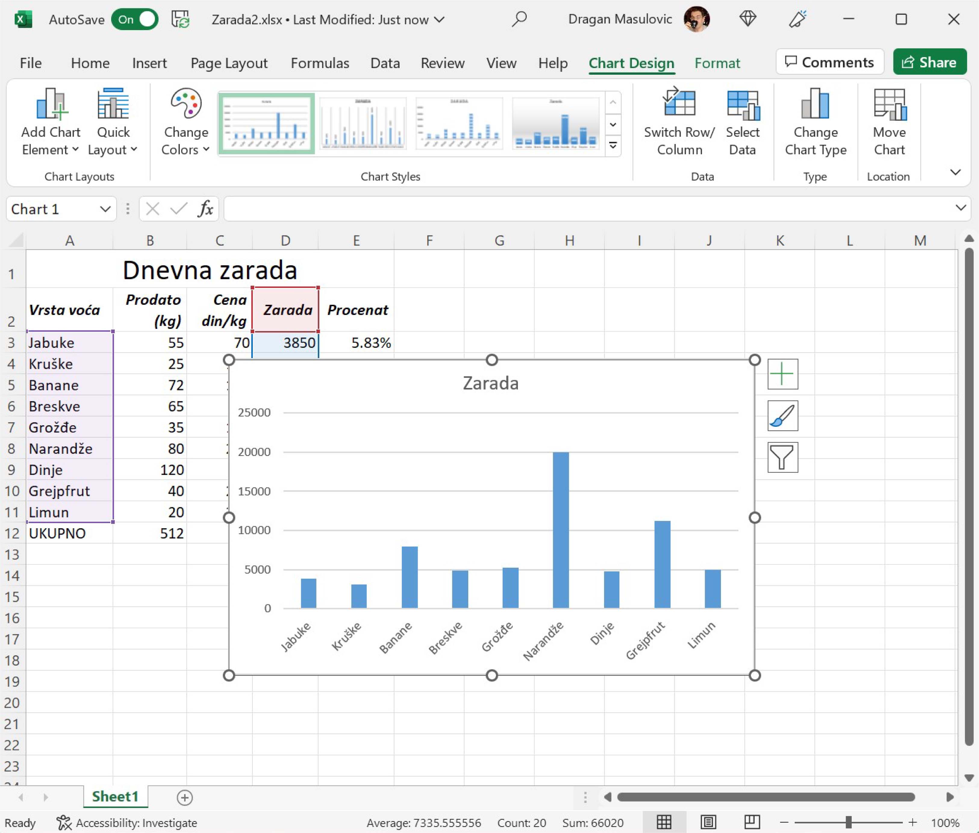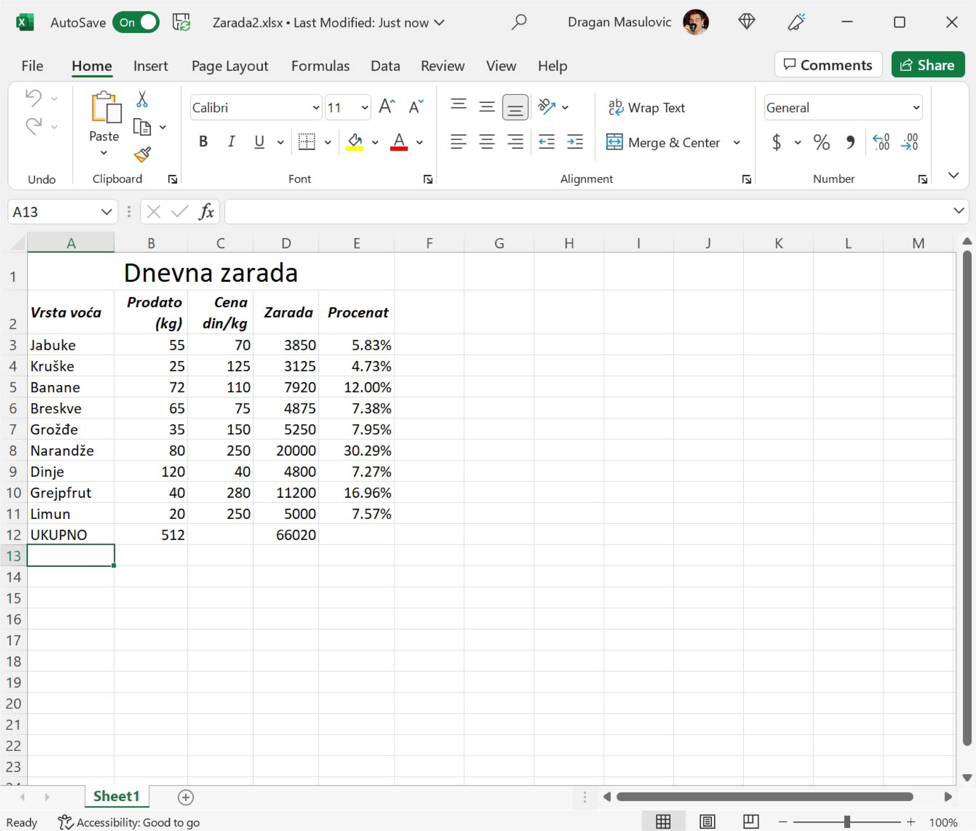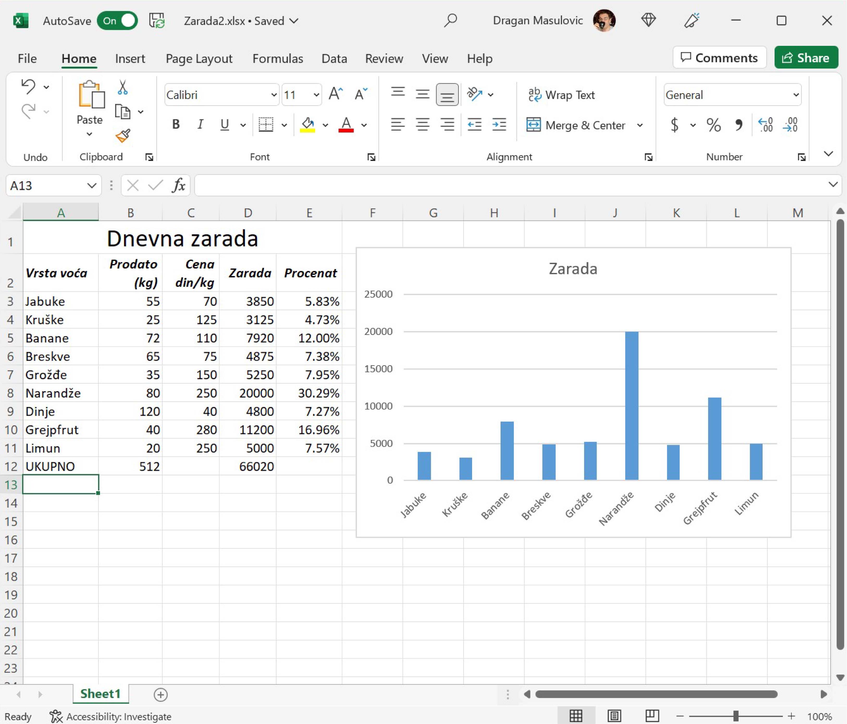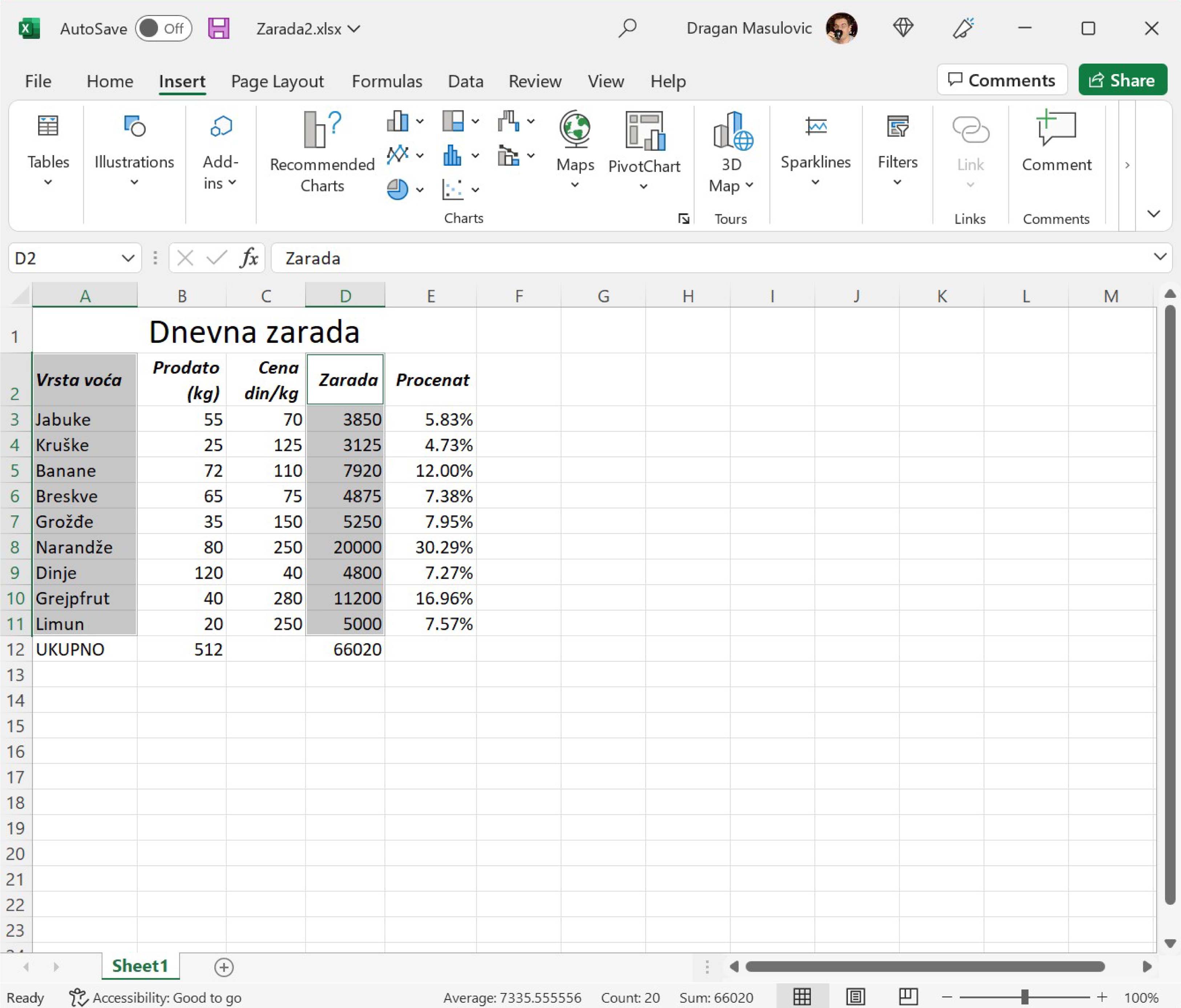 Табела садржи податке о продаји воћа и оствареној заради:
