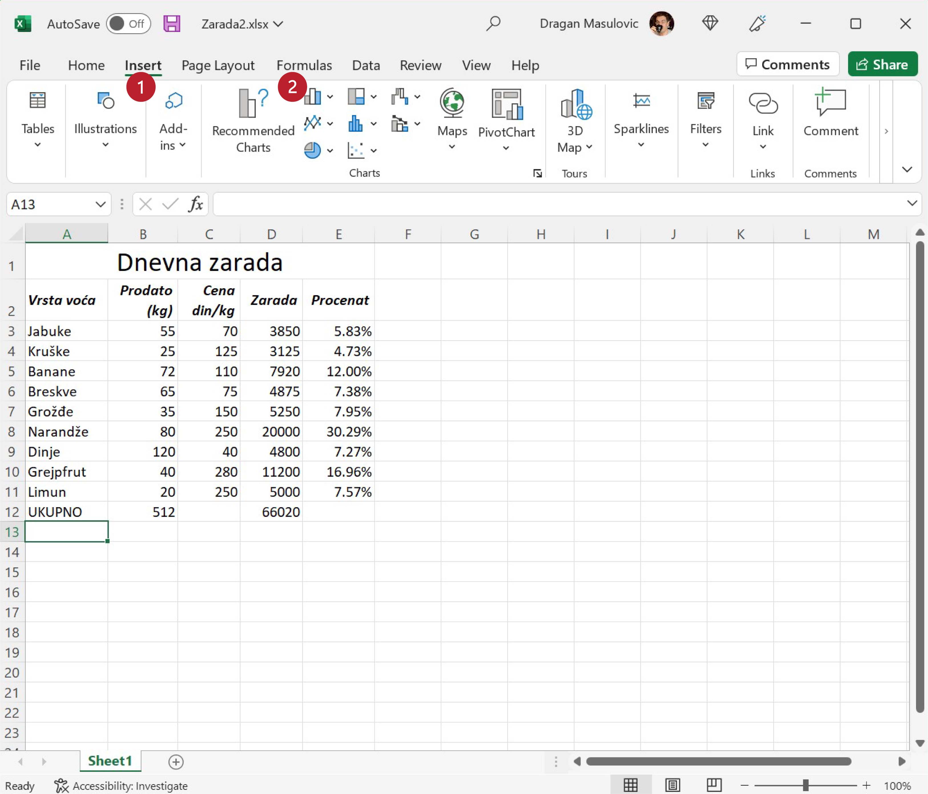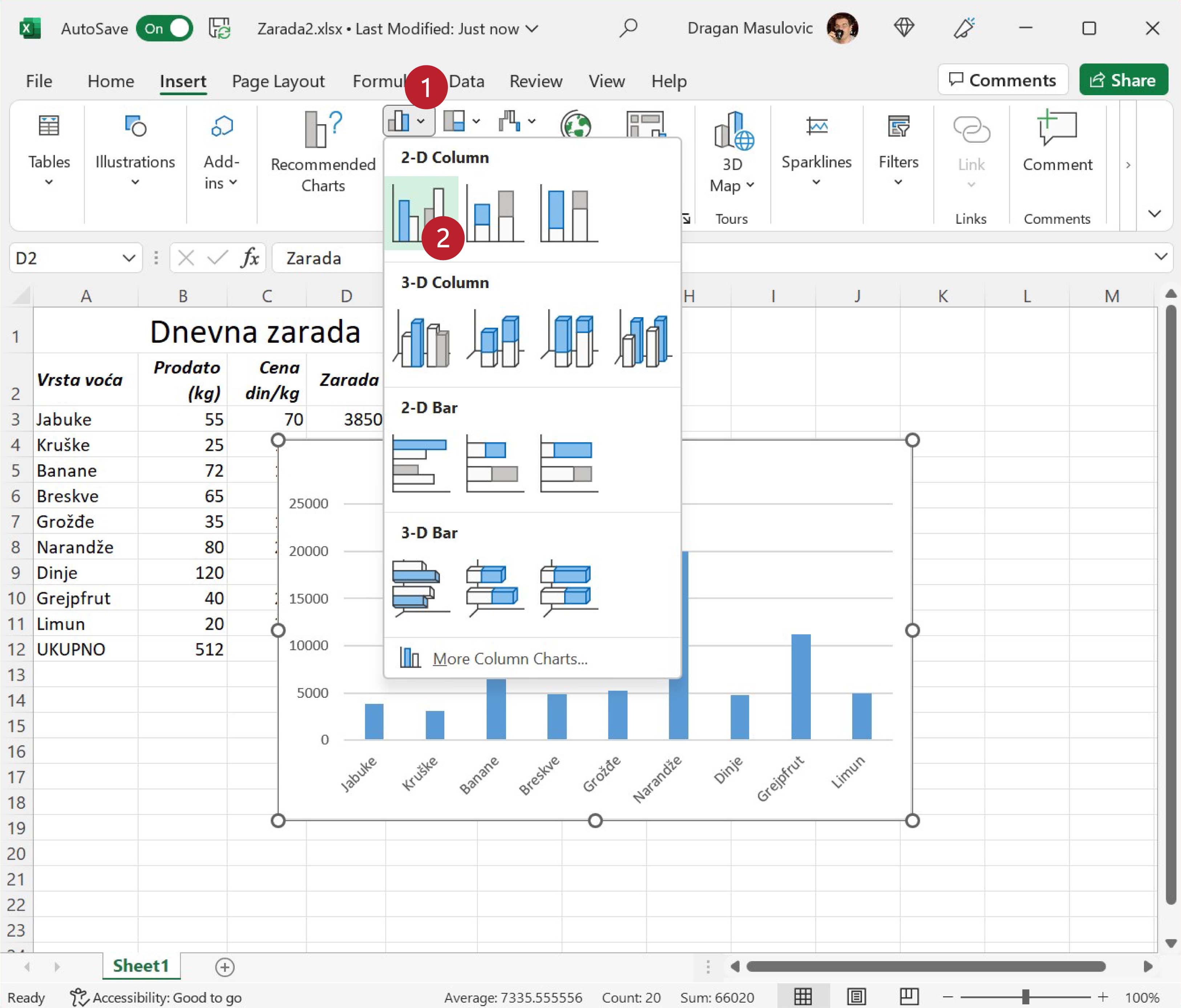Желимо да илуструјемо зараду и да визуелизујемо допринос сваке врсте продатог воћа заради. Пређи на командну траку „Insert“ (1) и уочи (немој још ништа да кликнеш!) опцију (2) која црта хистограме (зову се још и стубичасти дијаграми, а на енглеском column charts или bar charts):