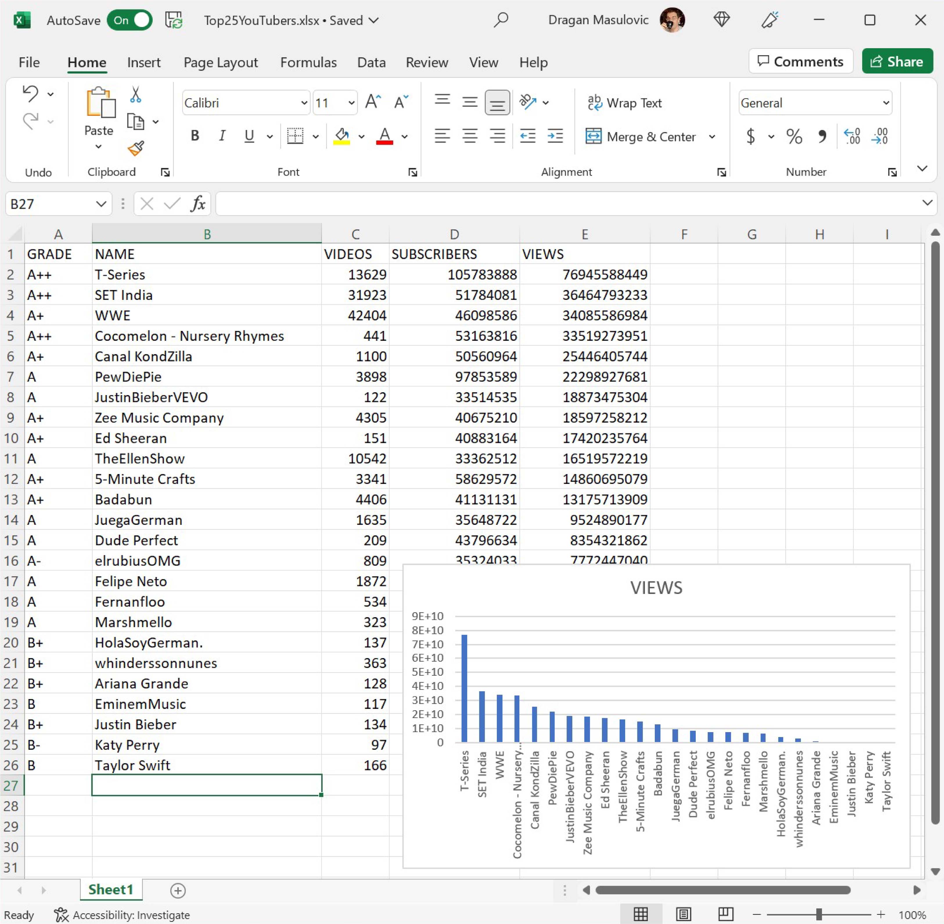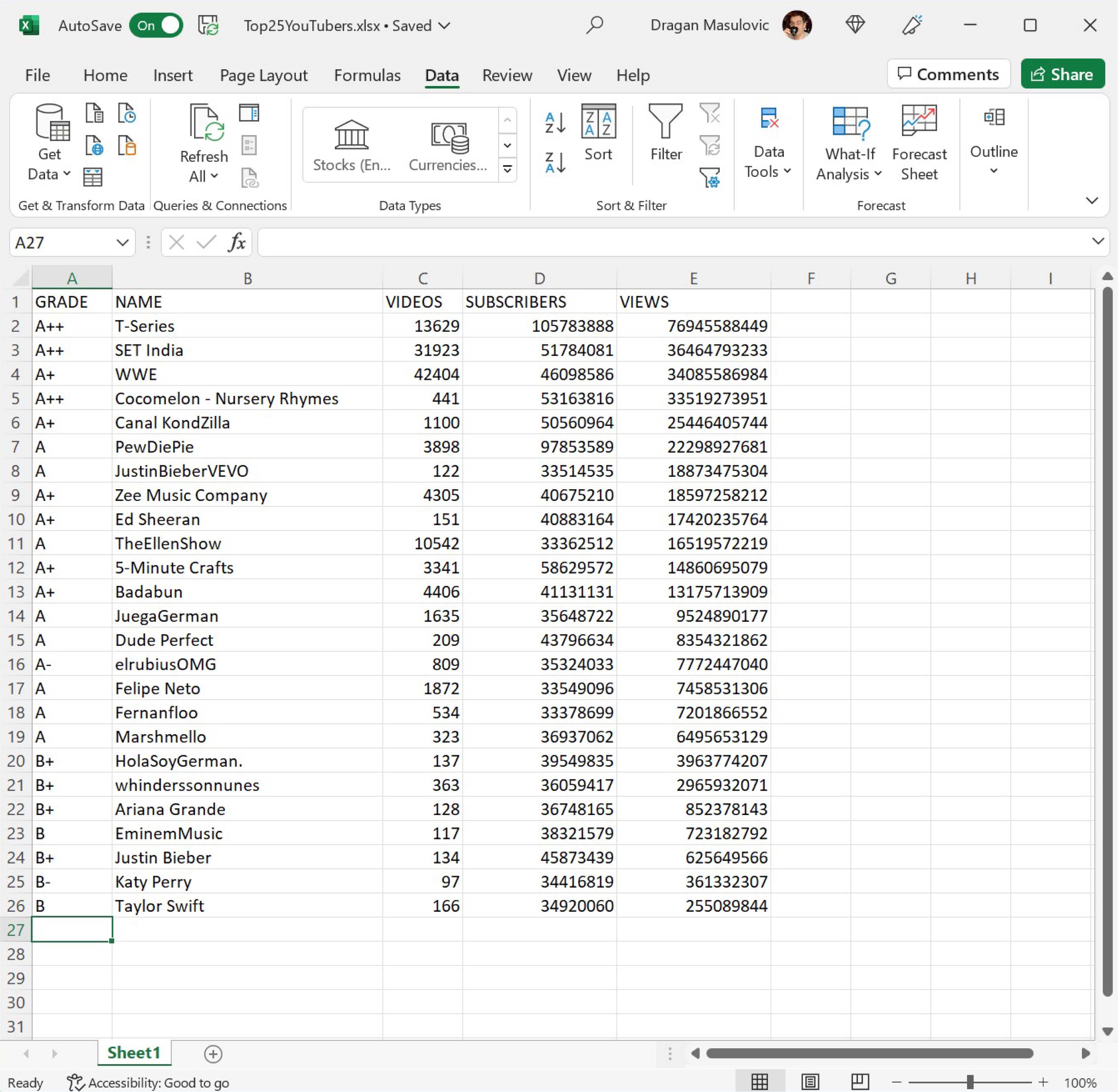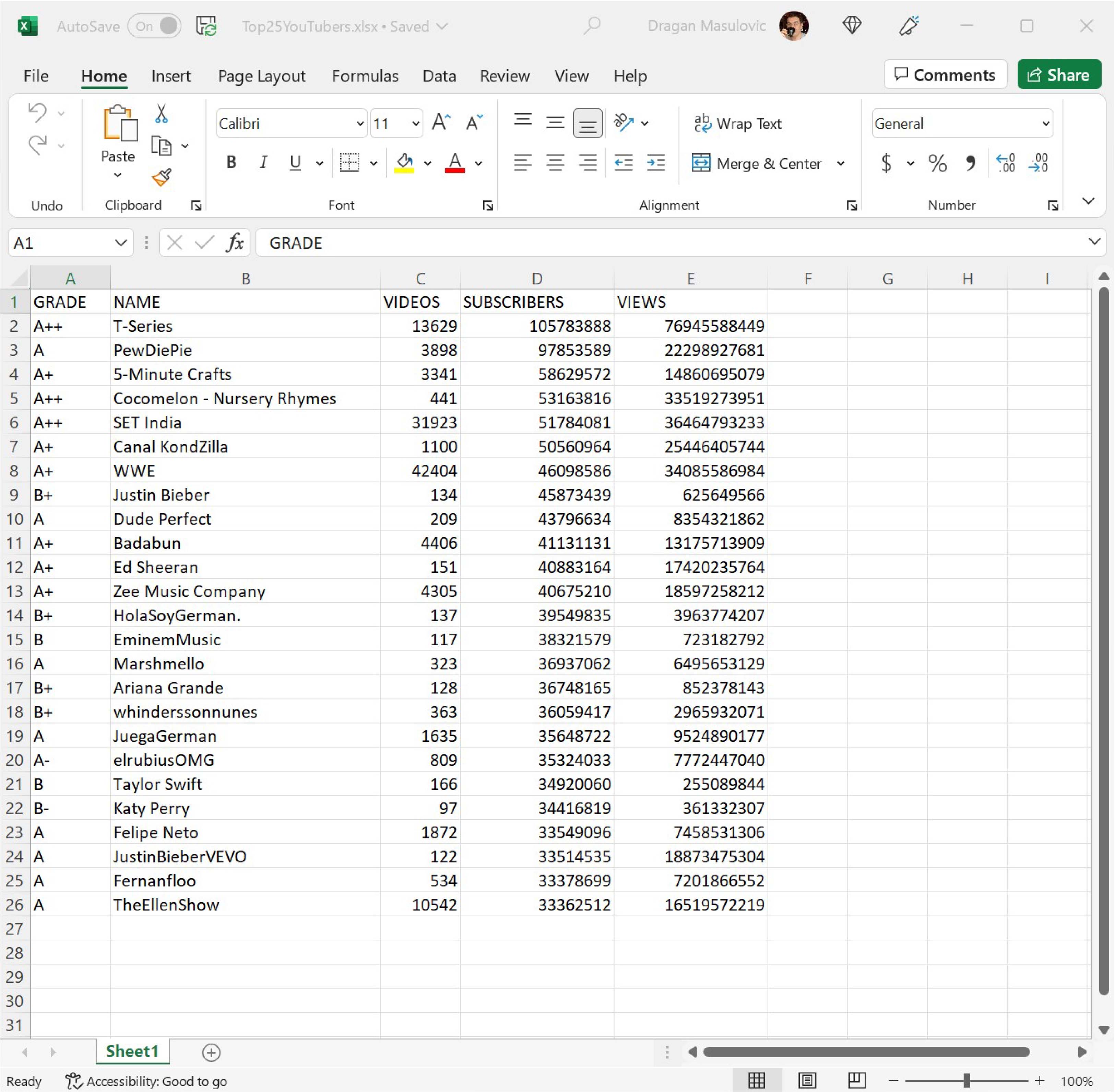 Са следећег линка преузми документ Top25YouTubers.xlsx и сними га на свој рачунар: