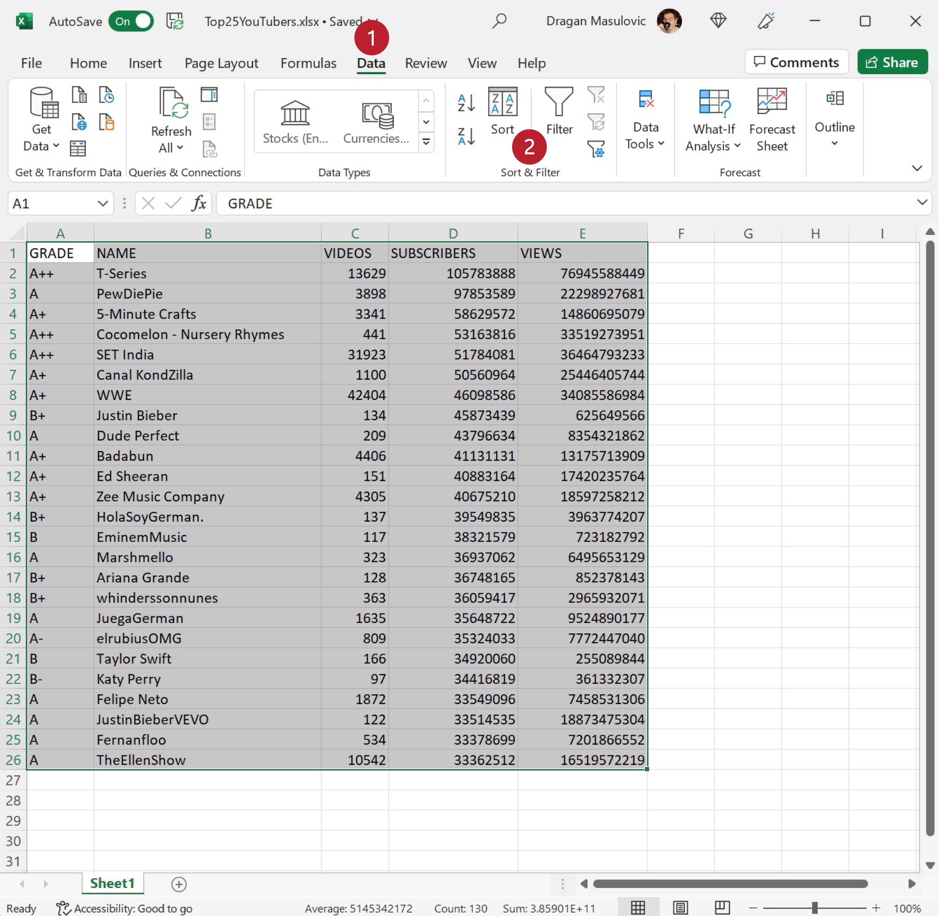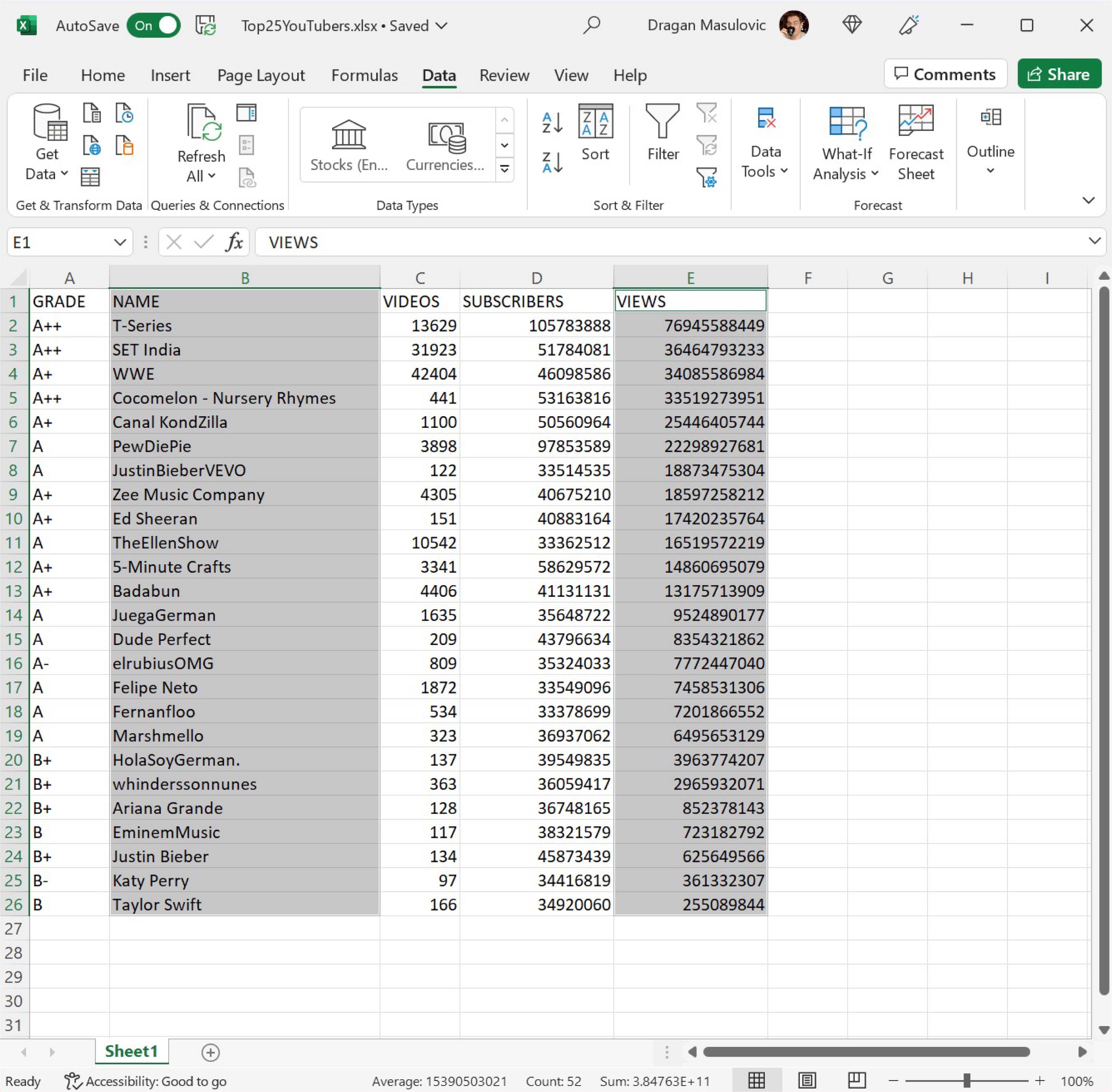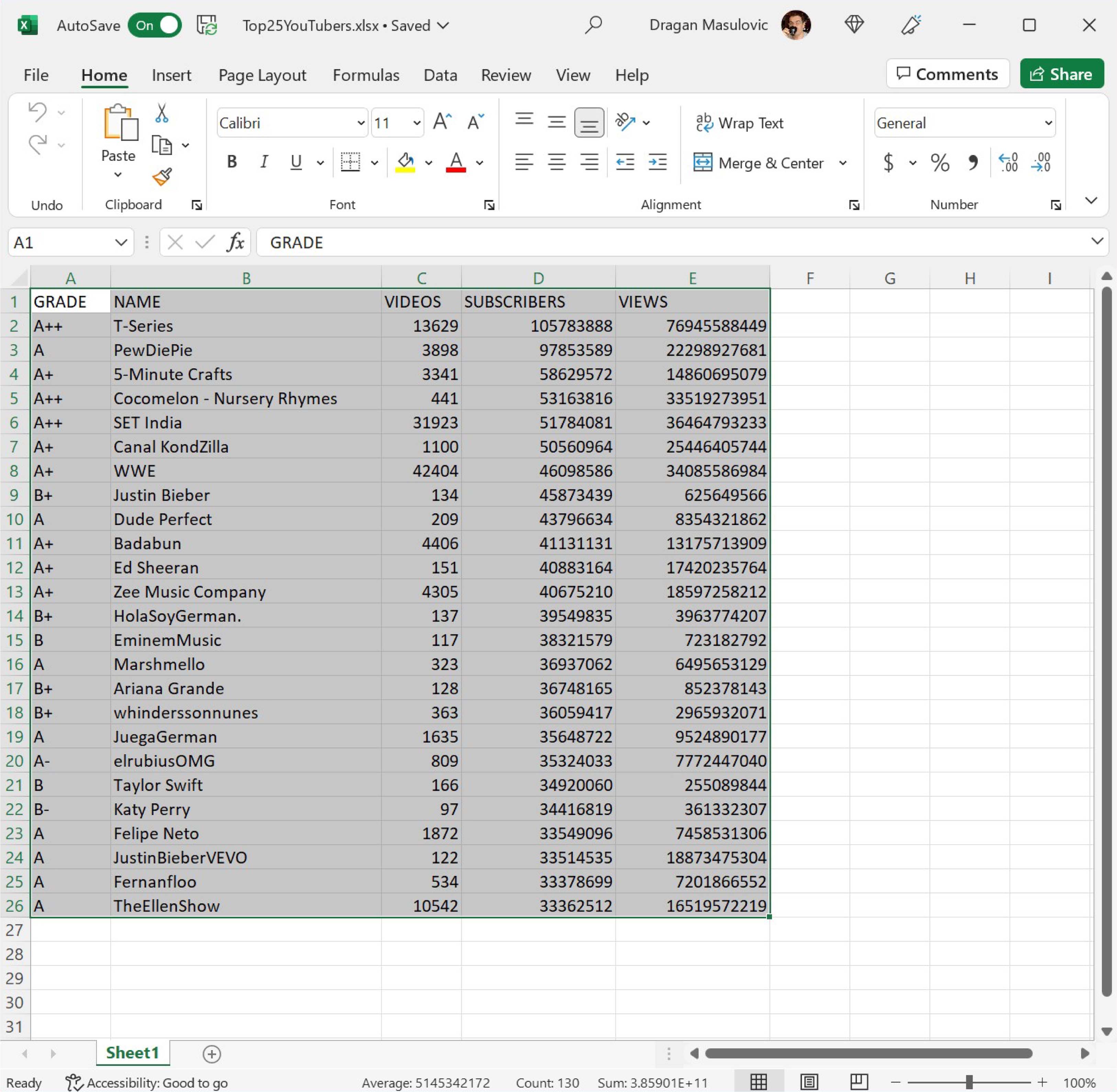 Са следећег линка преузми документ Top25YouTubers.xlsx и сними га на свој рачунар: