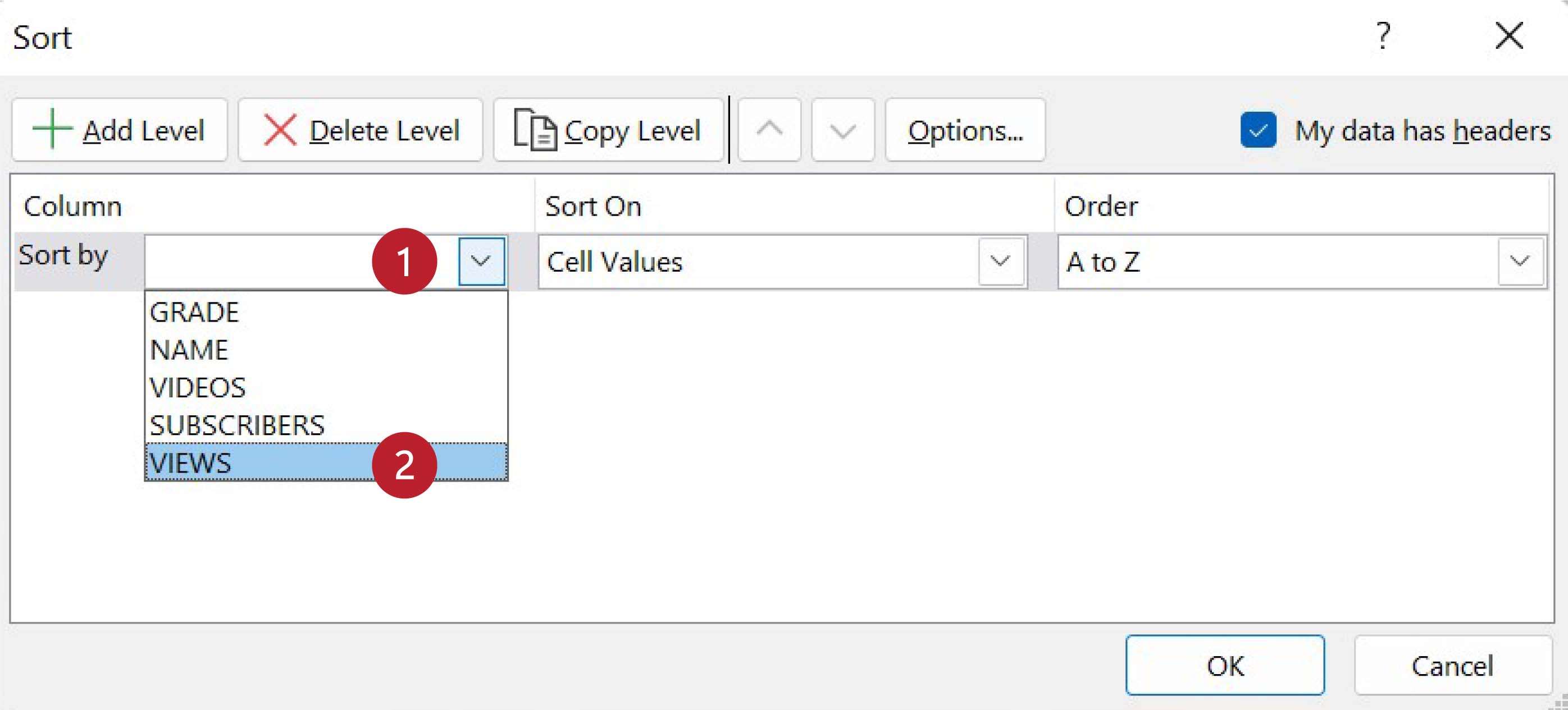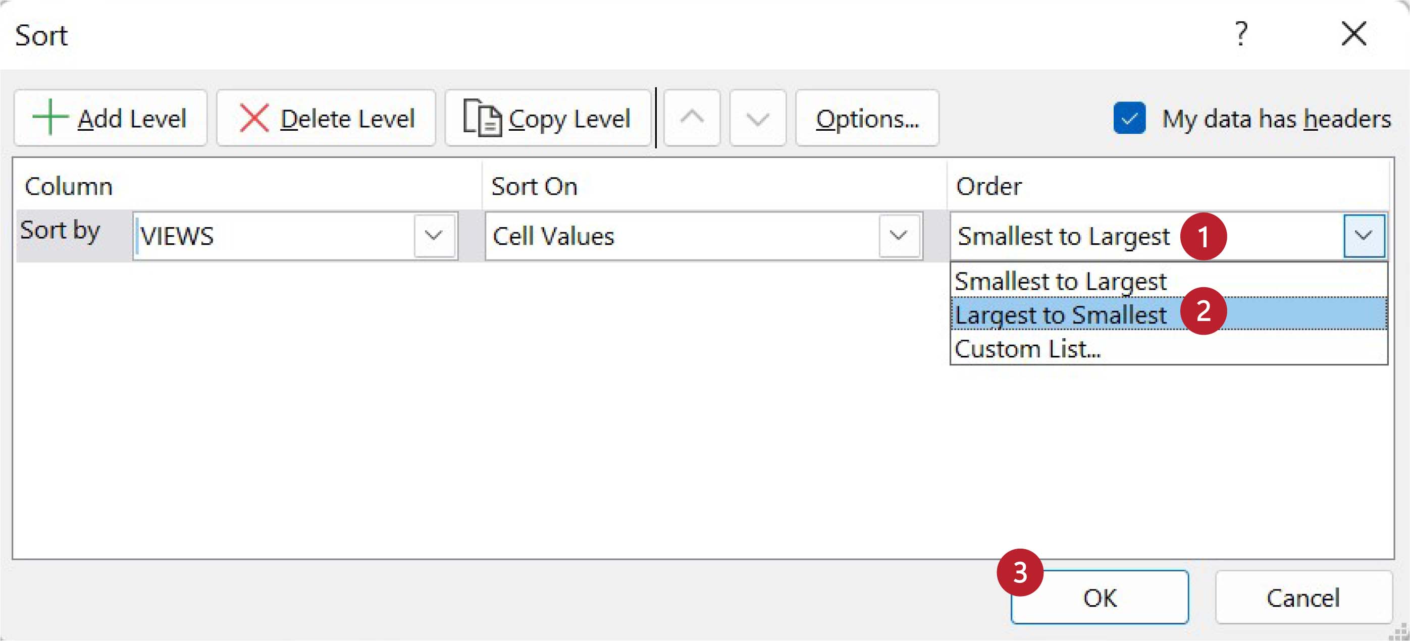 Потом у одељку „Order“ („редослед“) кликни на стрелицу (1), па у листи која се појавила одабери „Largest to Smallest“ (2) јер желимо да сортирамо табелу од већих ка мањим вредностима. (Да смо којим случајем правили „листу срама“, одабрали бисмо опцију „Smallest to Largest“ која би наложила Екселу да сортира табелу од канала са најмање прегледа до канала са највише прегледа.) Онда кликни на „OK“ (3):