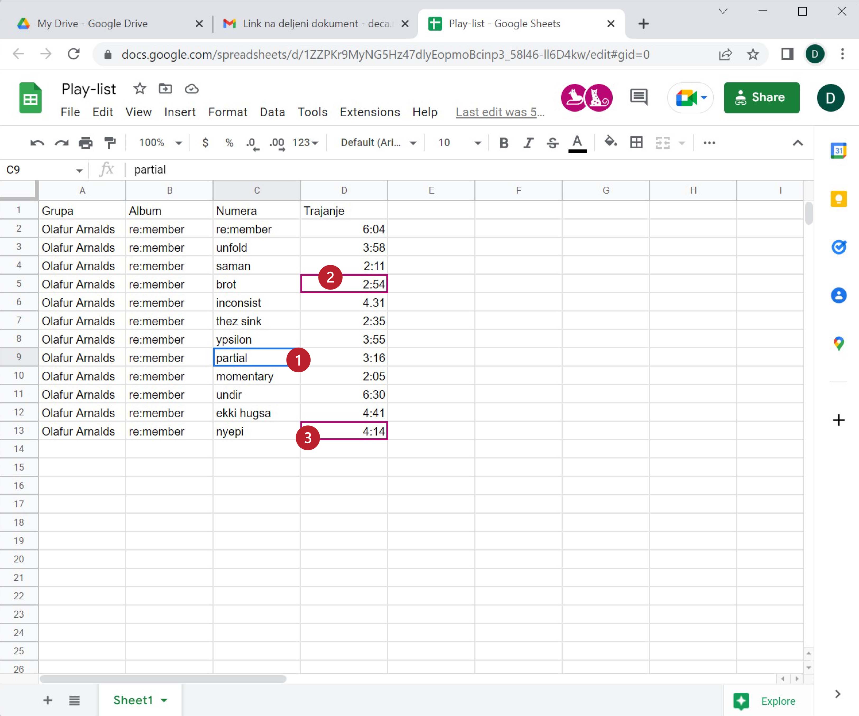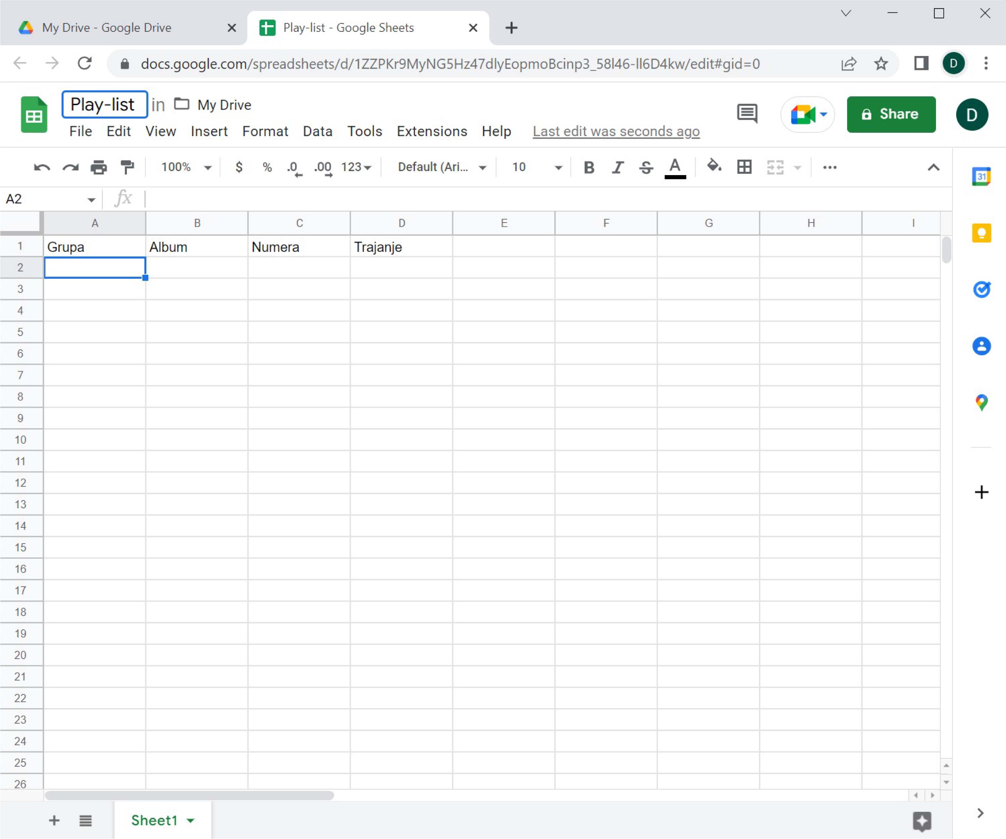 Као пример сарадње направићемо плеј-листу која има следеће колоне:
